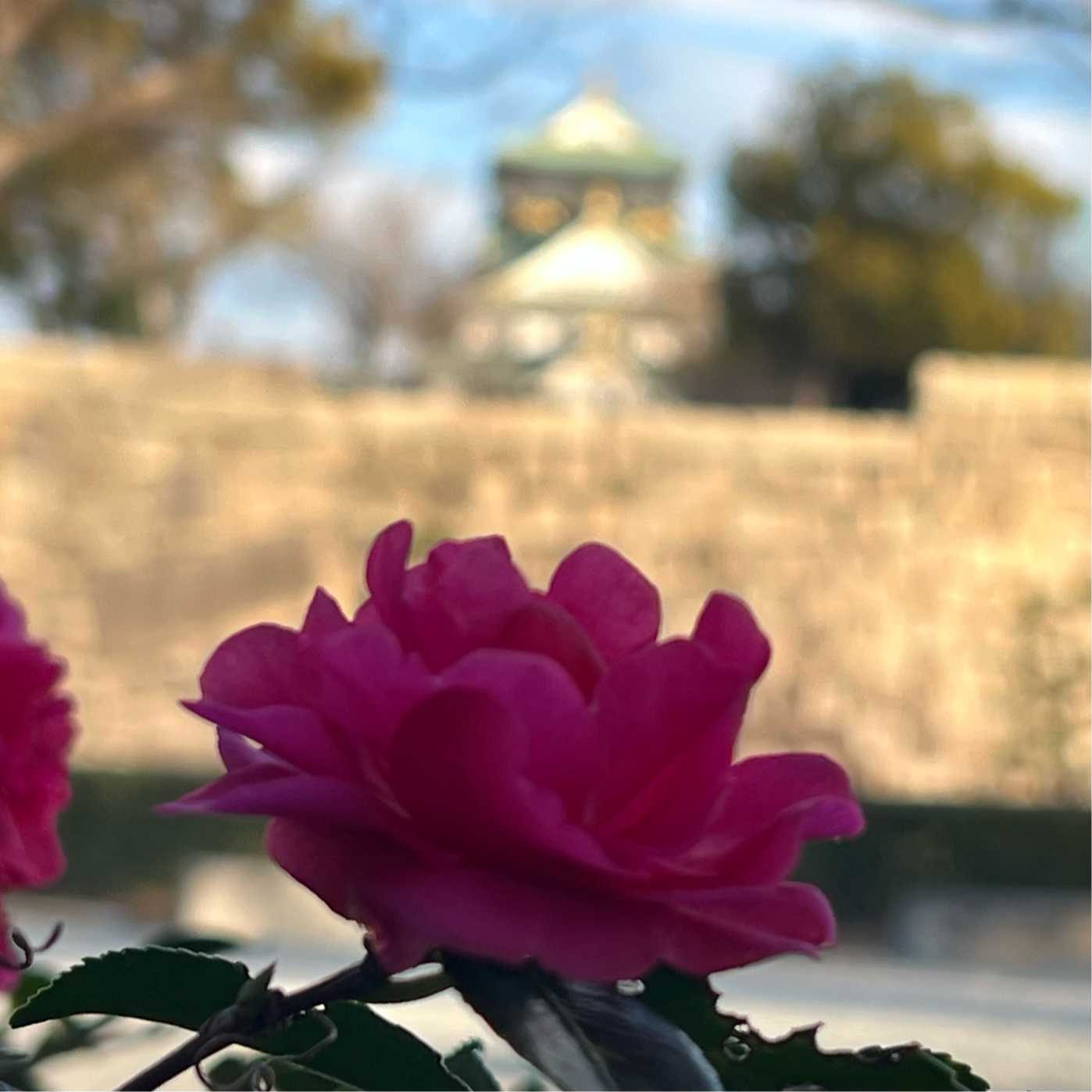 十月桜 & 朝日で眩しい天守