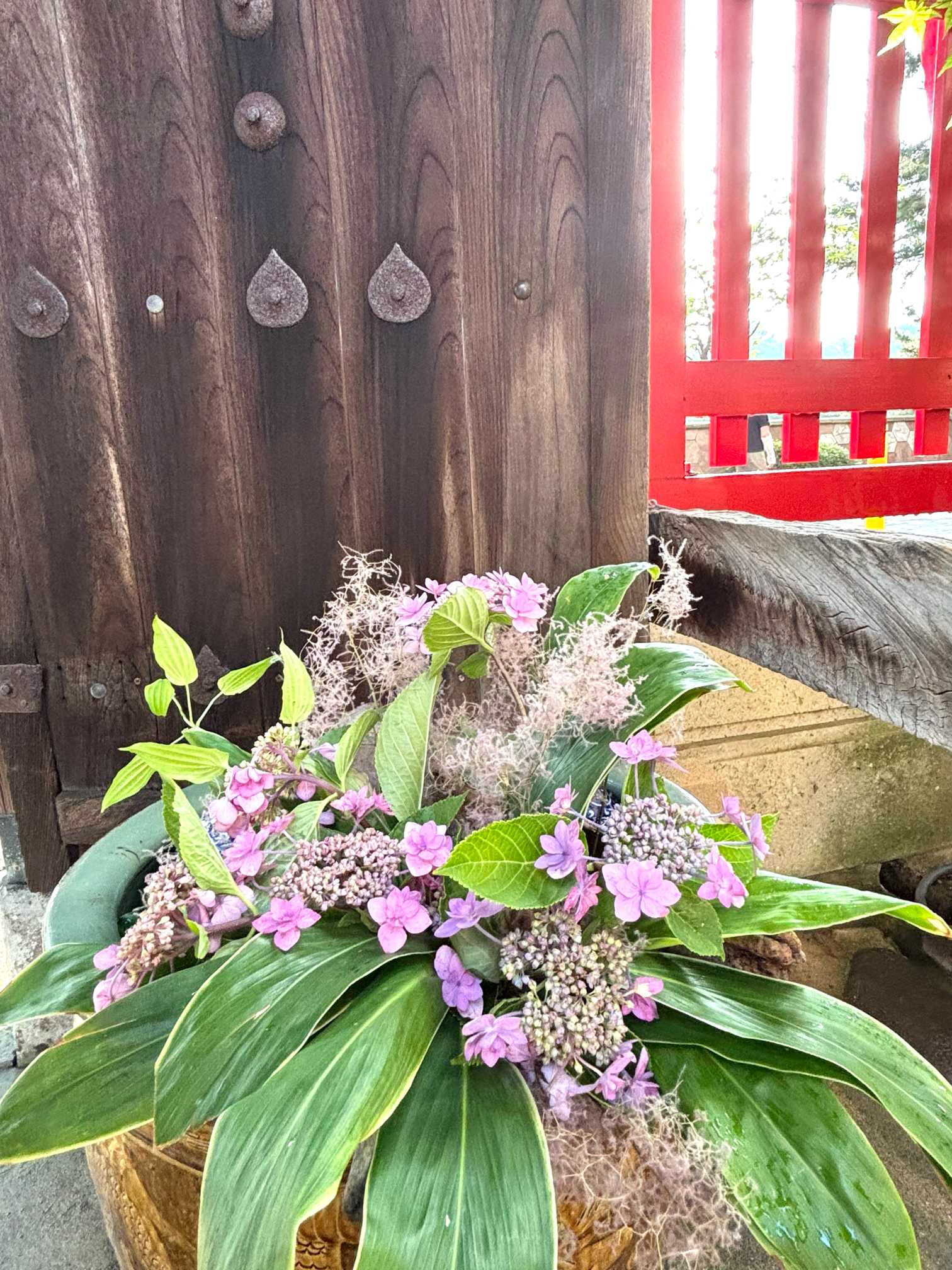 朱塗りの透し塀と紫陽花