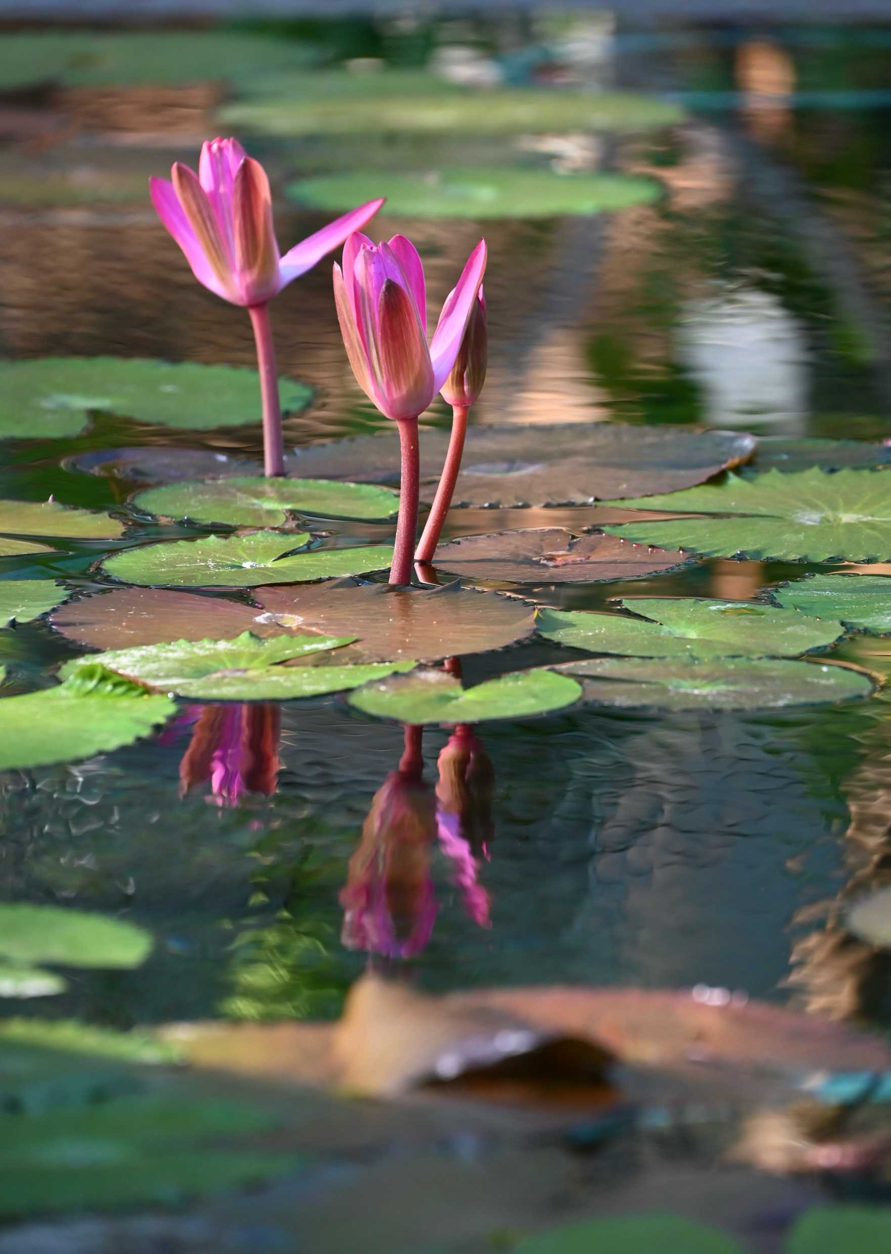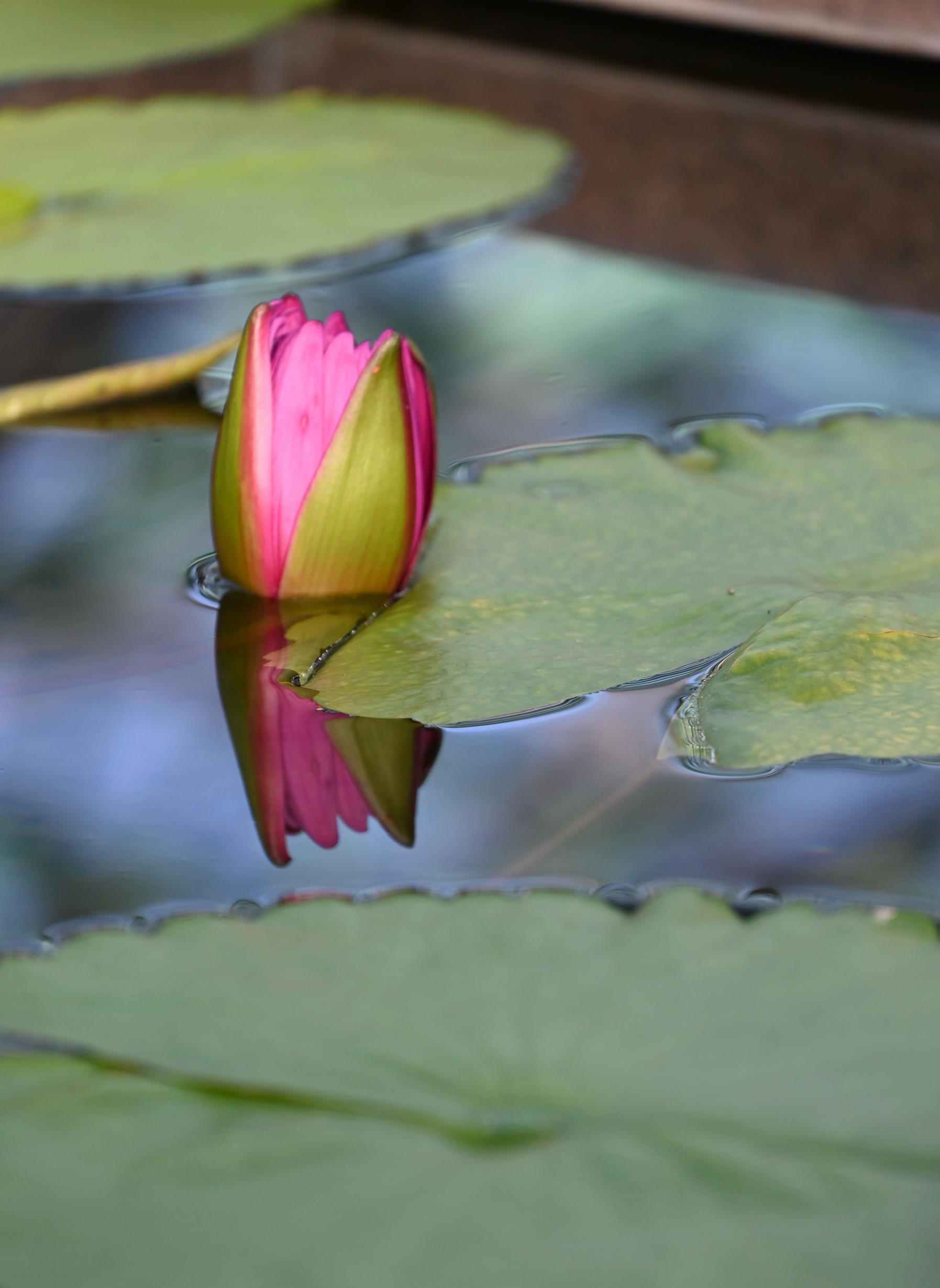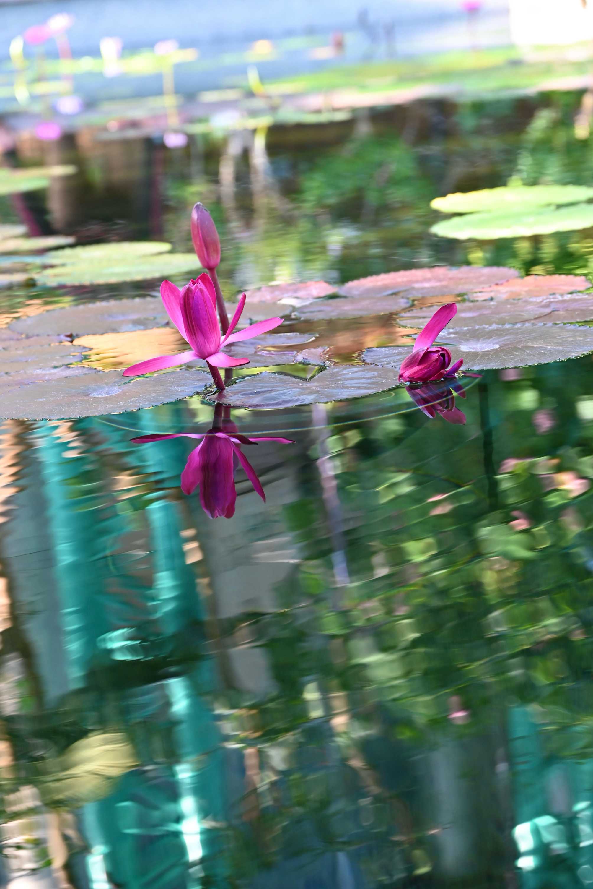 ✨️鮮やかな濃いピンク色のスイレンも綺麗です🩷💕︎施設の窓枠も映り込んでいます🪟