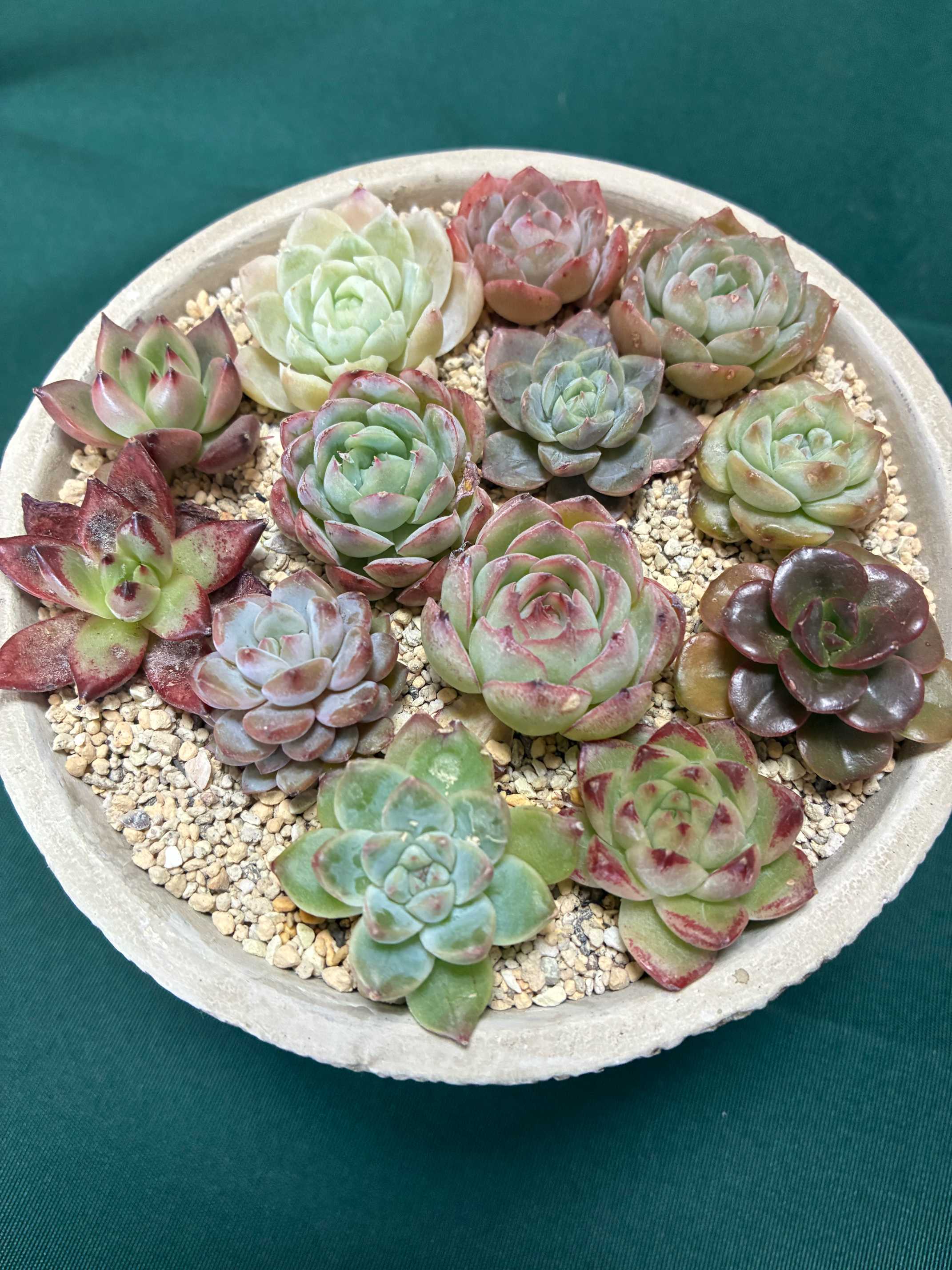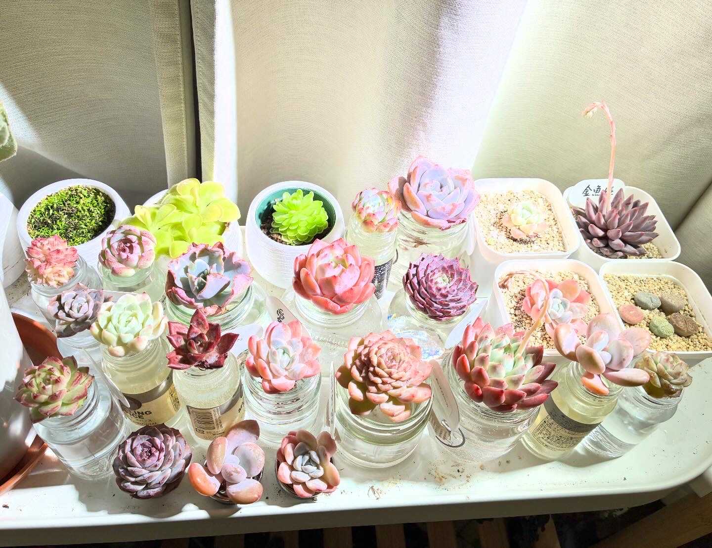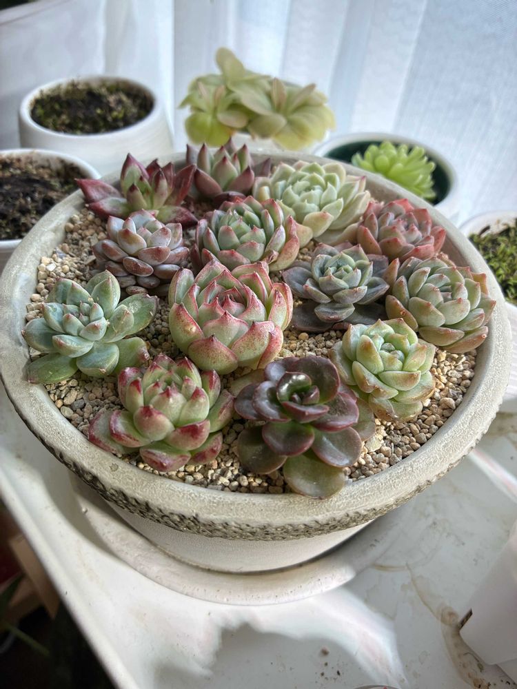 ようやく根が生えてきたので本日寄せ植え。全部で15株あったけど、中型のエケベリアはまだ根が動かず、1個は三頭だったので別管理にすることにして13個を寄せ植え。ぽんぽん置くだけだけど、もうすでに可愛い。春まで室内でライトで育てたい。26.0116