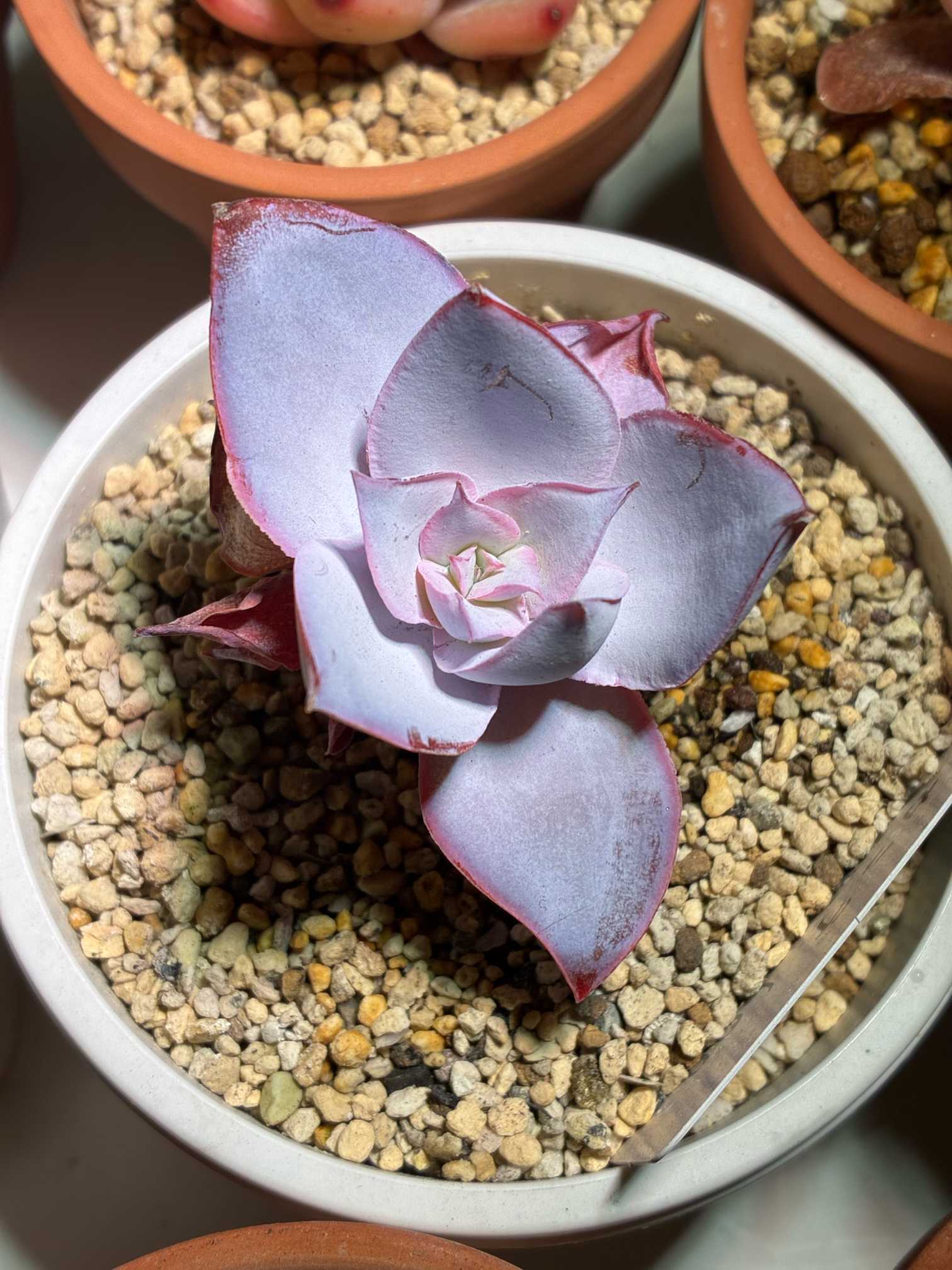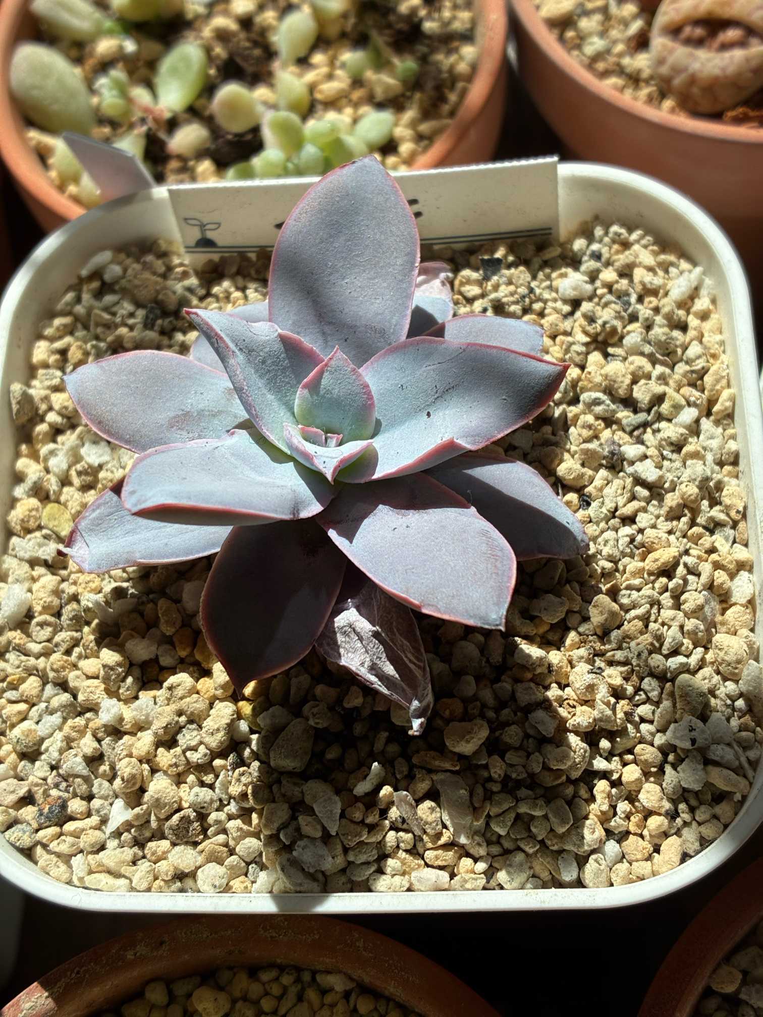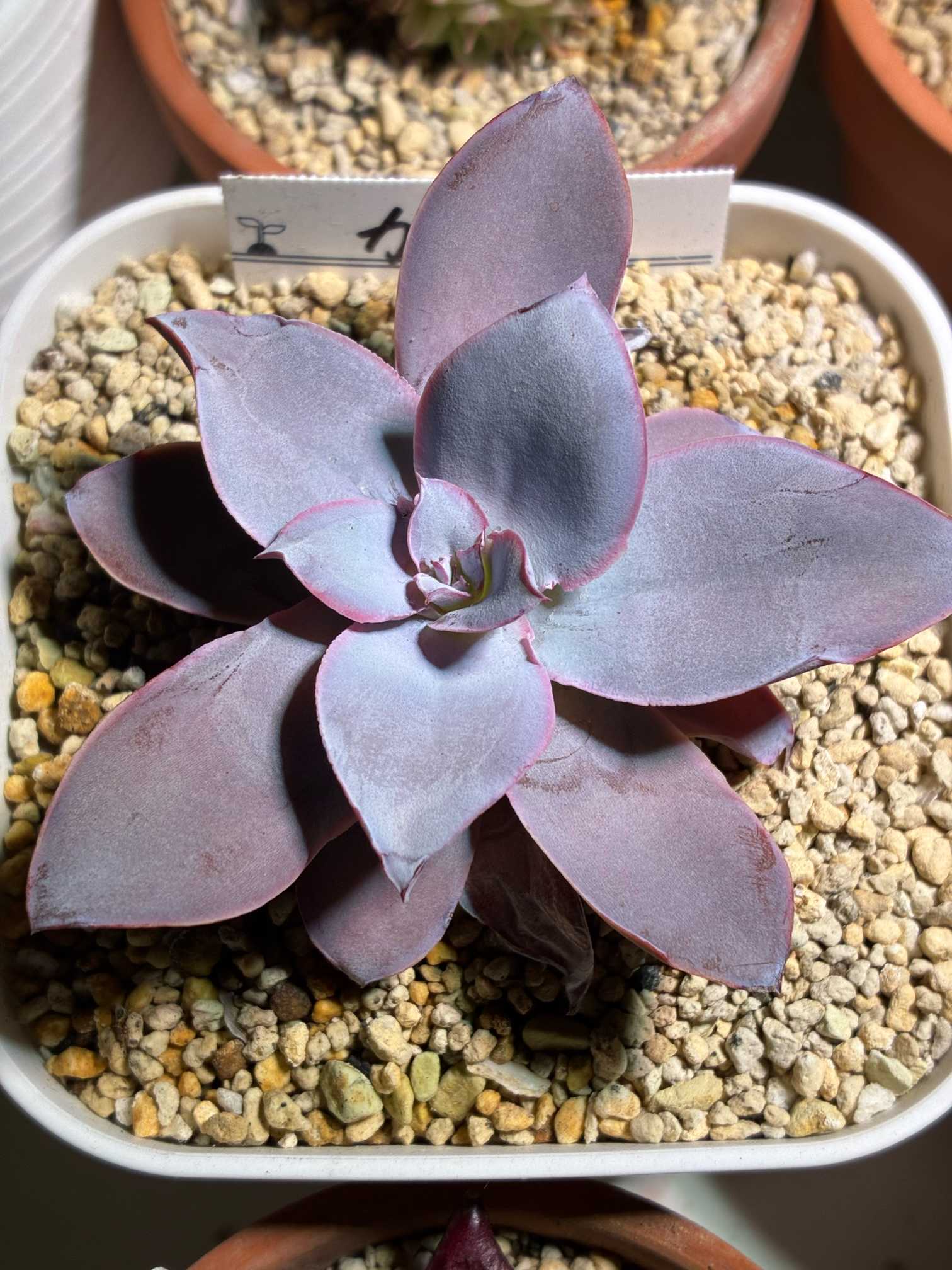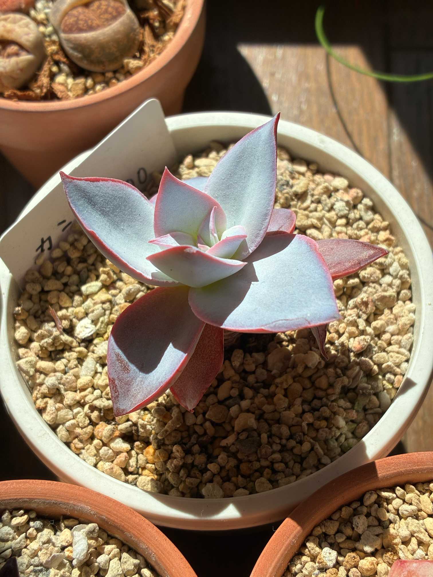 だいぶカリカリになって一回り小さくなったカンテたち。手前が保険株で秋にお迎えした三代目。奥が室内で夏を乗り切った二代目。ジュレるのをビビりすぎて水を控え過ぎた。