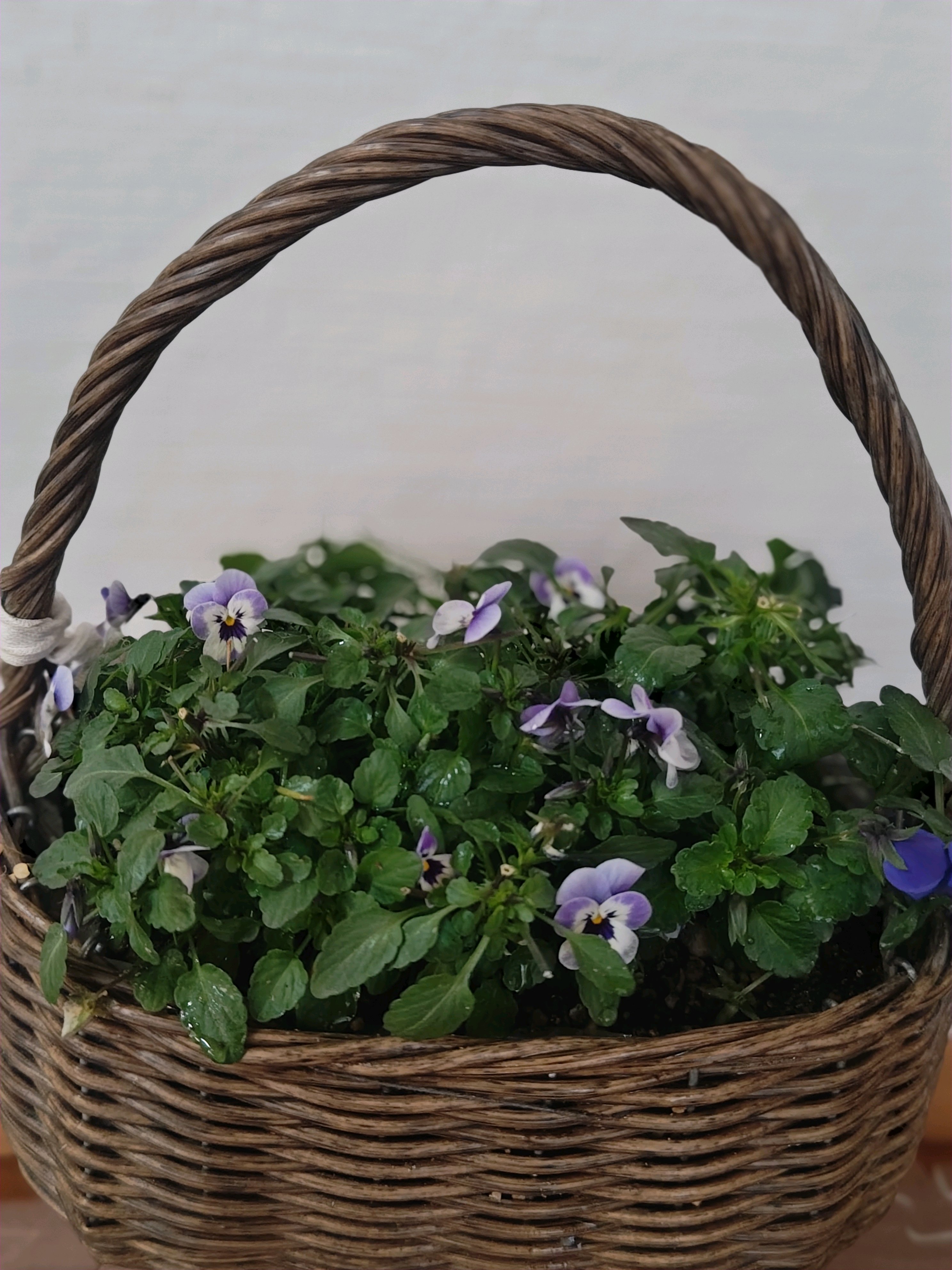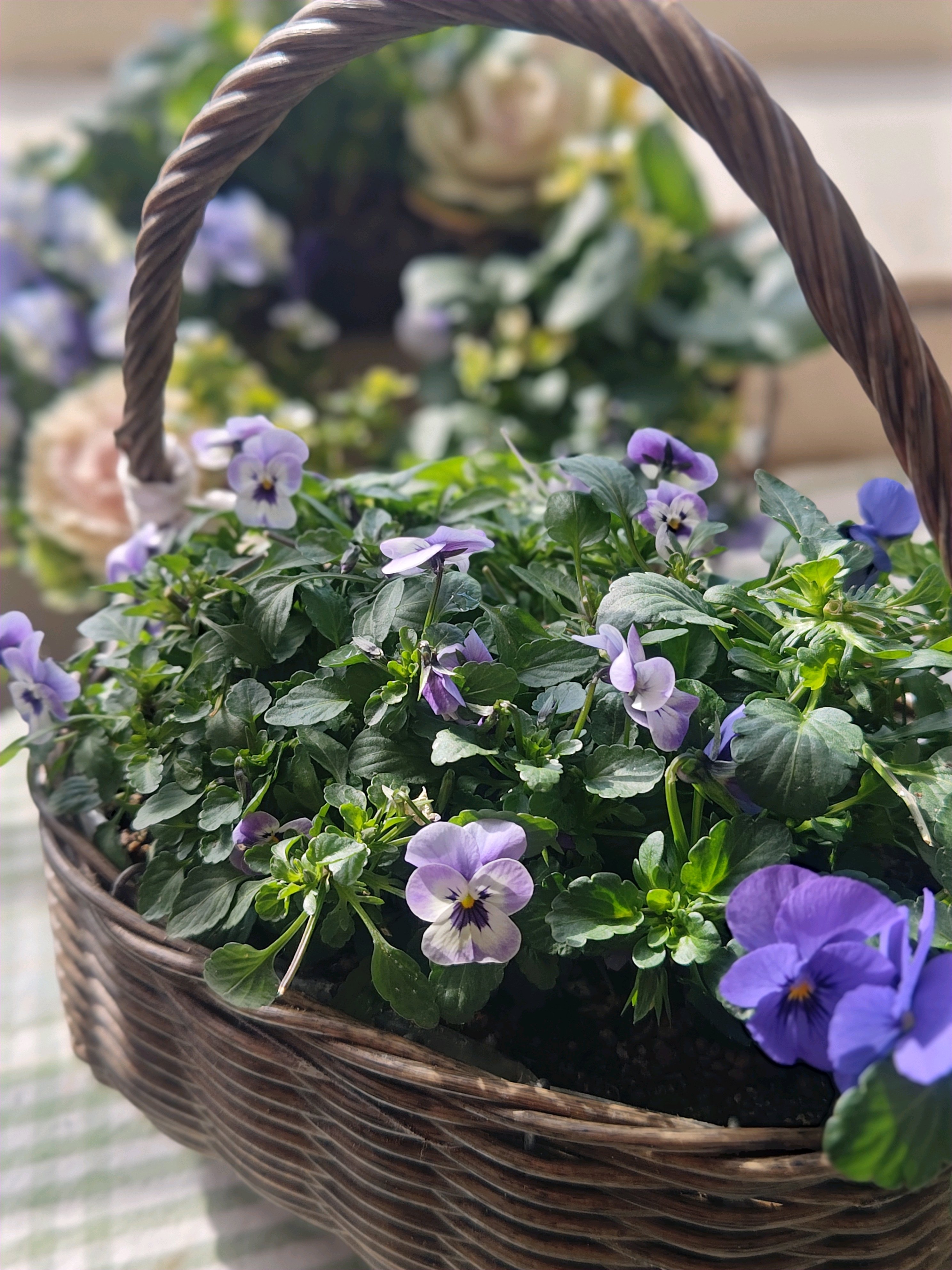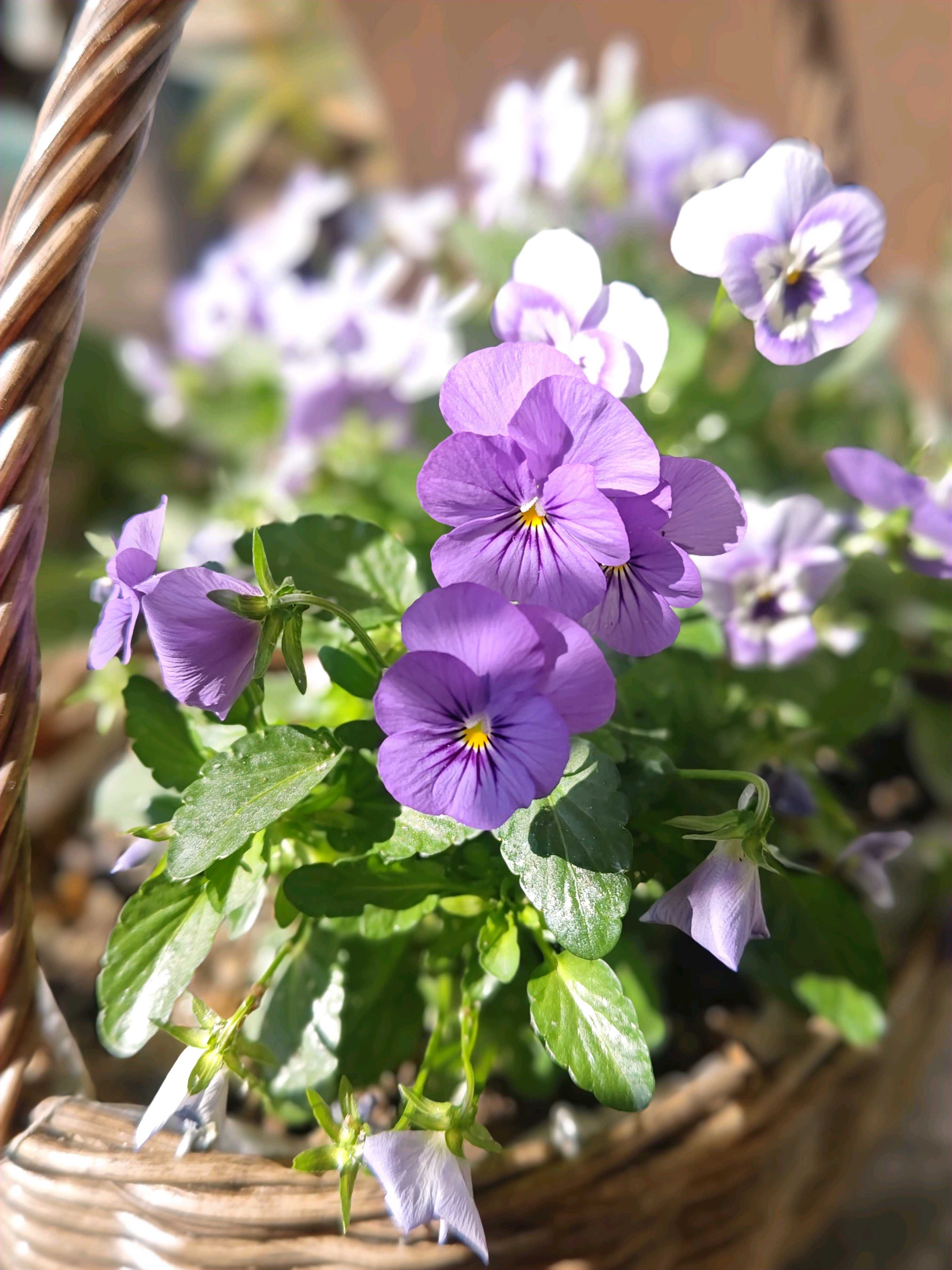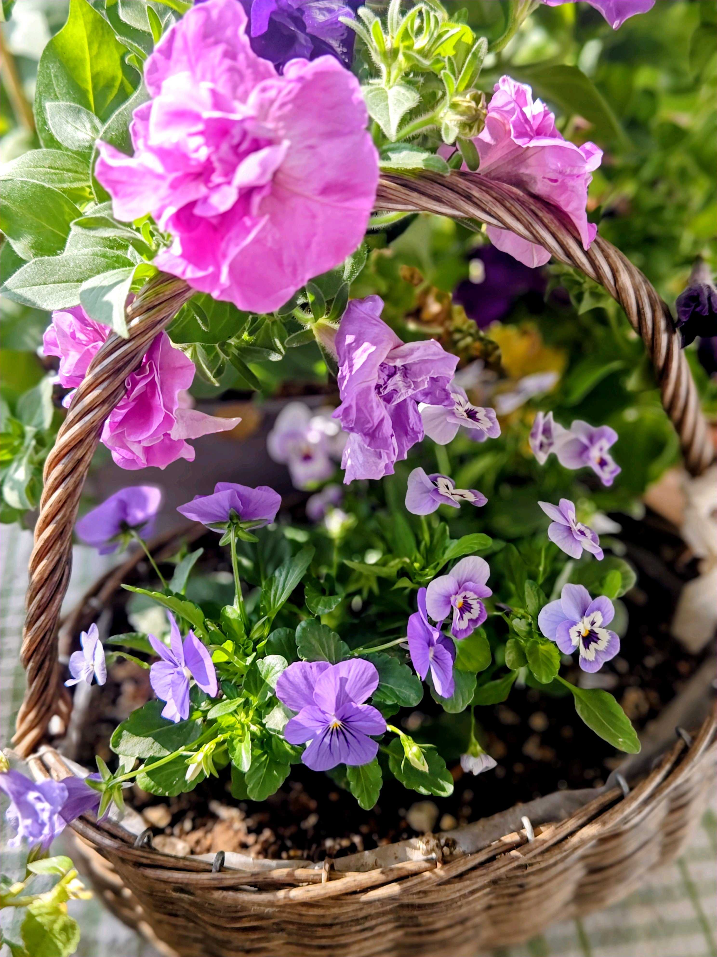 籠🧺に寄せ植え。可愛い顔したビオラだなぁ💕