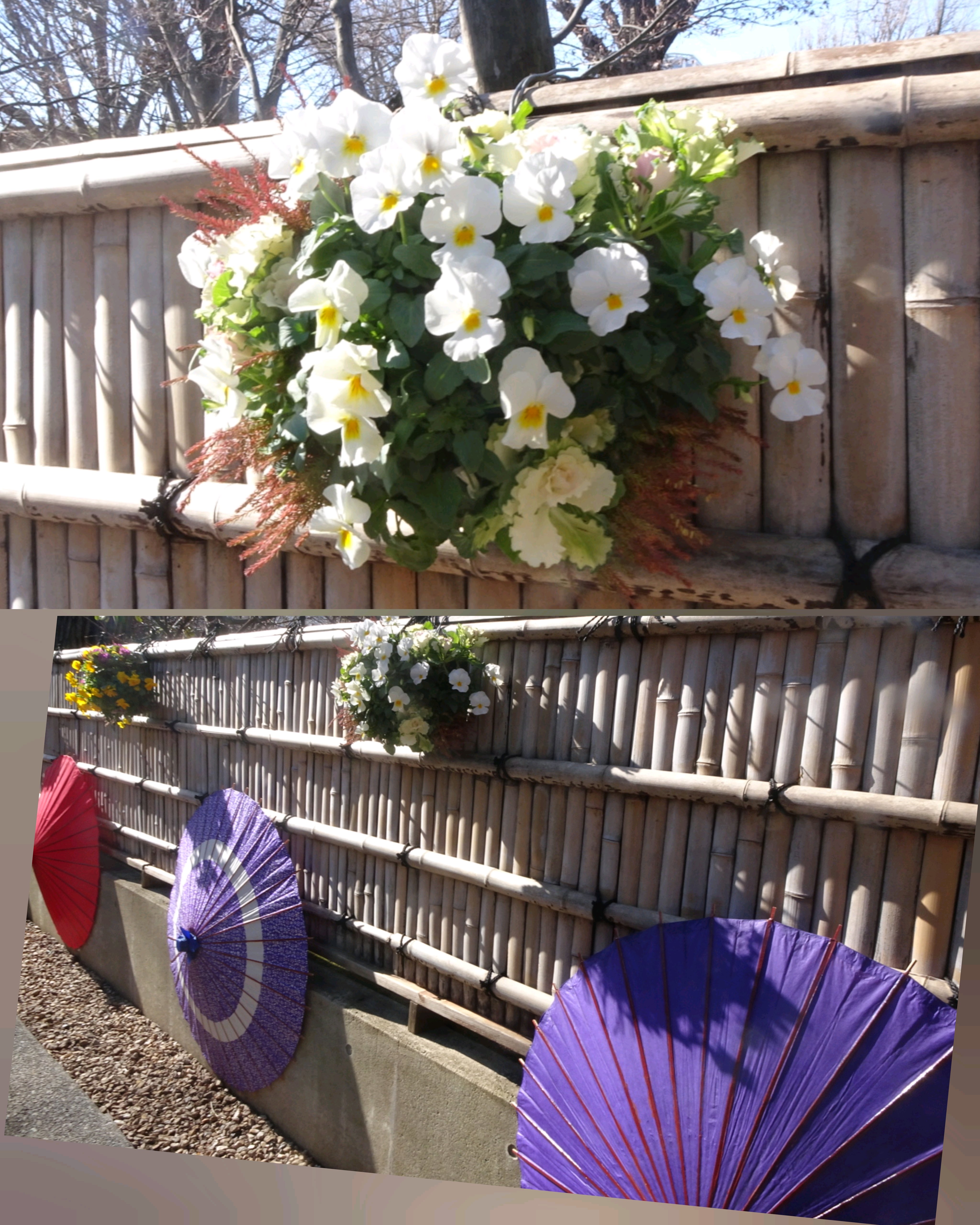 和傘とパンジー・ビオラのハンギングが和庭園へ誘います