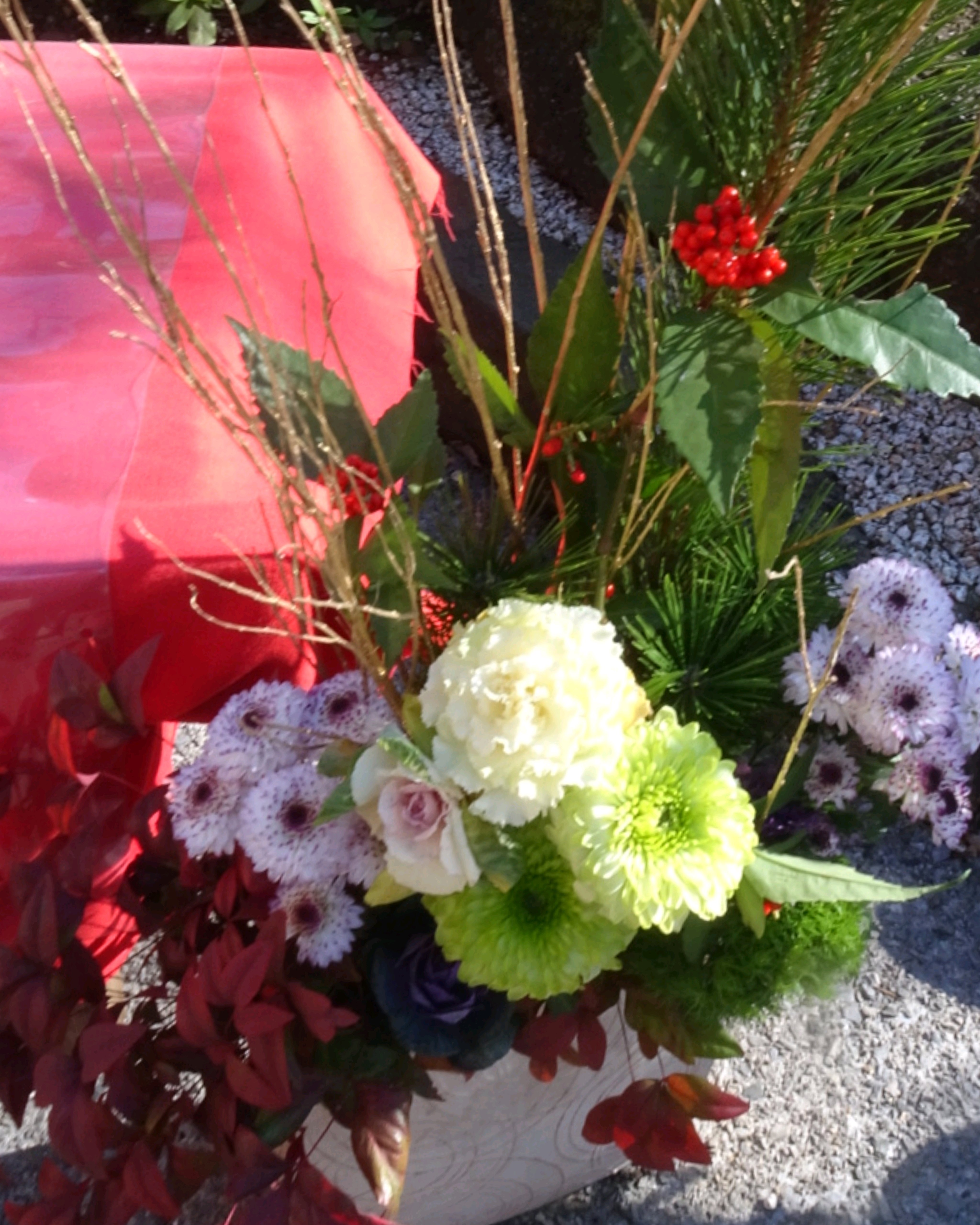 1月なのでお正月らしく松と千両と菊と、金色の枝が入ってる寄せ植えがお出迎え