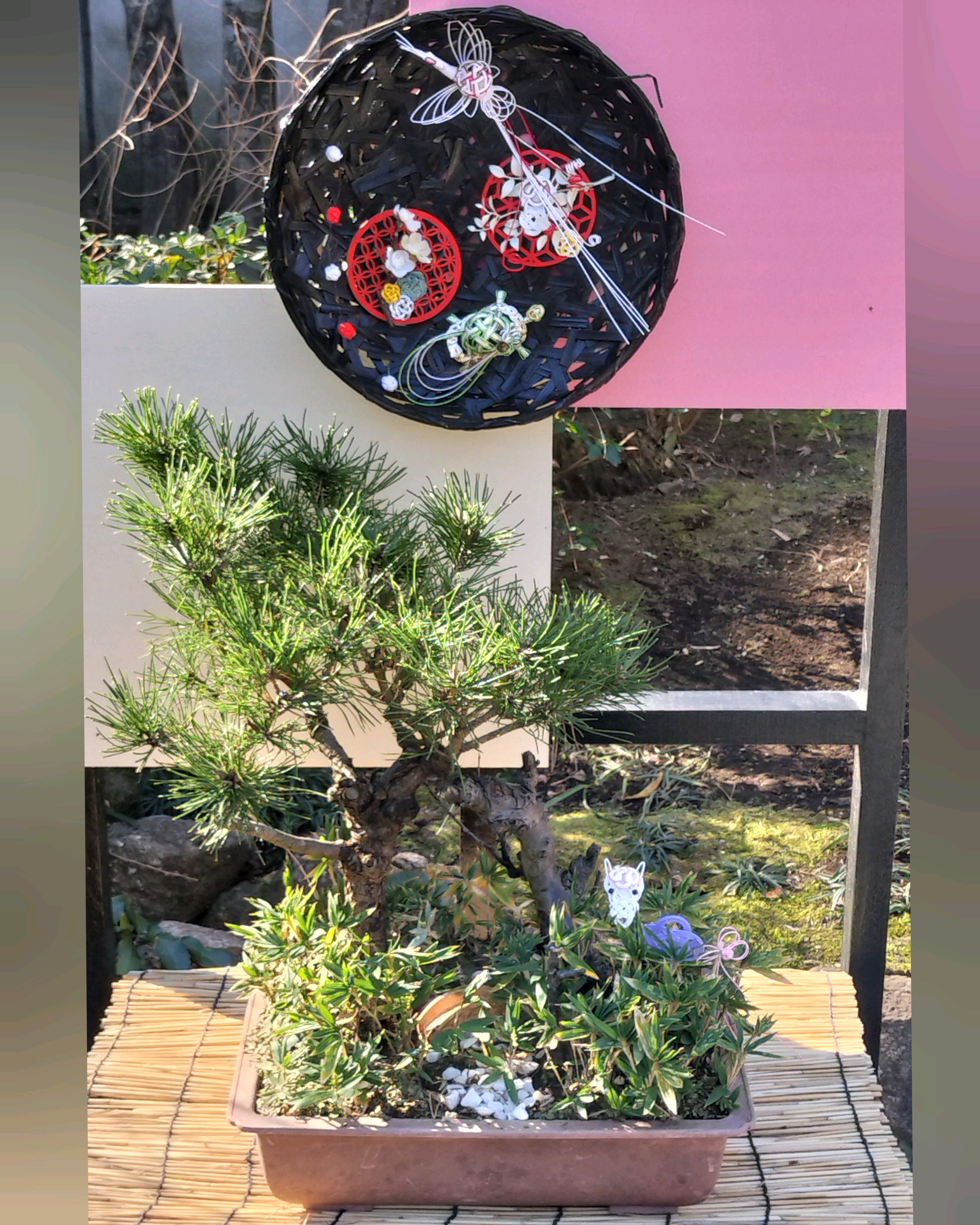 松と小さな籠、金柑