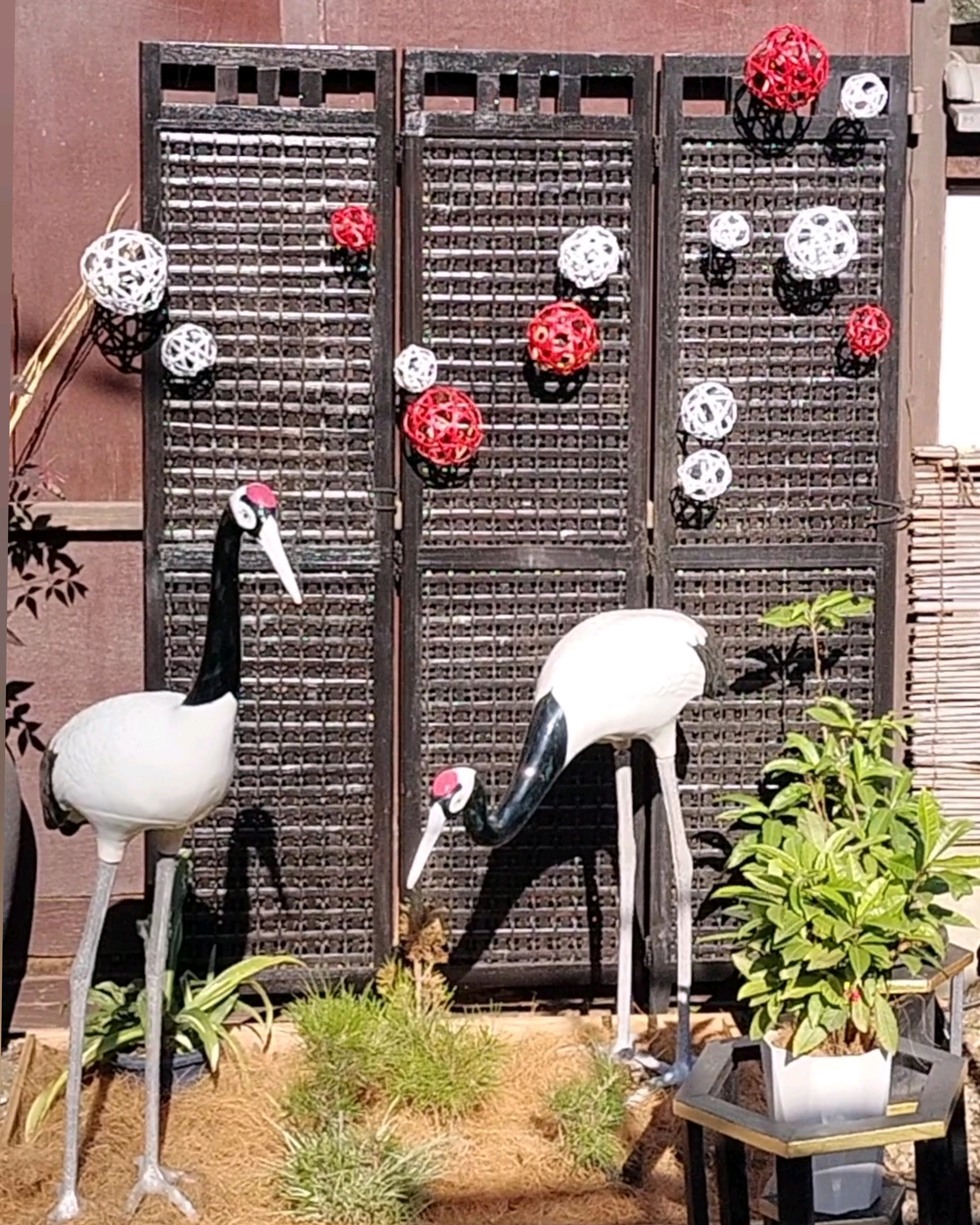 紅白の丸い小さな籠が風で揺れていました。和のオブジェ素敵です!