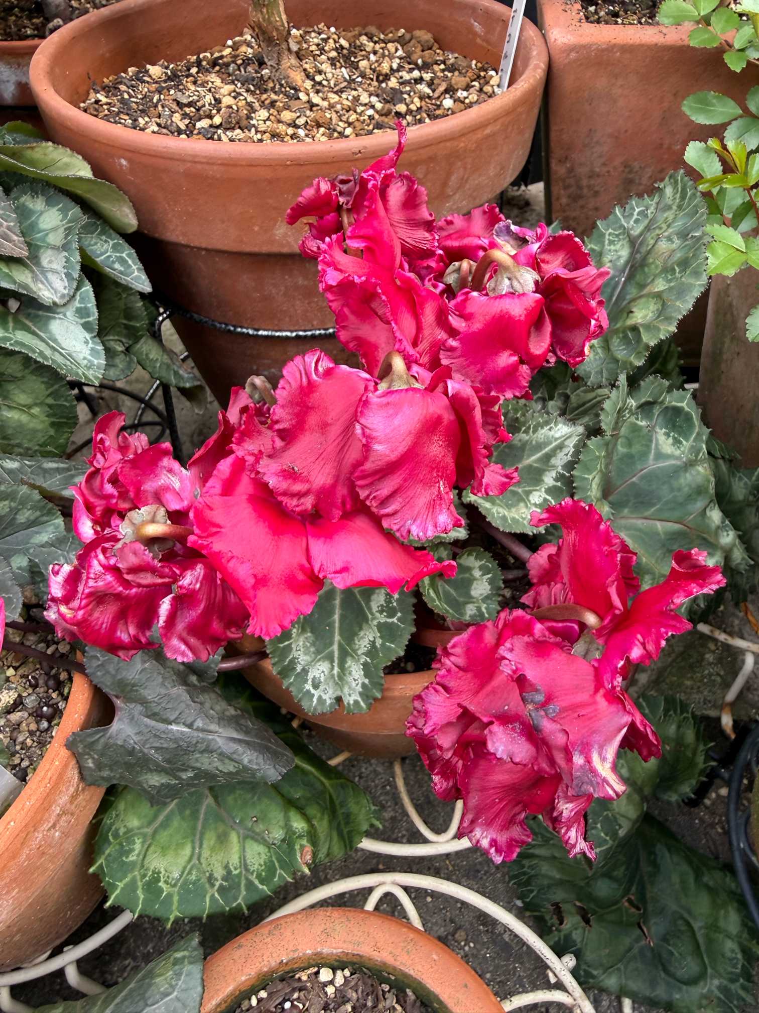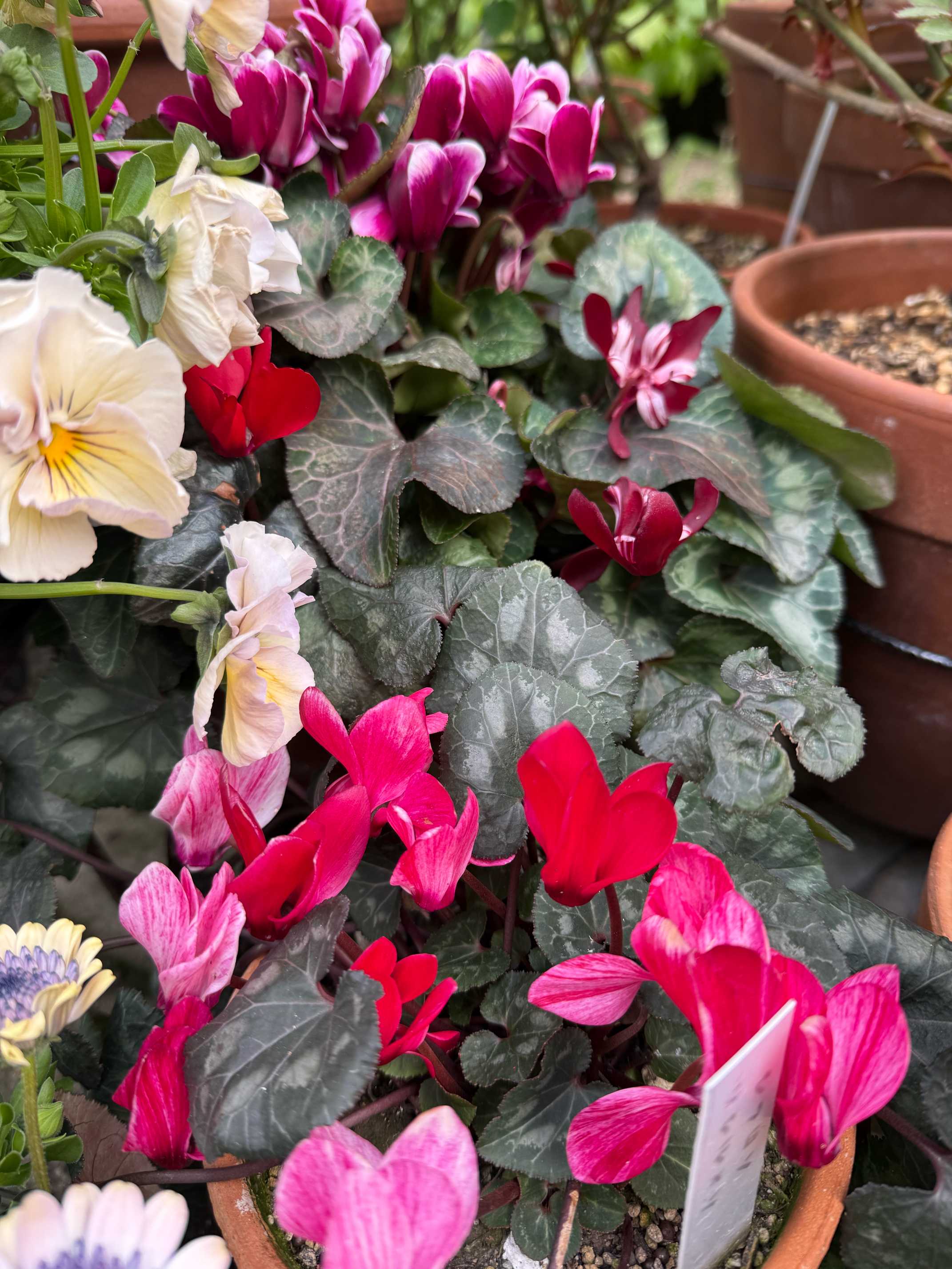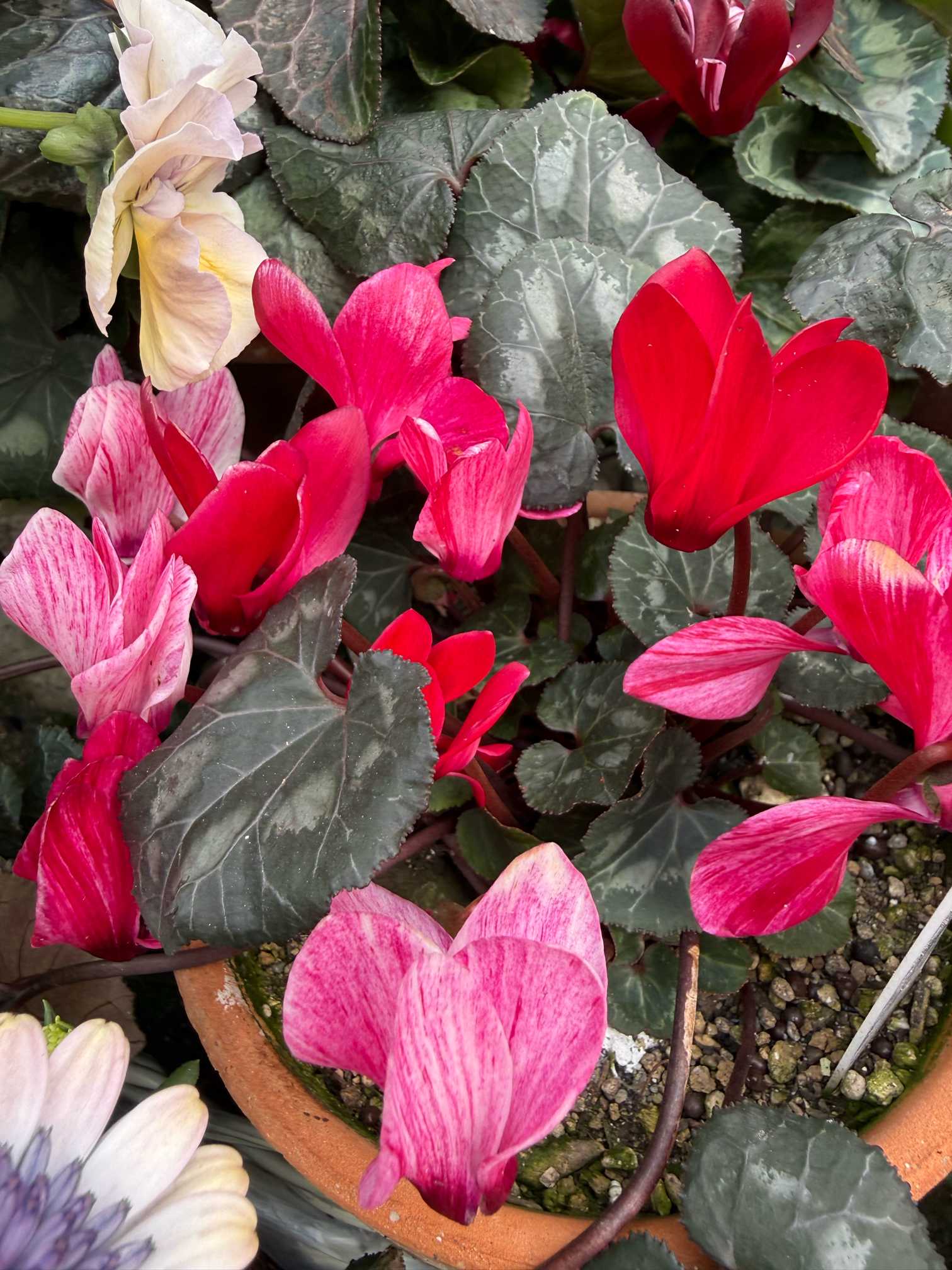 3株寄せ植えはゴブレット似の子とジックス似の子、真っ赤なガーデンシクラメンと判明。