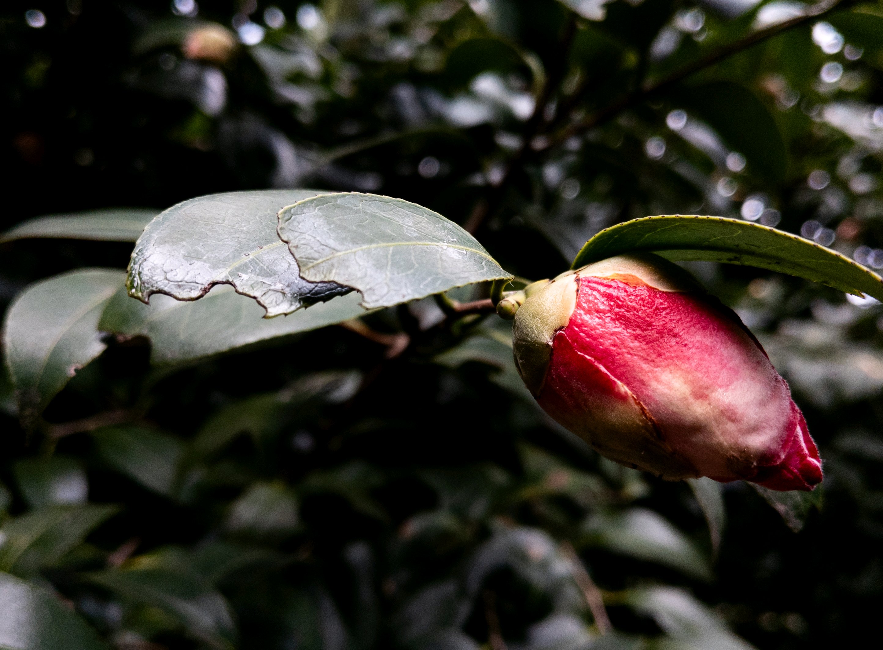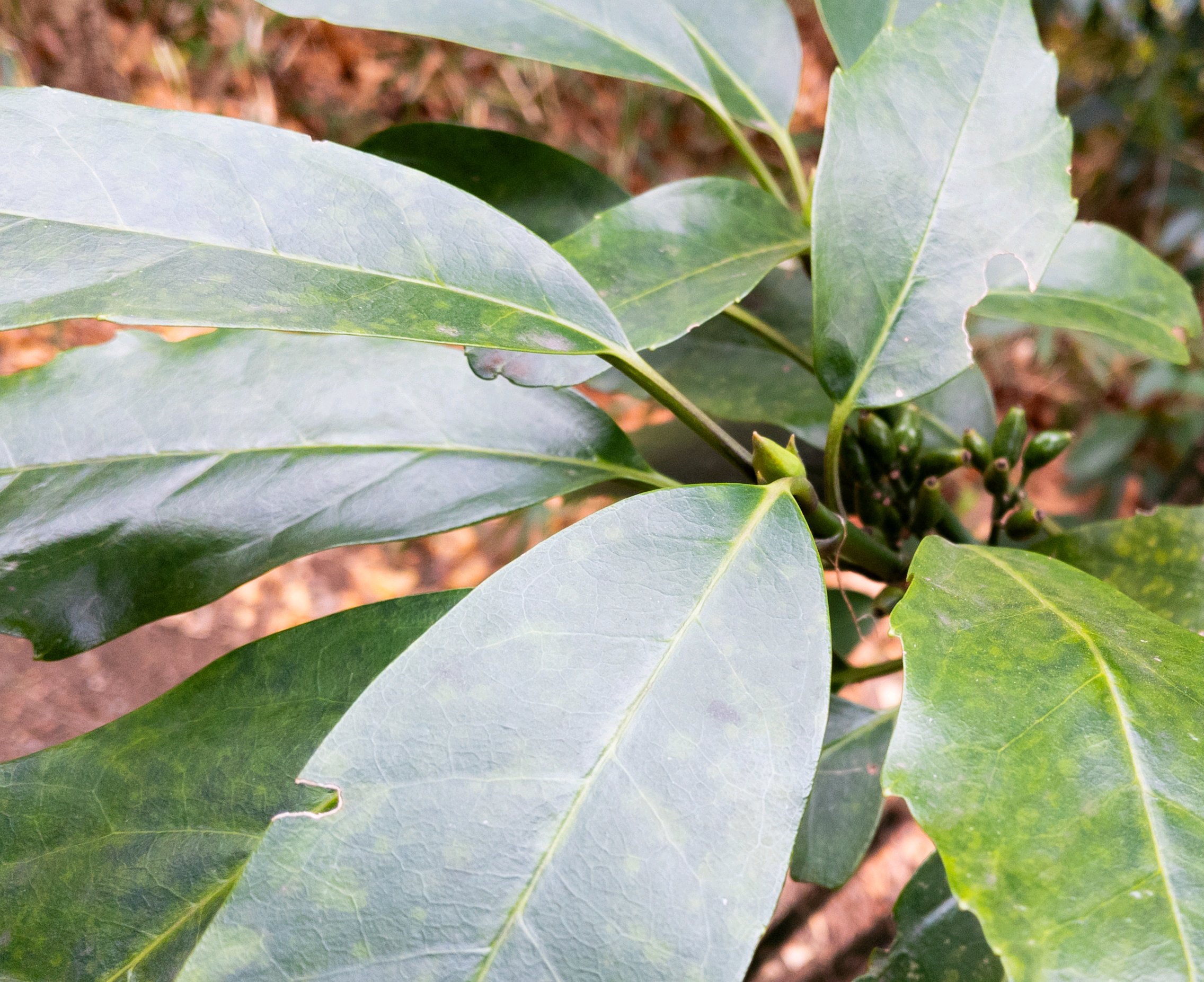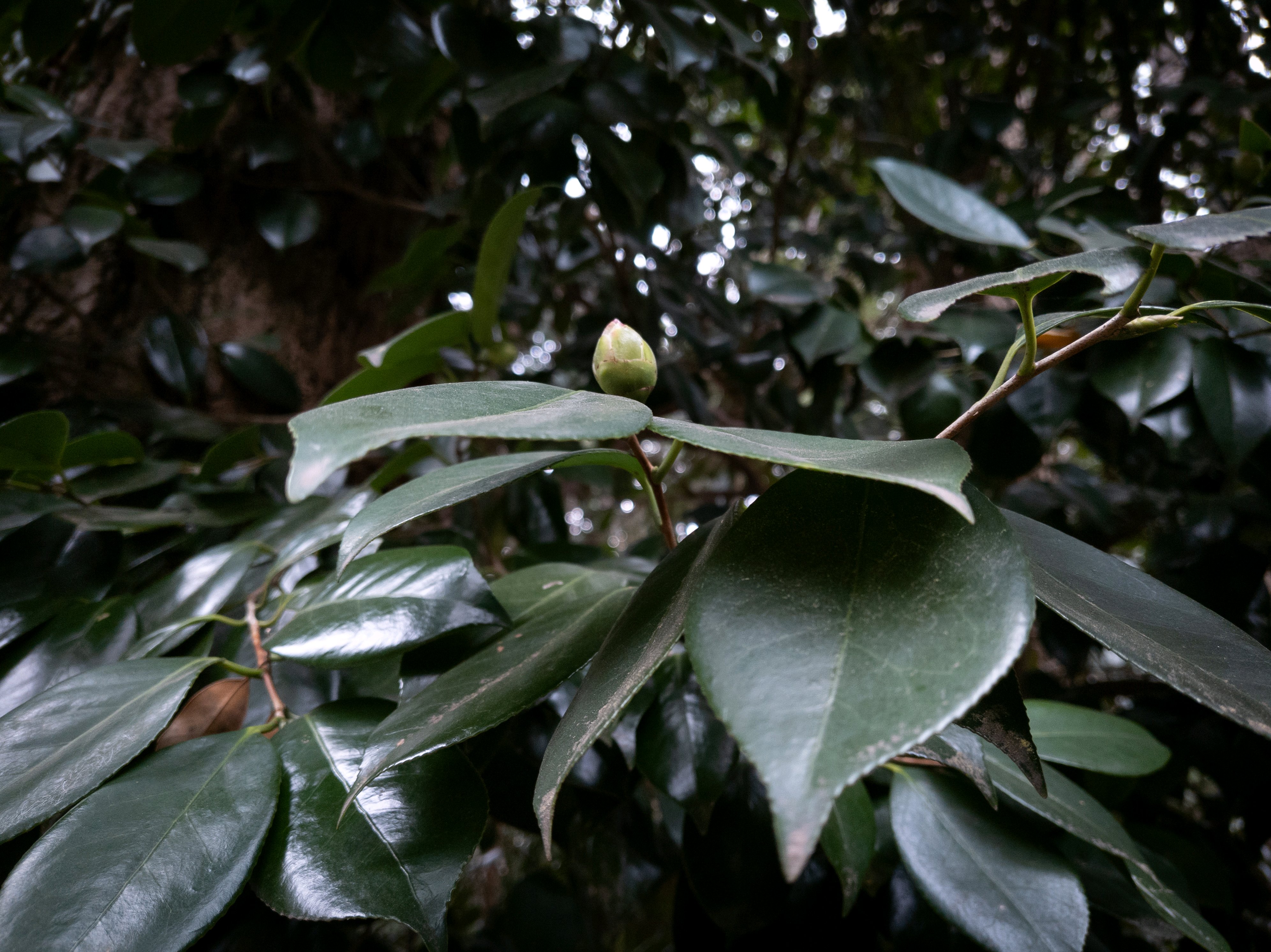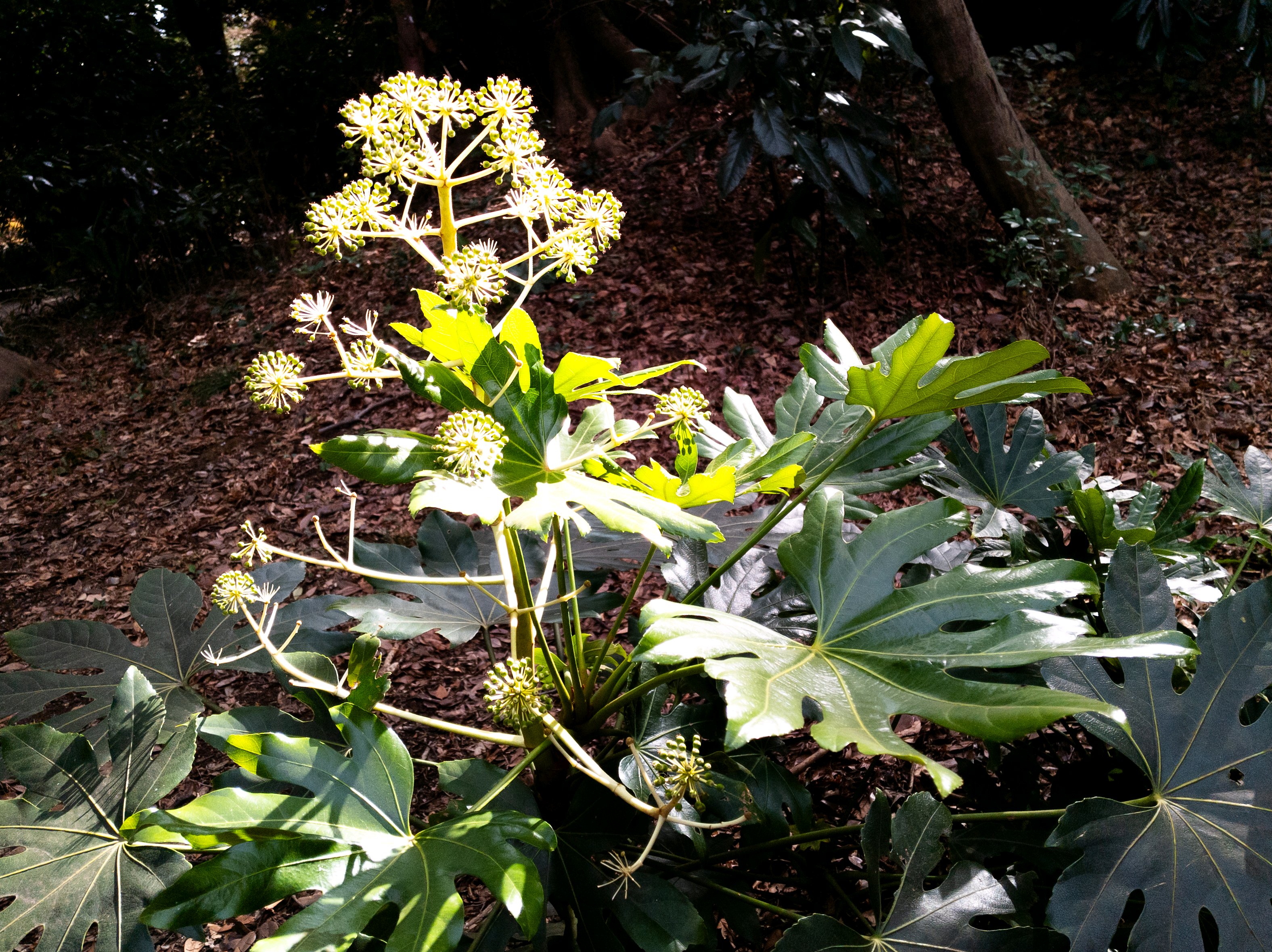 椿林に一瞬だけ陽が射し込んだと思ったら、ヤツデが美しく照らし出された。