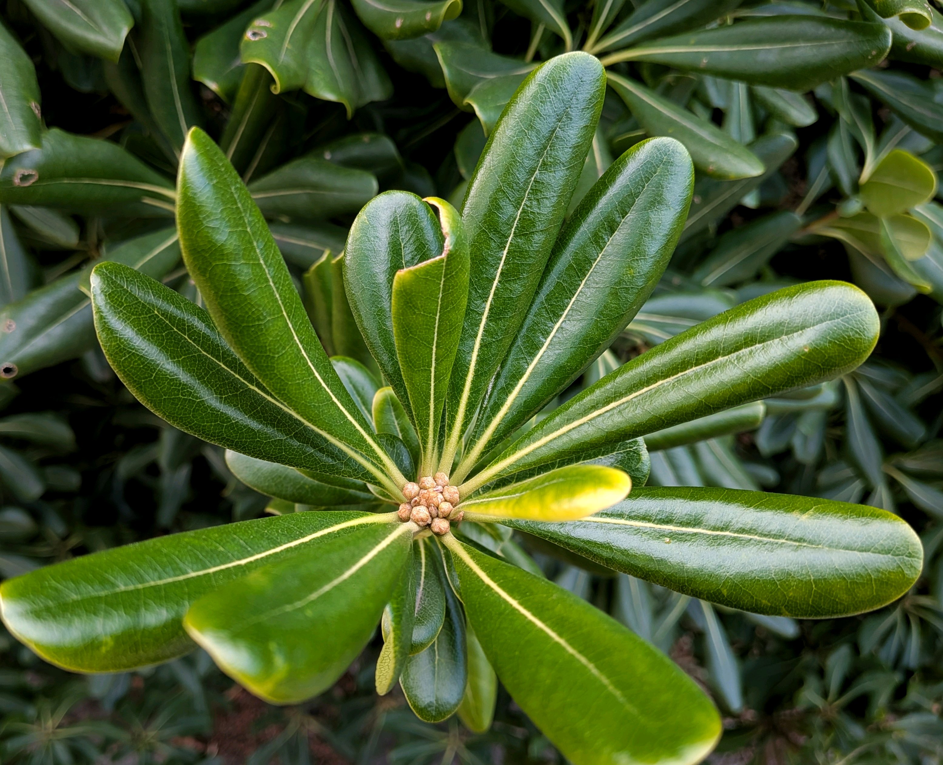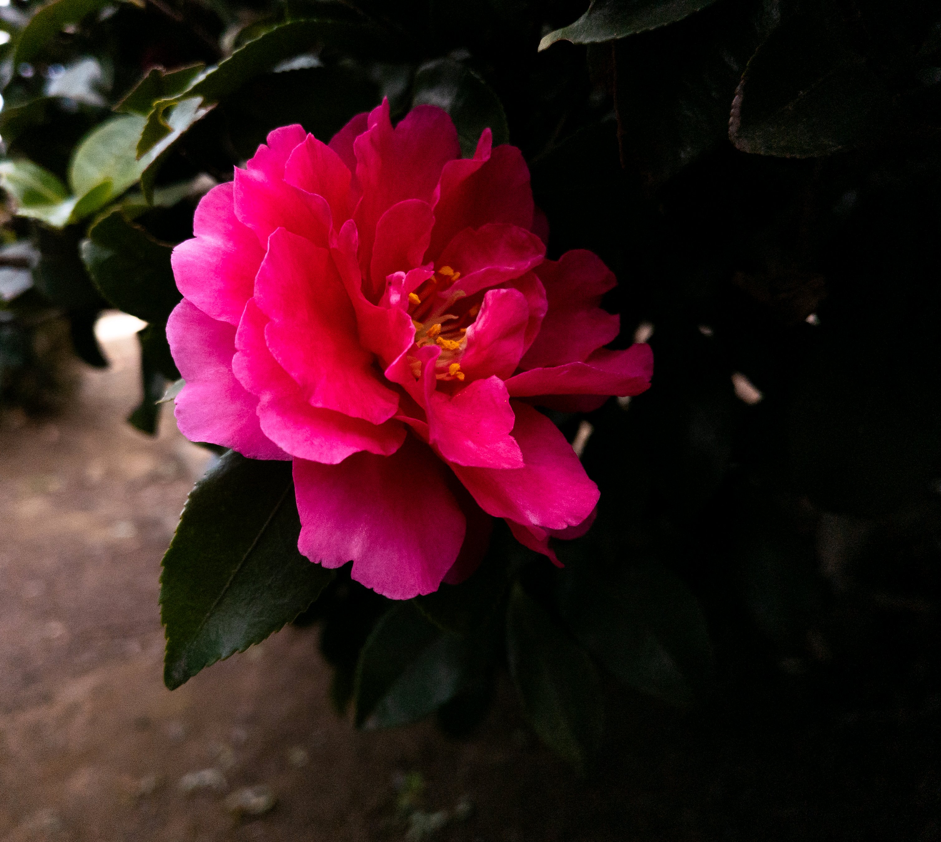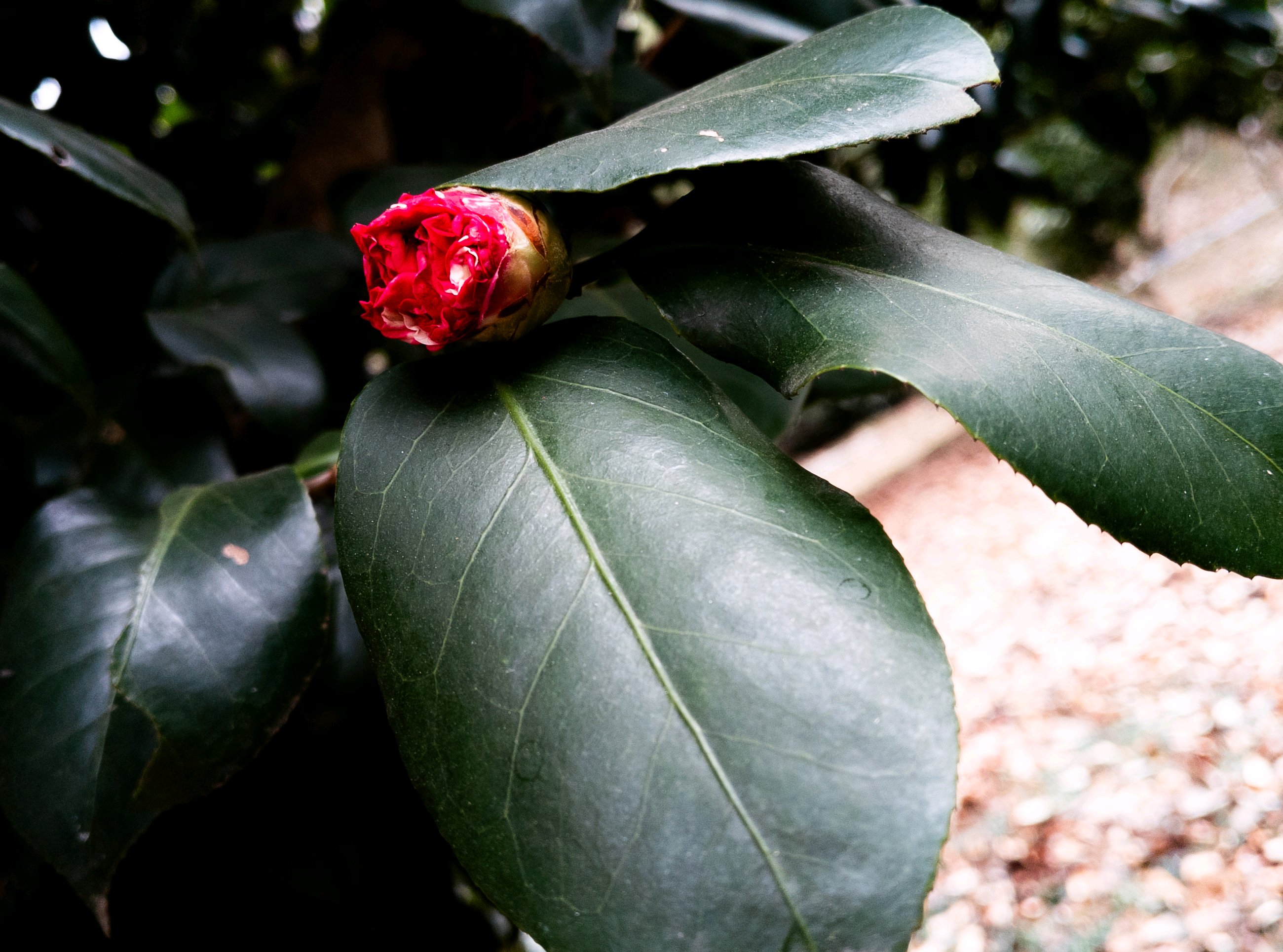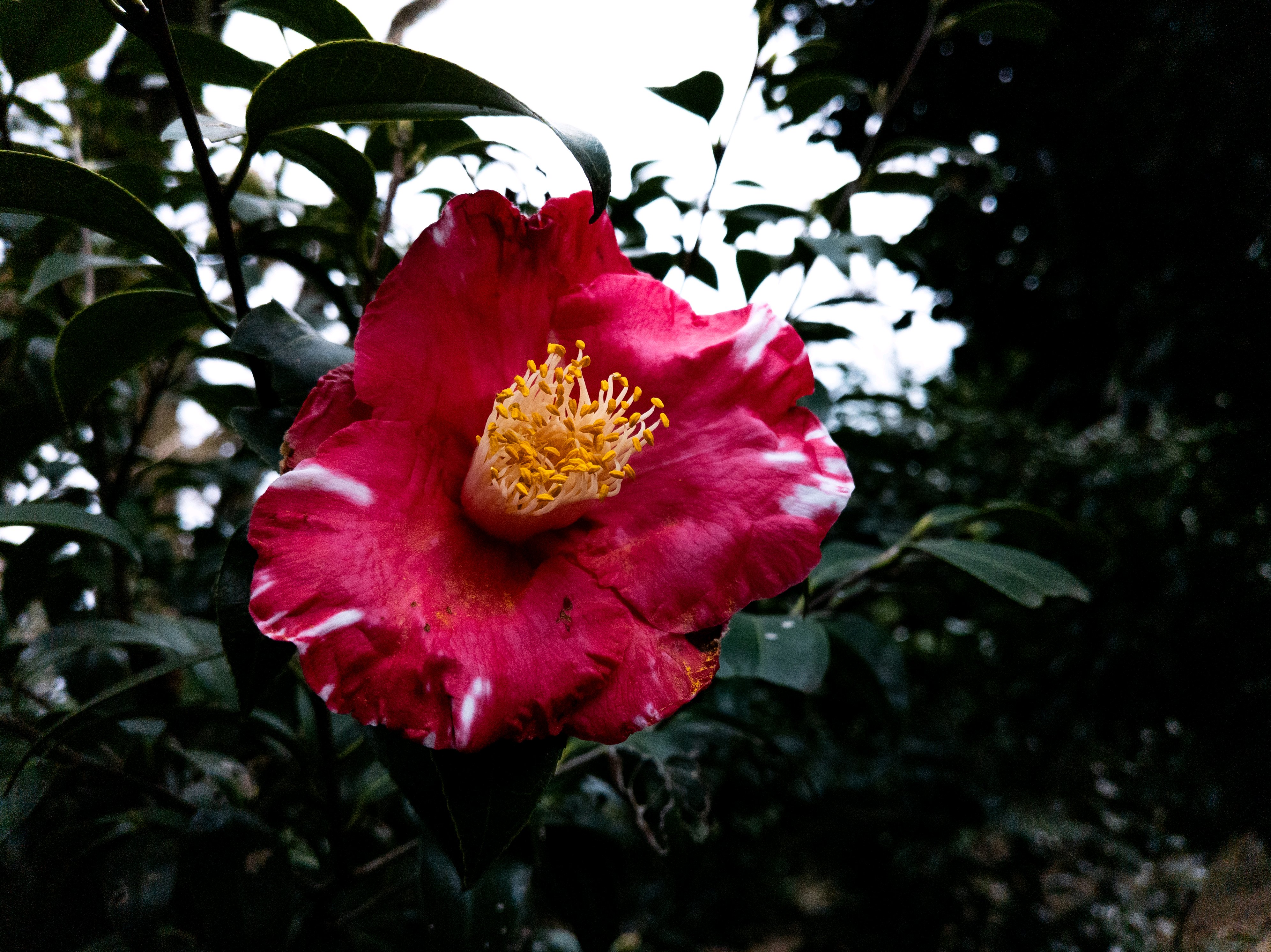 椿林に一瞬だけ陽が射し込んだと思ったら、ヤツデが美しく照らし出された。
