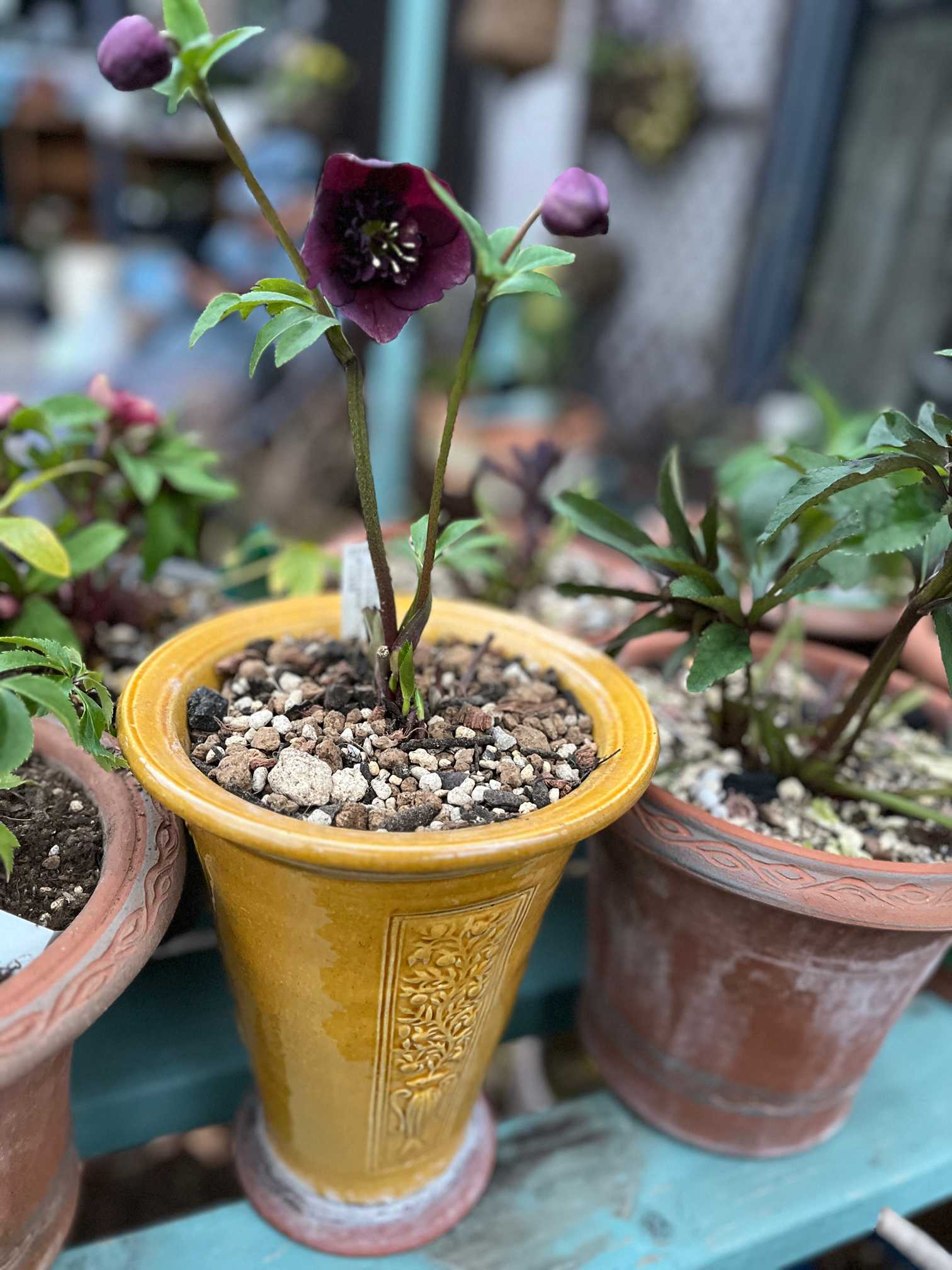 モーリー交配 初めて、塗り鉢に植えてみた。有島先生も花友さんも塗り鉢でも問題ないっておっしゃってたから、チャレンジです!黄色い鉢に臙脂のお花😍