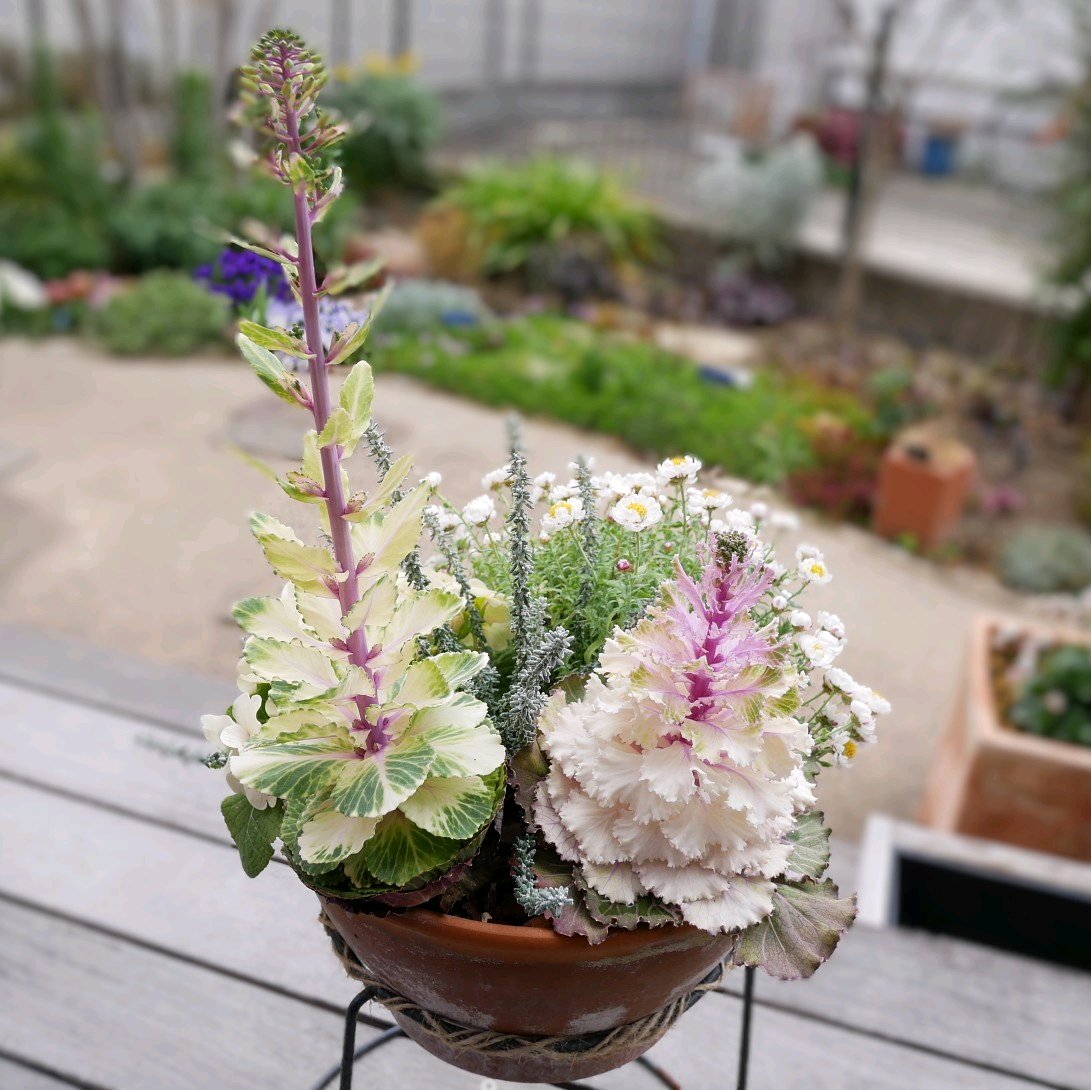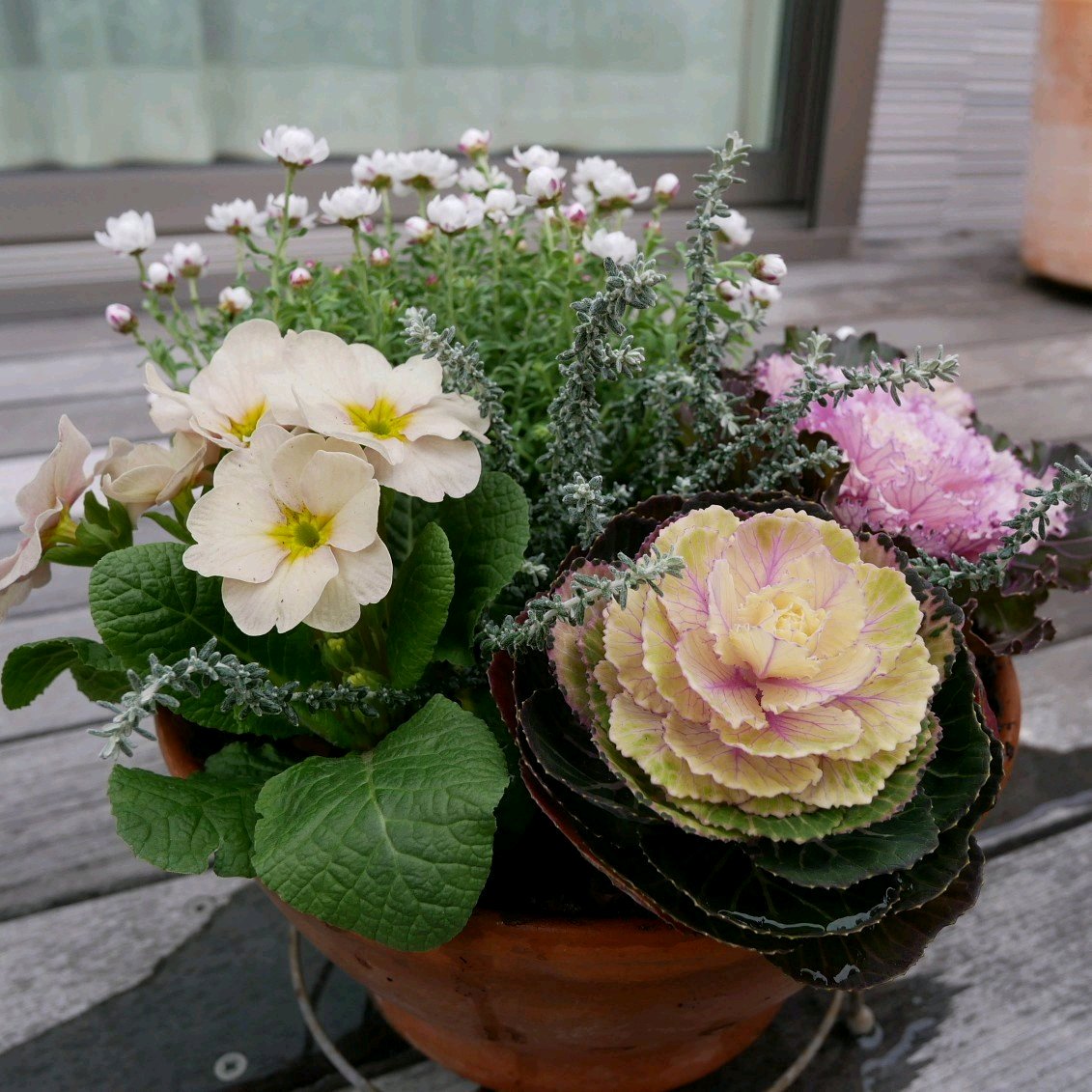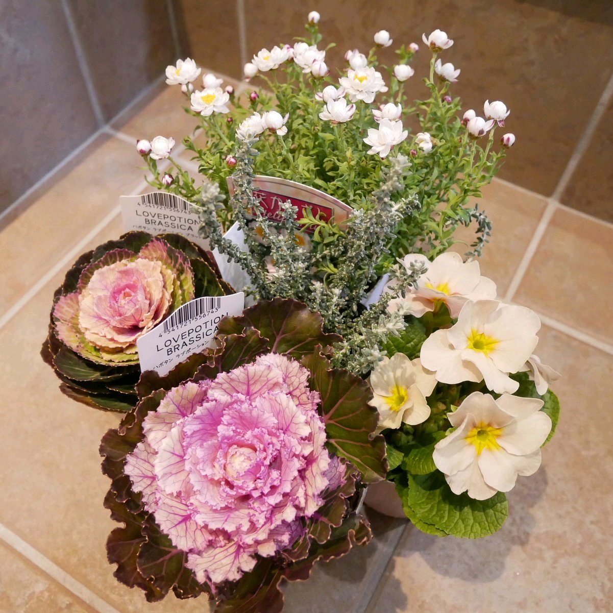 ハボタンモニターに当選したのて、可愛い花を買ってきて寄せ植えに。