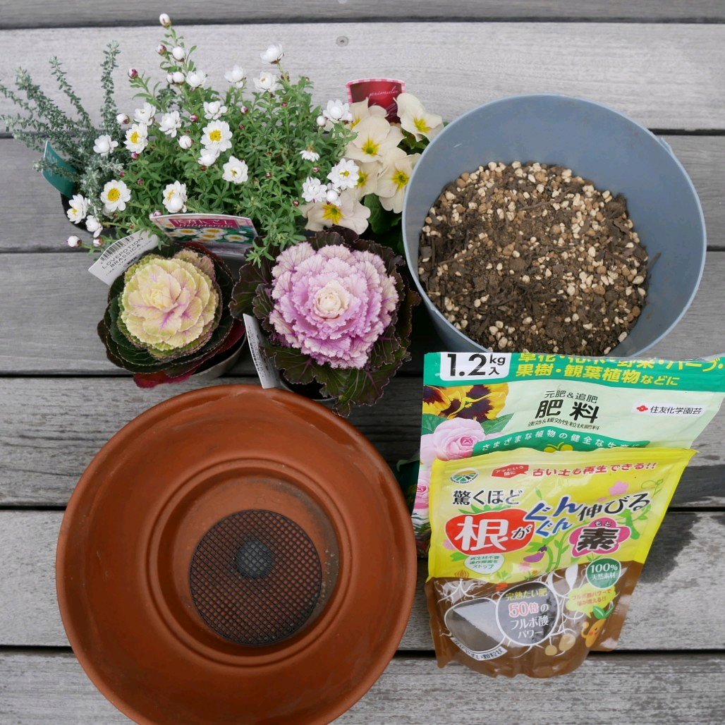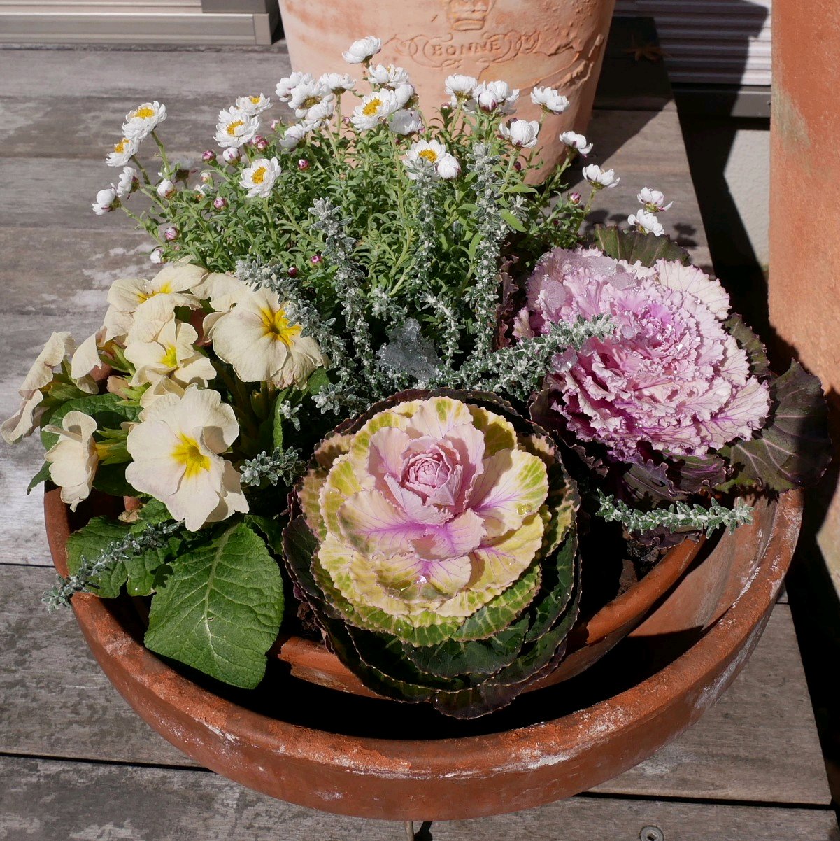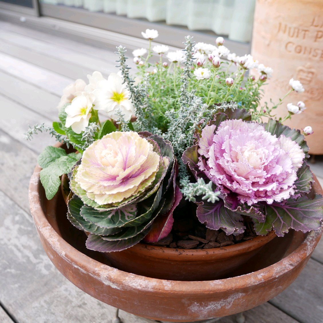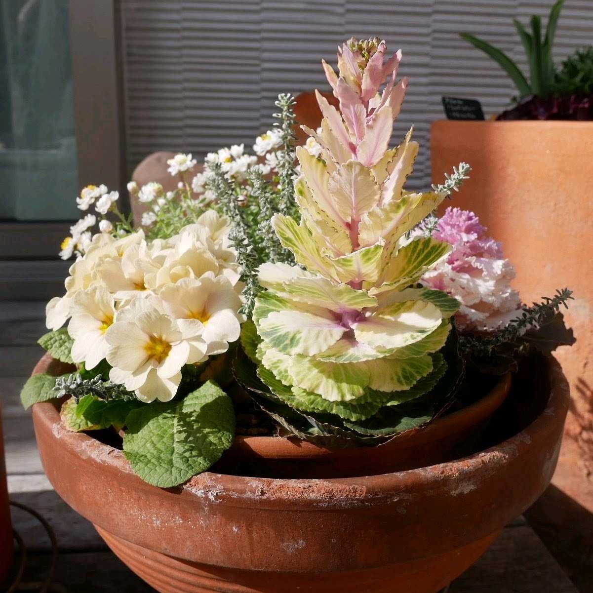 ハボタンモニターに当選したのて、可愛い花を買ってきて寄せ植えに。
