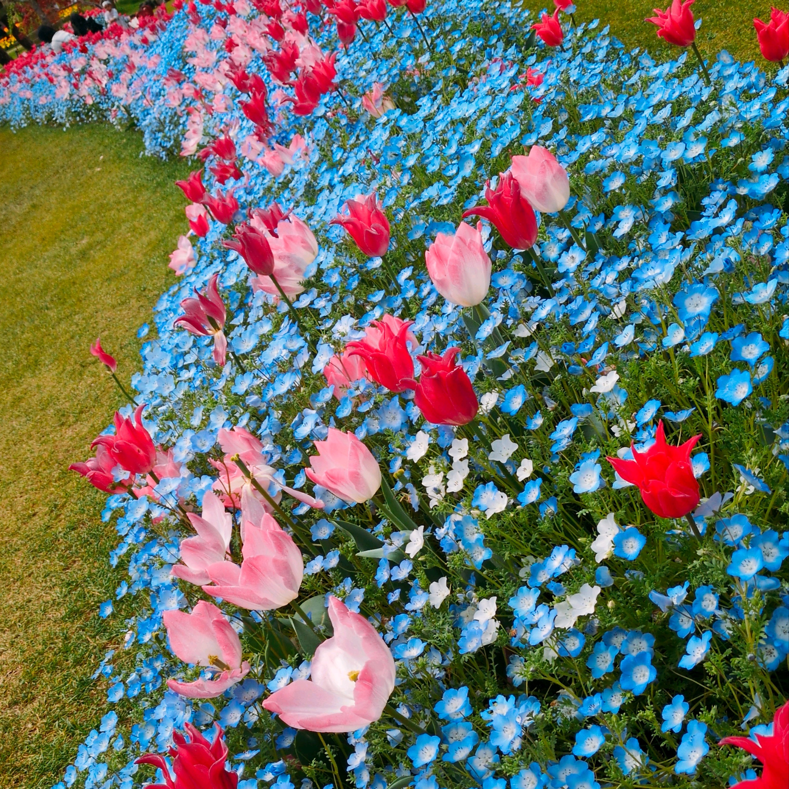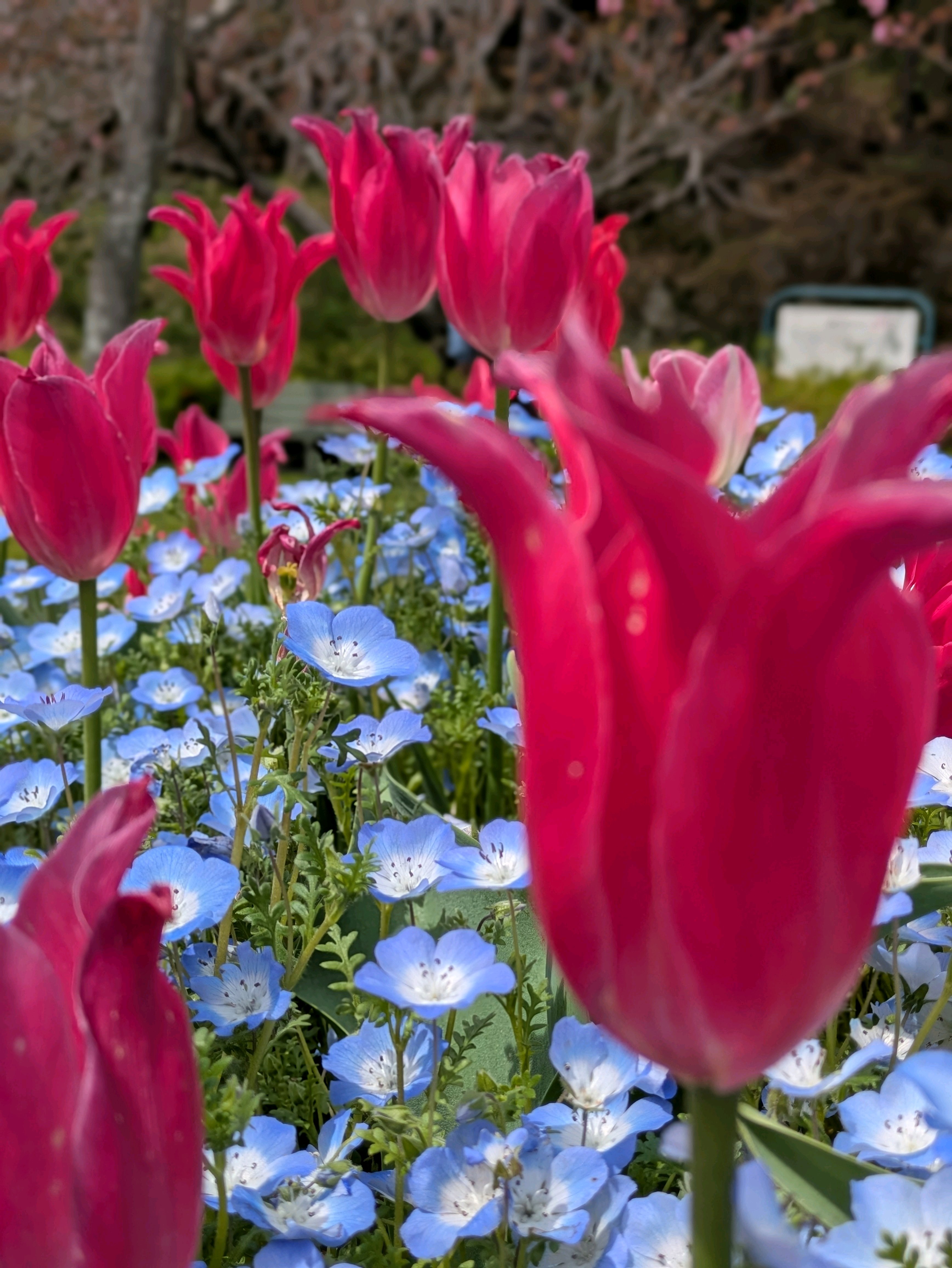 ネモフィラとレッドのチューリップのコンビネーション🩵♥️✨