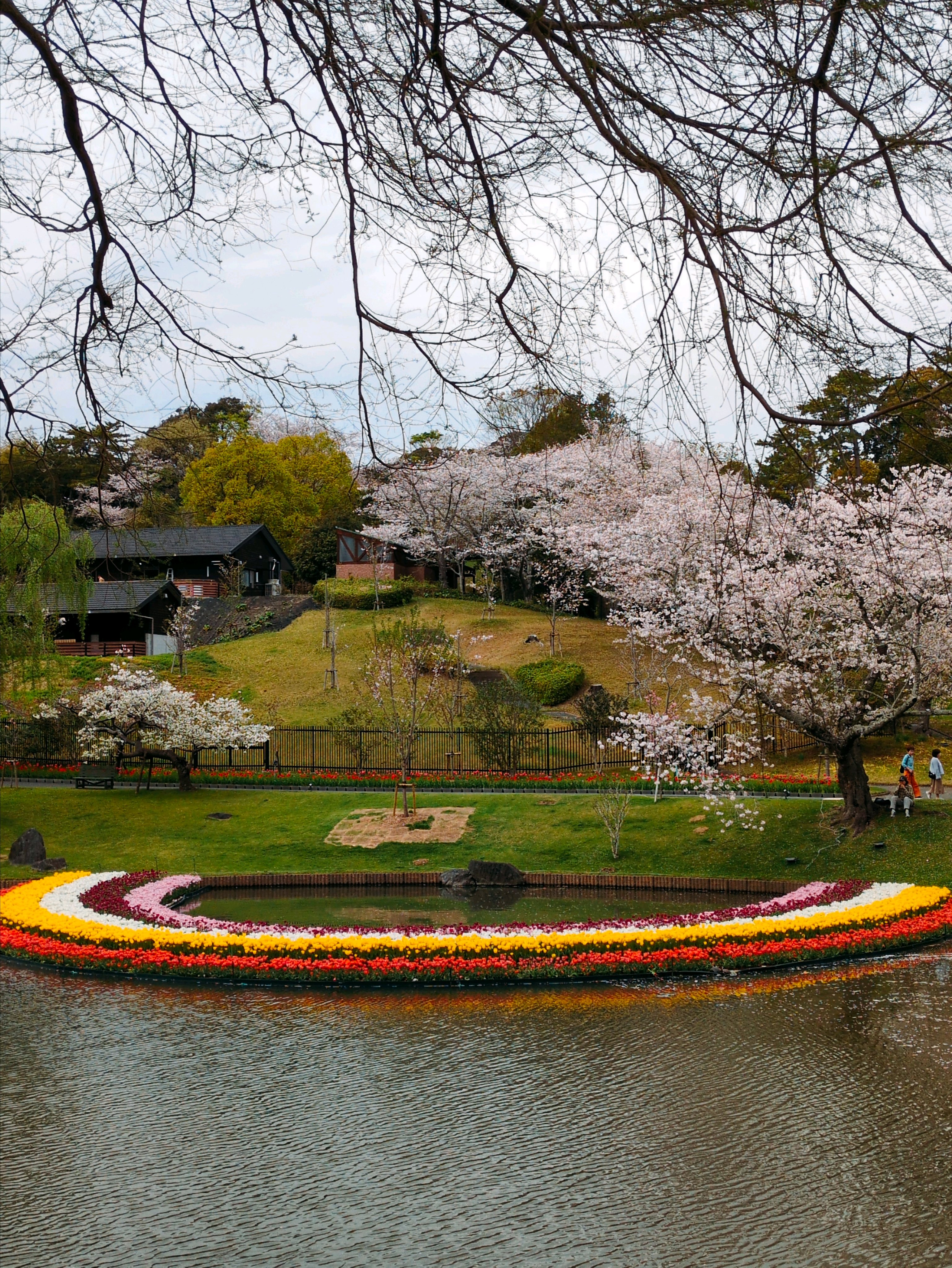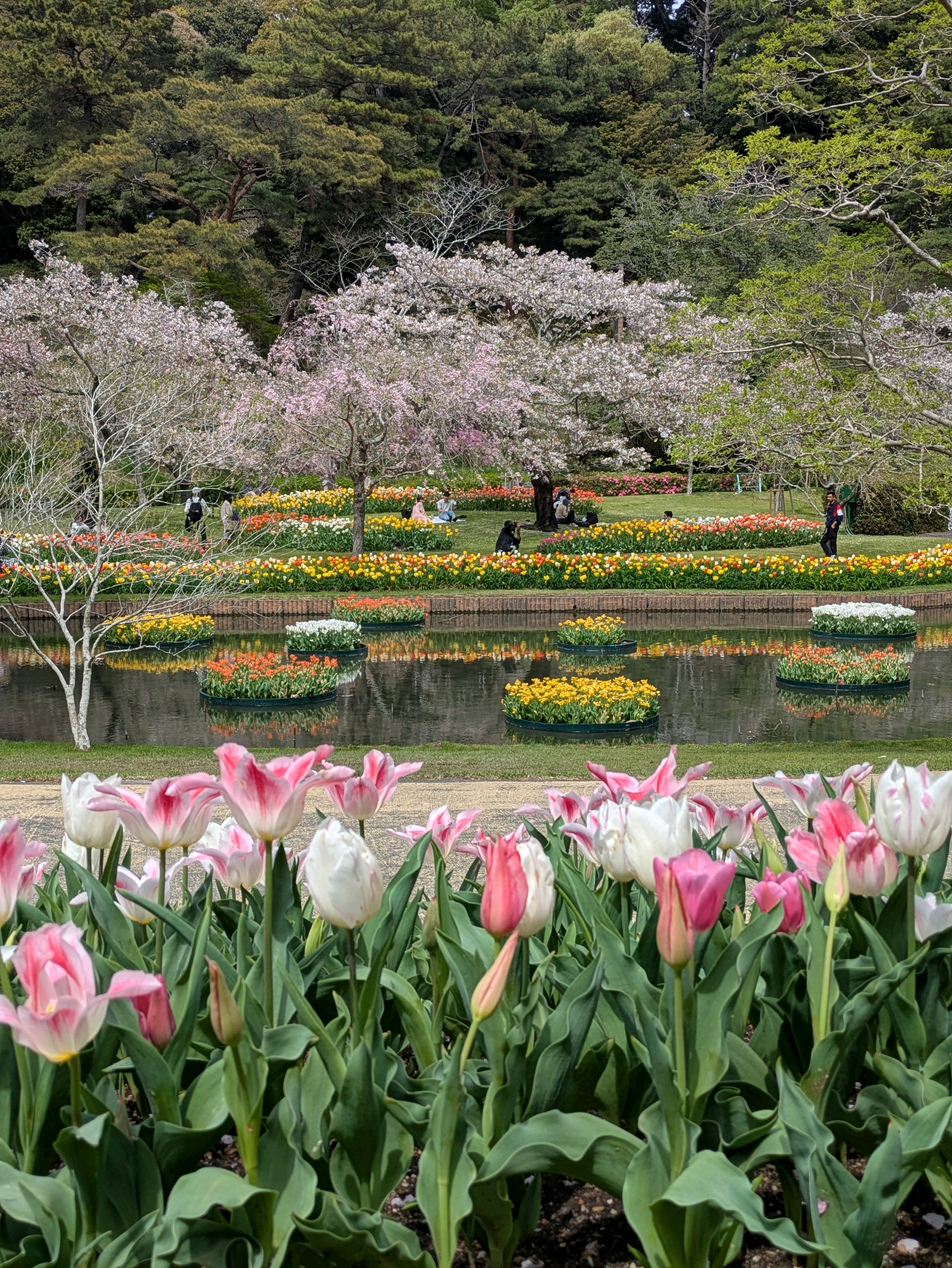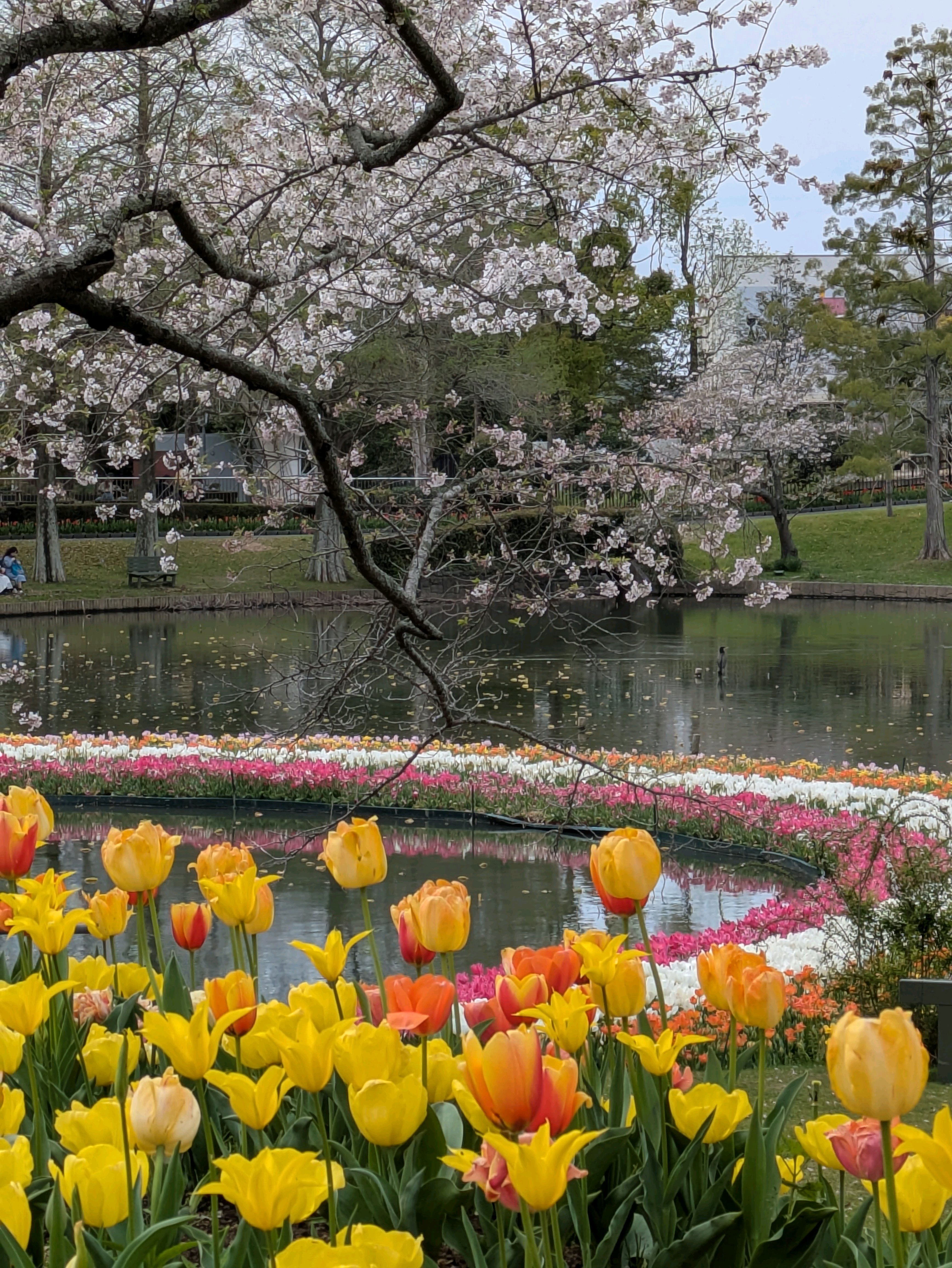 池のほとりを去り歩く事数分に目に広がる桜とチューリップのコラボ🌸🌷