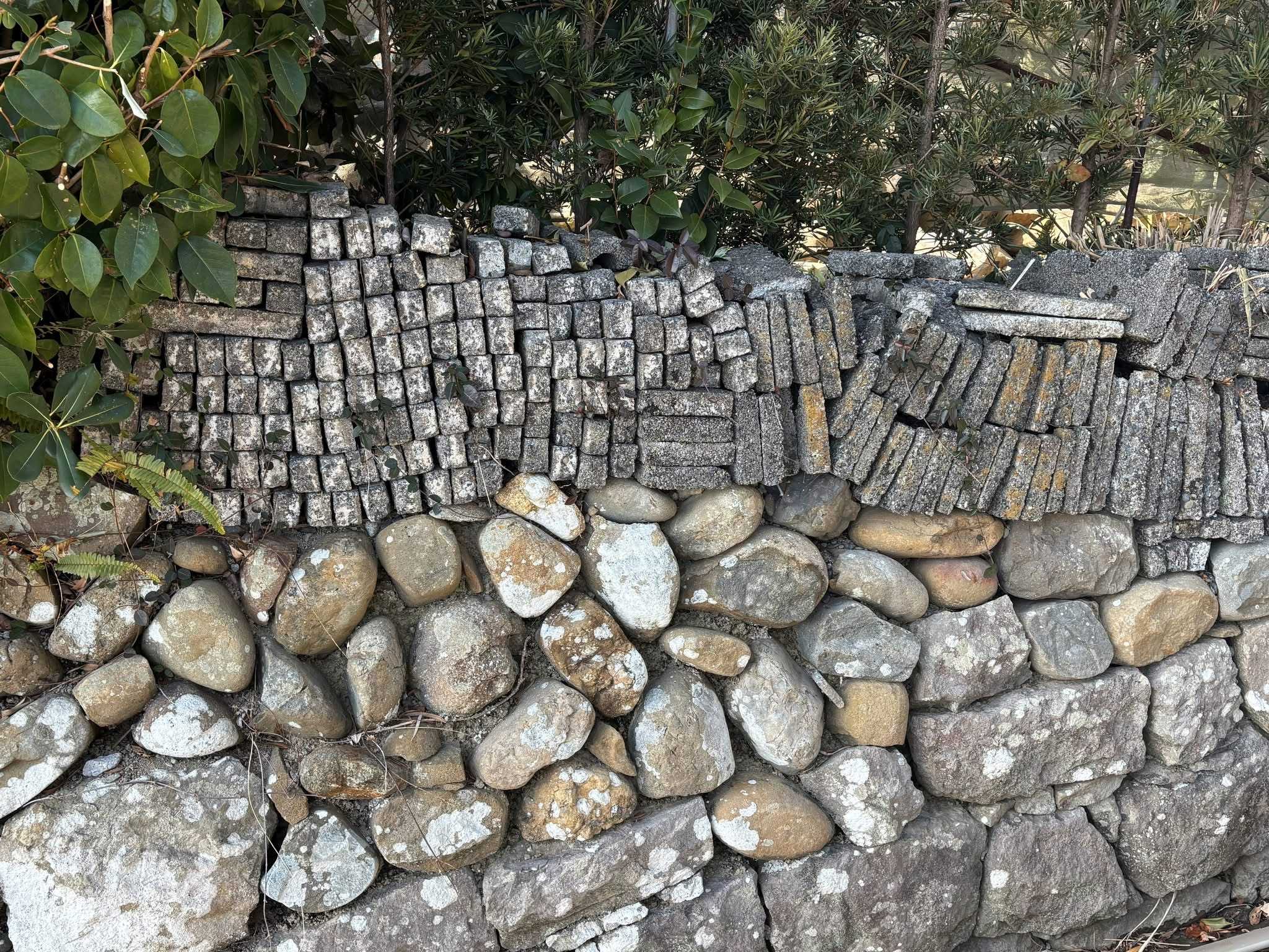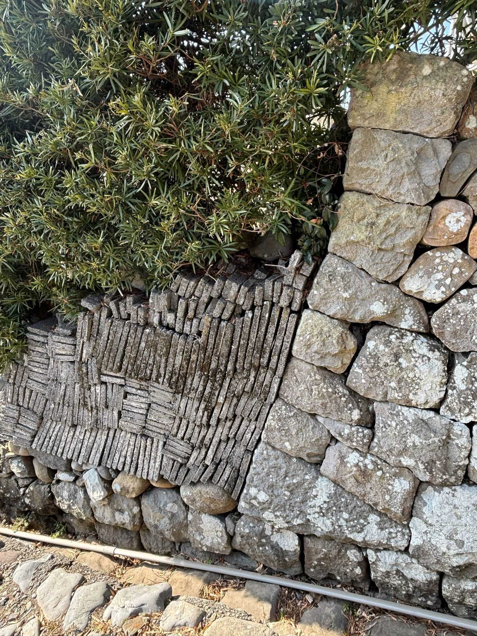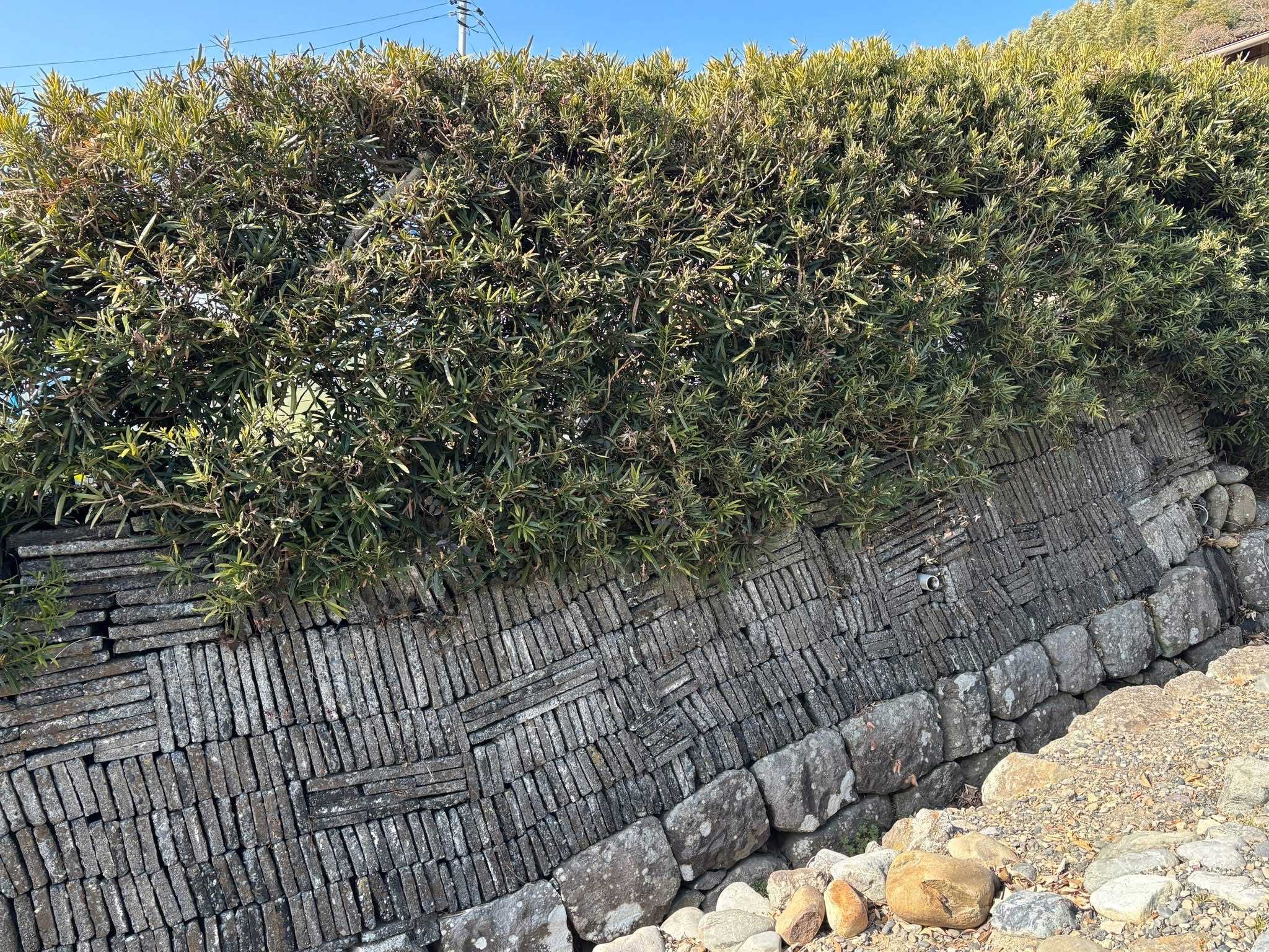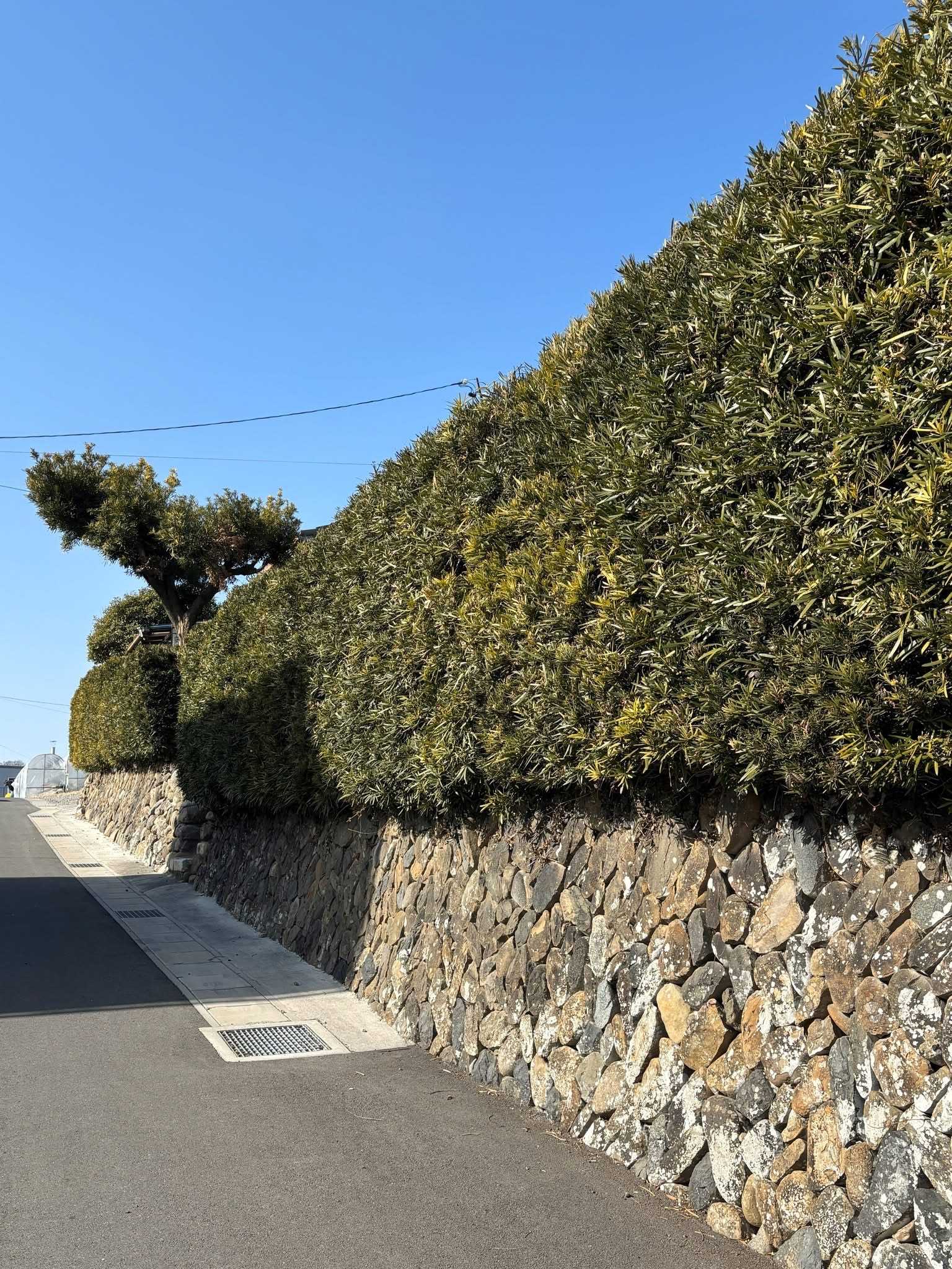 見事な犬槇(イヌマキ)の垣根の下は個性的な石垣です。四角い石で組まれた石垣の上に、これはいちごの栽培に使う石でしょうか、平たい石が積まれています。