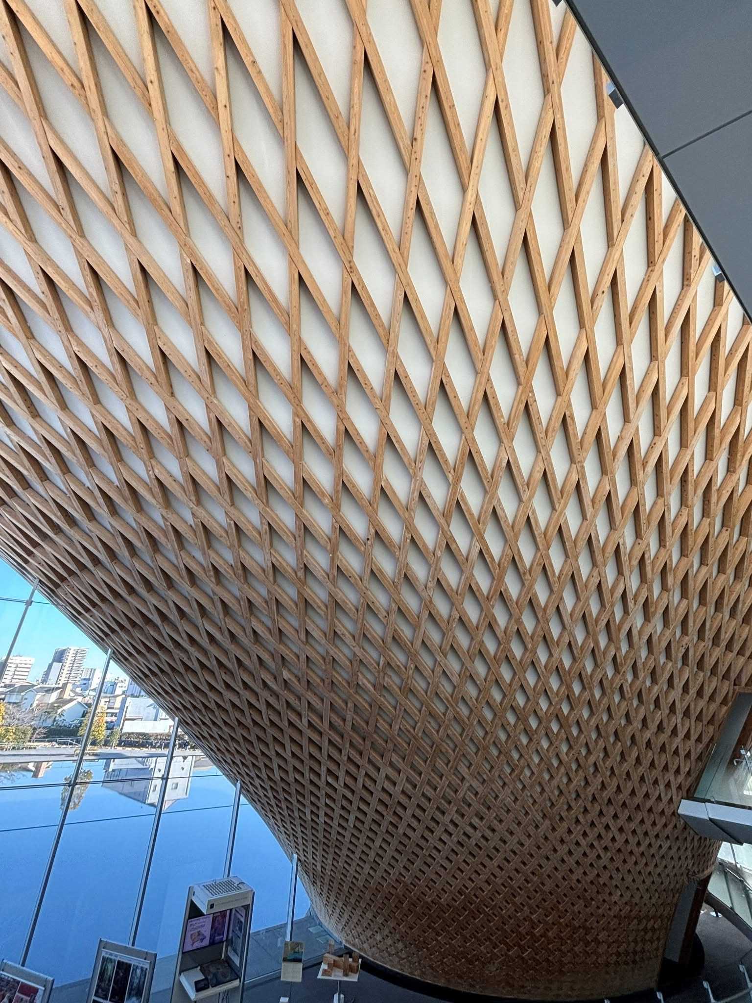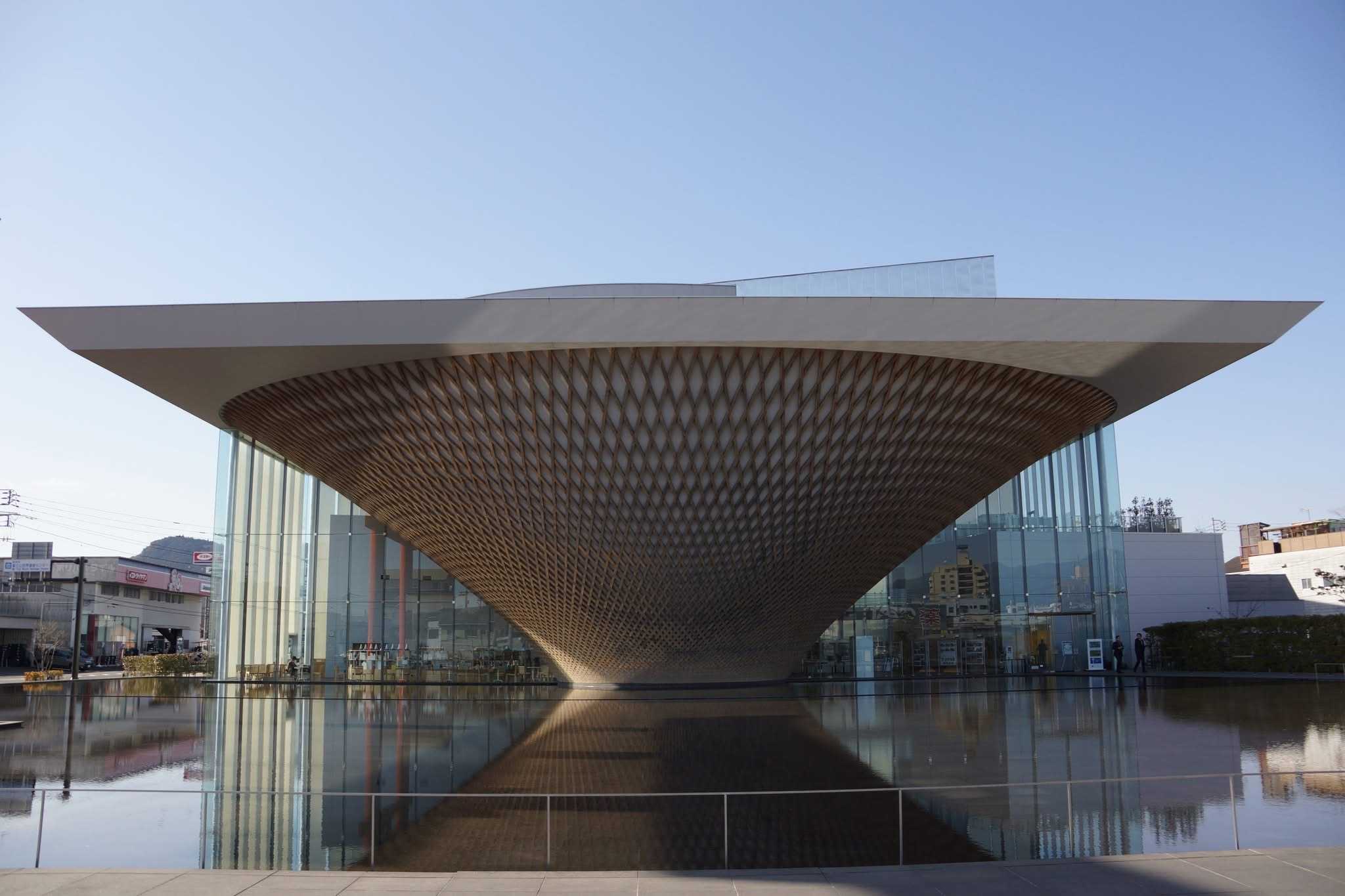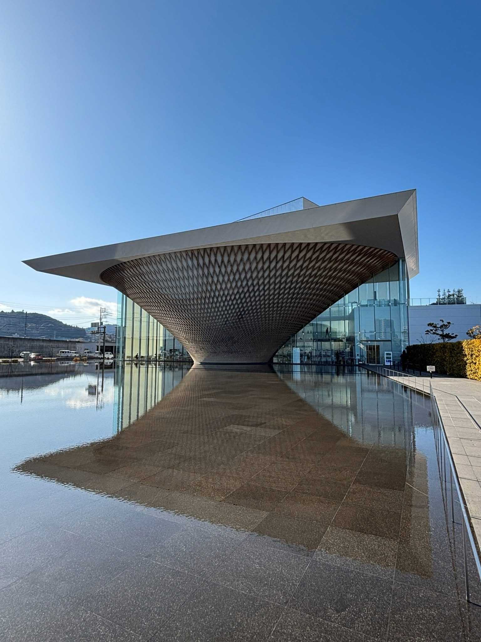 センターは、逆さ富士をモチーフにした建物のようです。建物の前にある地下水を利用した水盤に逆さの逆さ富士がが現れます💦