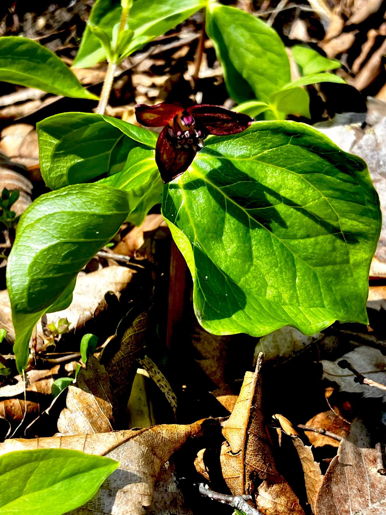 茎の上部に3枚の菱形の葉を輪生させ、花は緑~紫色の萼片3枚のみで構成!