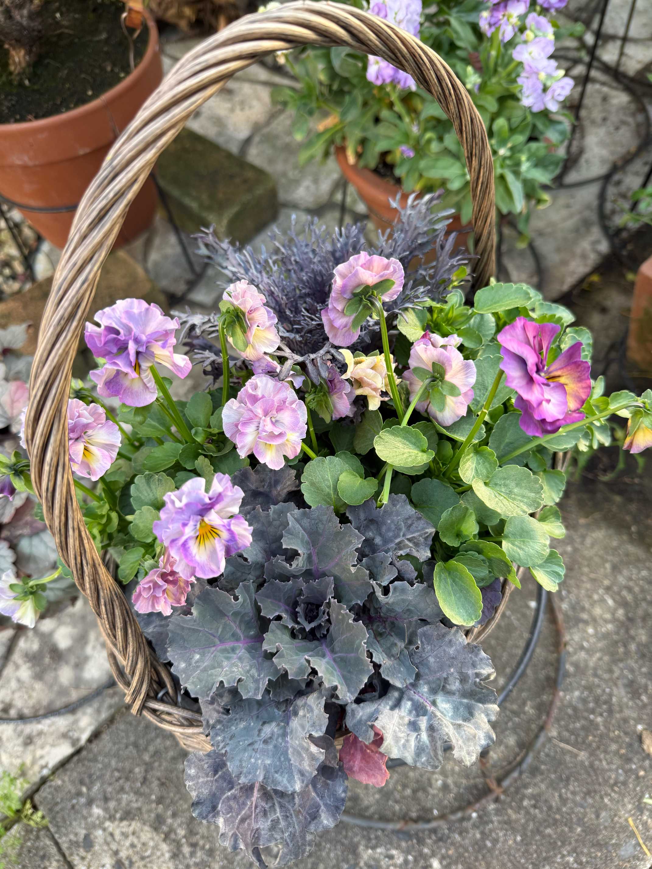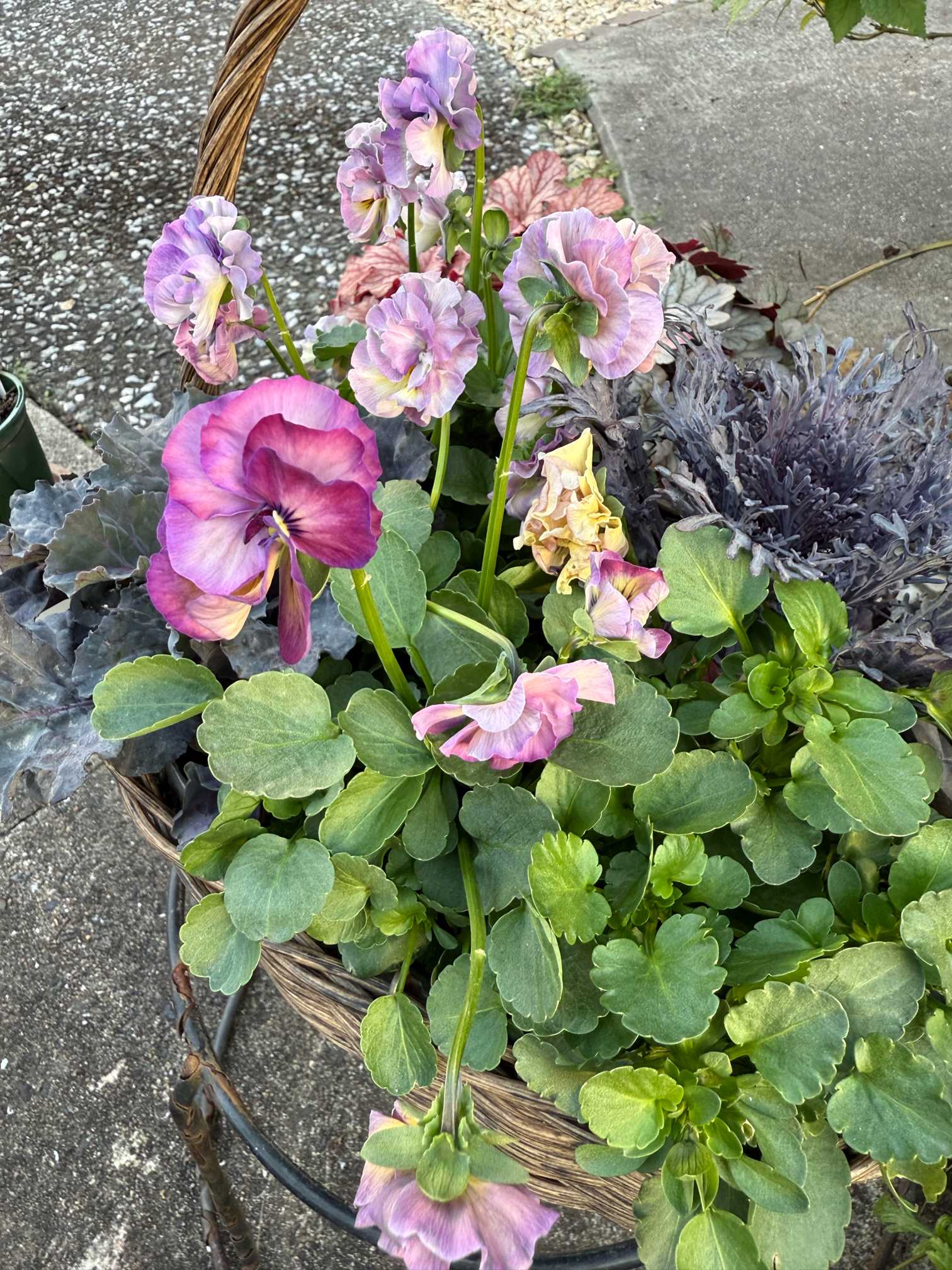洗えるカゴにケール2株とジャーニー3株の寄せ植え