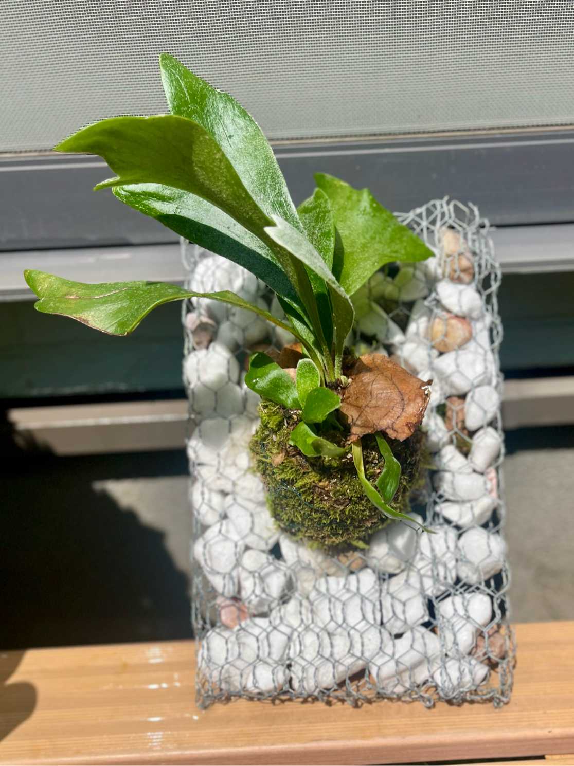 苔玉についてるコウモリランをいつか板付けするつもりが、ネットで見た金網付けに興味を惹かれ、作ってみることにしました。