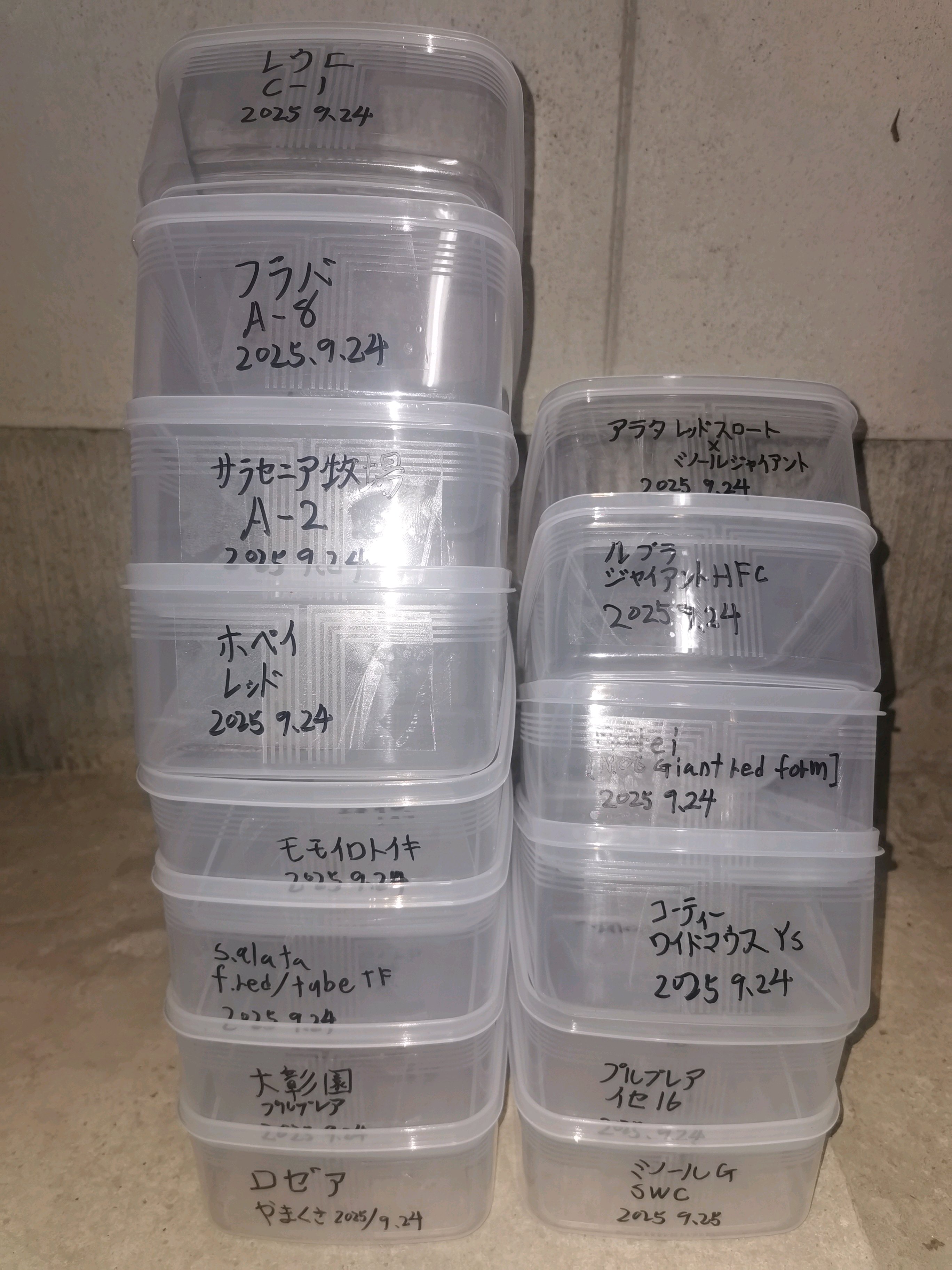 まずダイソーで食品を保管するタッパーを購入しテープに日付と品種名を記載して貼り付けます