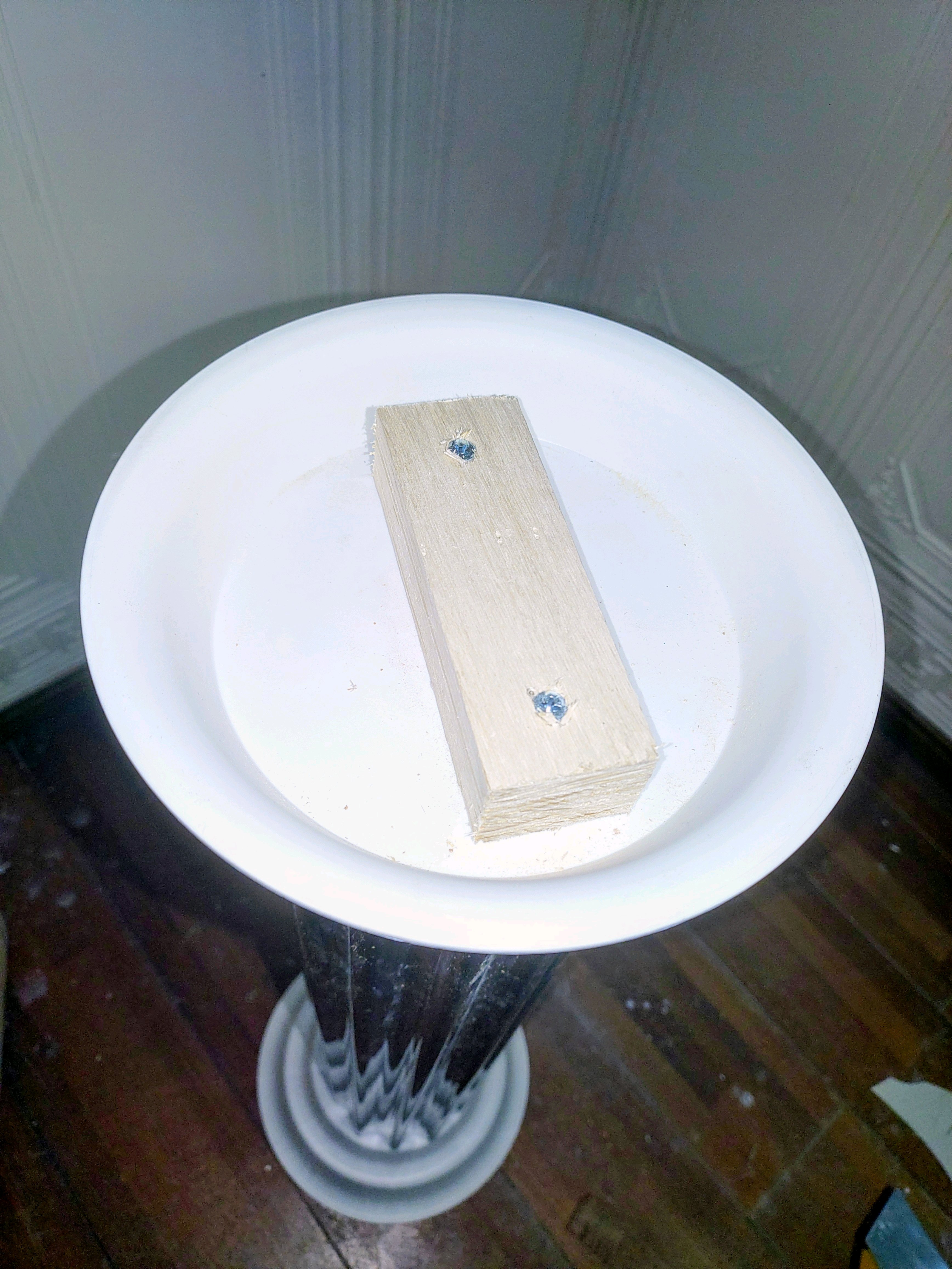 垂木を小さい鉢底皿にビスで止めて