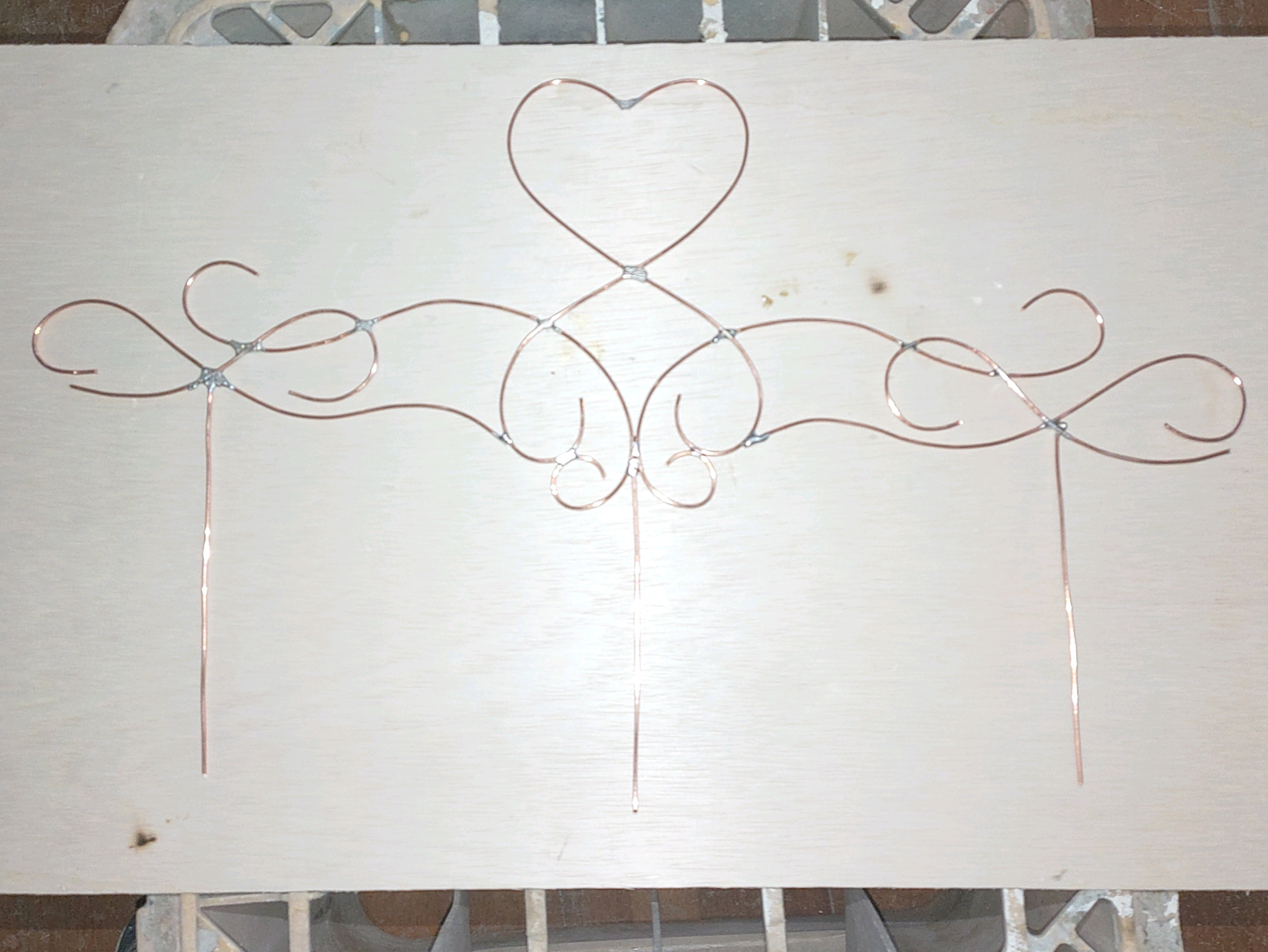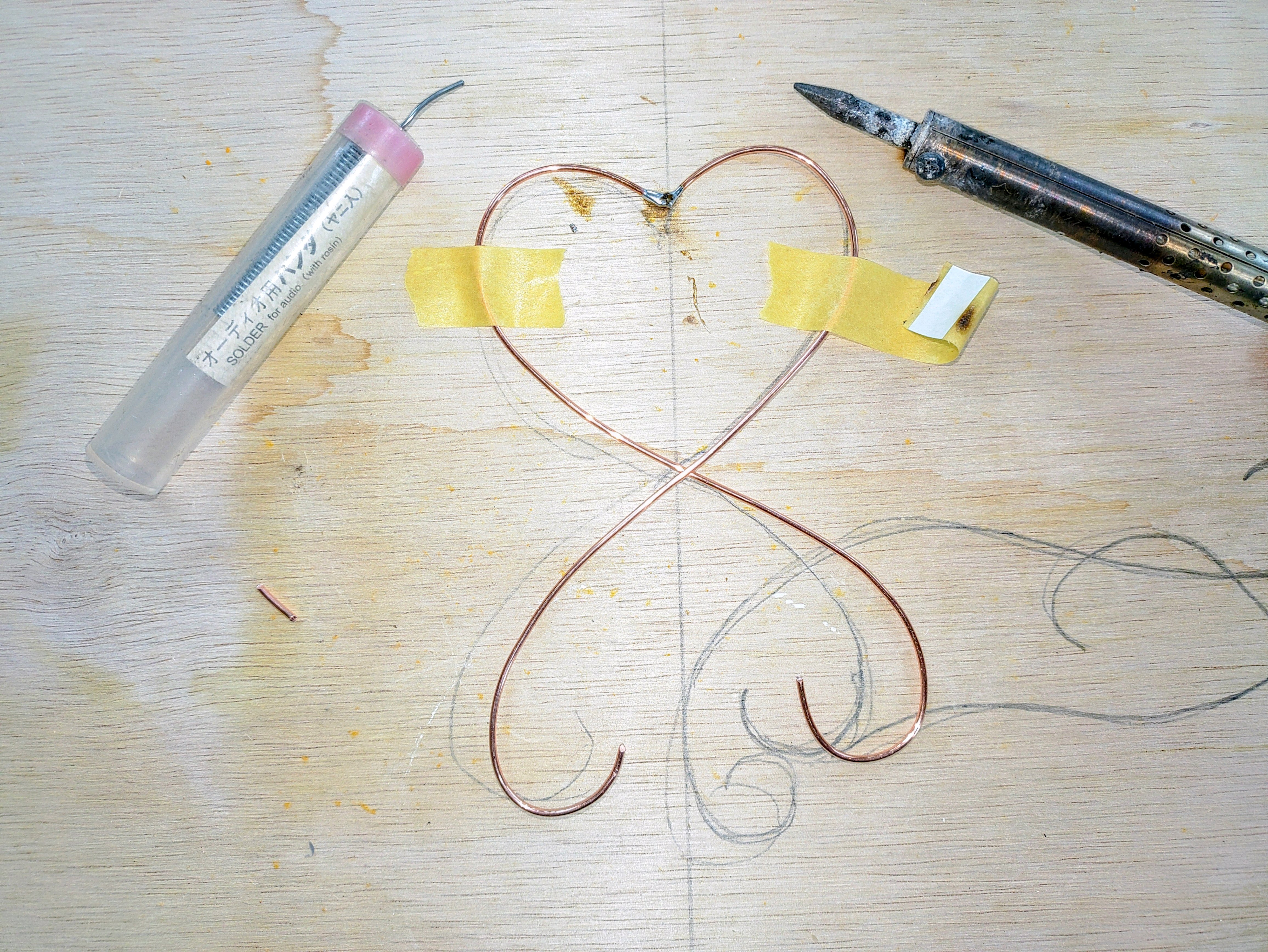 適当にデザインを板に書いて 銅線をハンダ