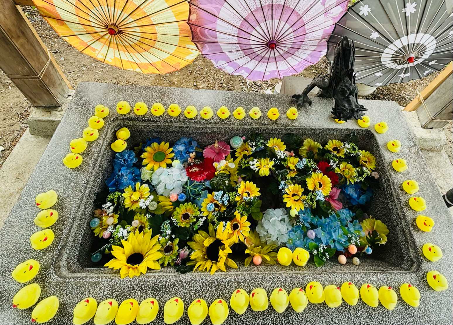 クン活でいつもお花をチェックするサスケ。犬と花の好きな人用、ゆるいみどり