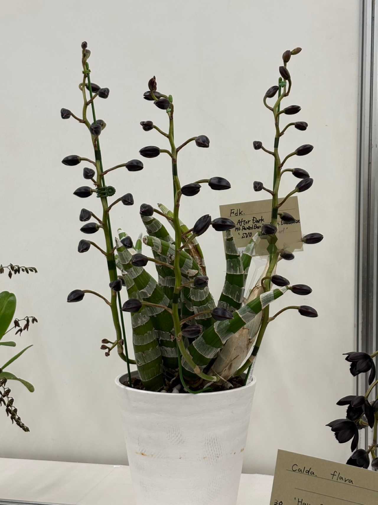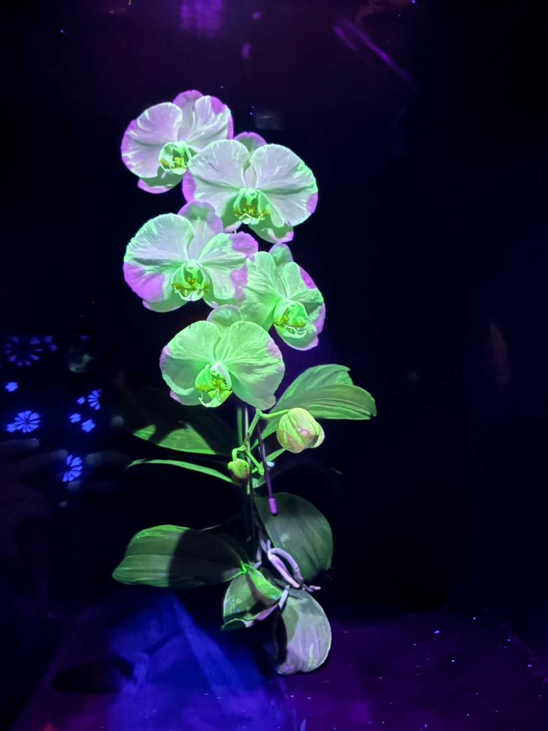 2024年に初公開した「光るコチョウラン」が再展示!ブラックライトを当てると、花を含む植物全体が黄緑色の強い蛍光を発し、暗がりでも鮮やかに輝きます。 幻想的で美しい蘭をこの機会に是非ごらんください。と説明書き( ..)"