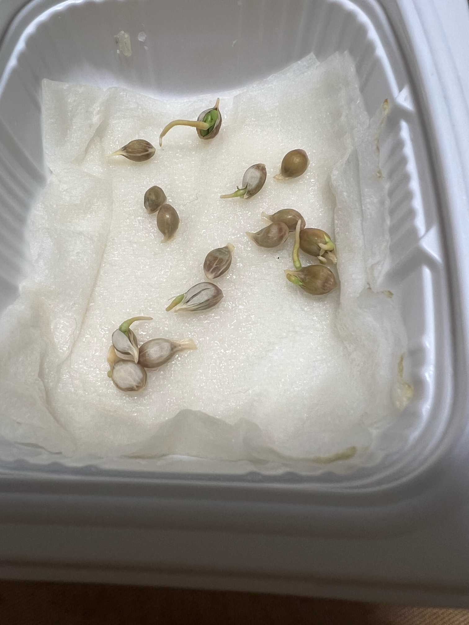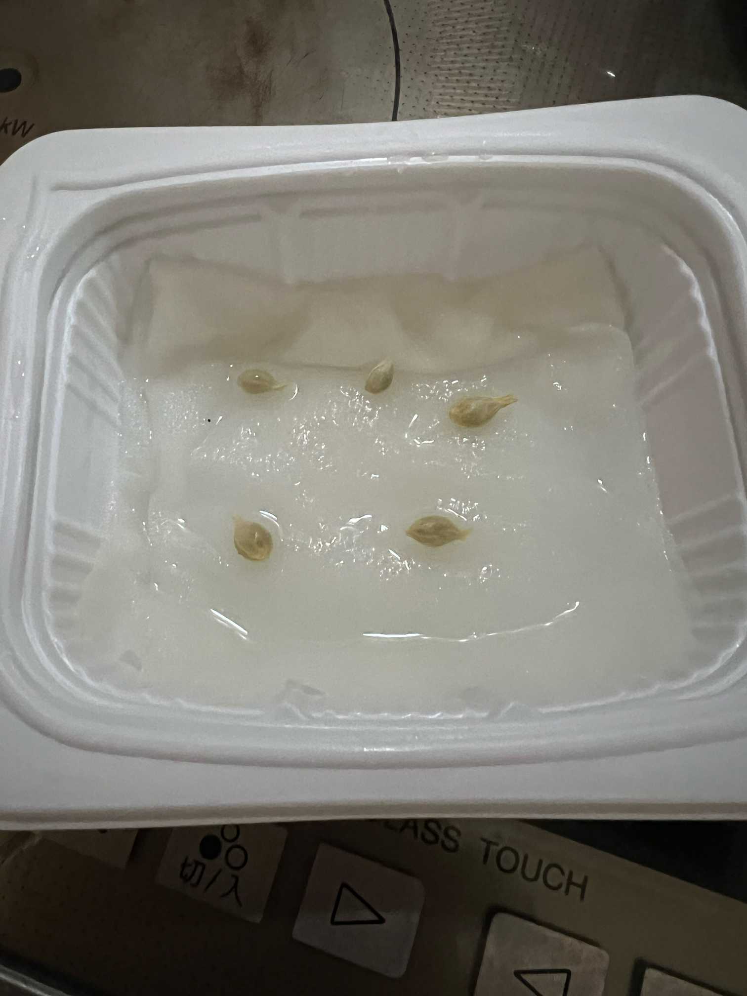 ごはんのパックにキッチュペーパーを敷き、種を置きました。