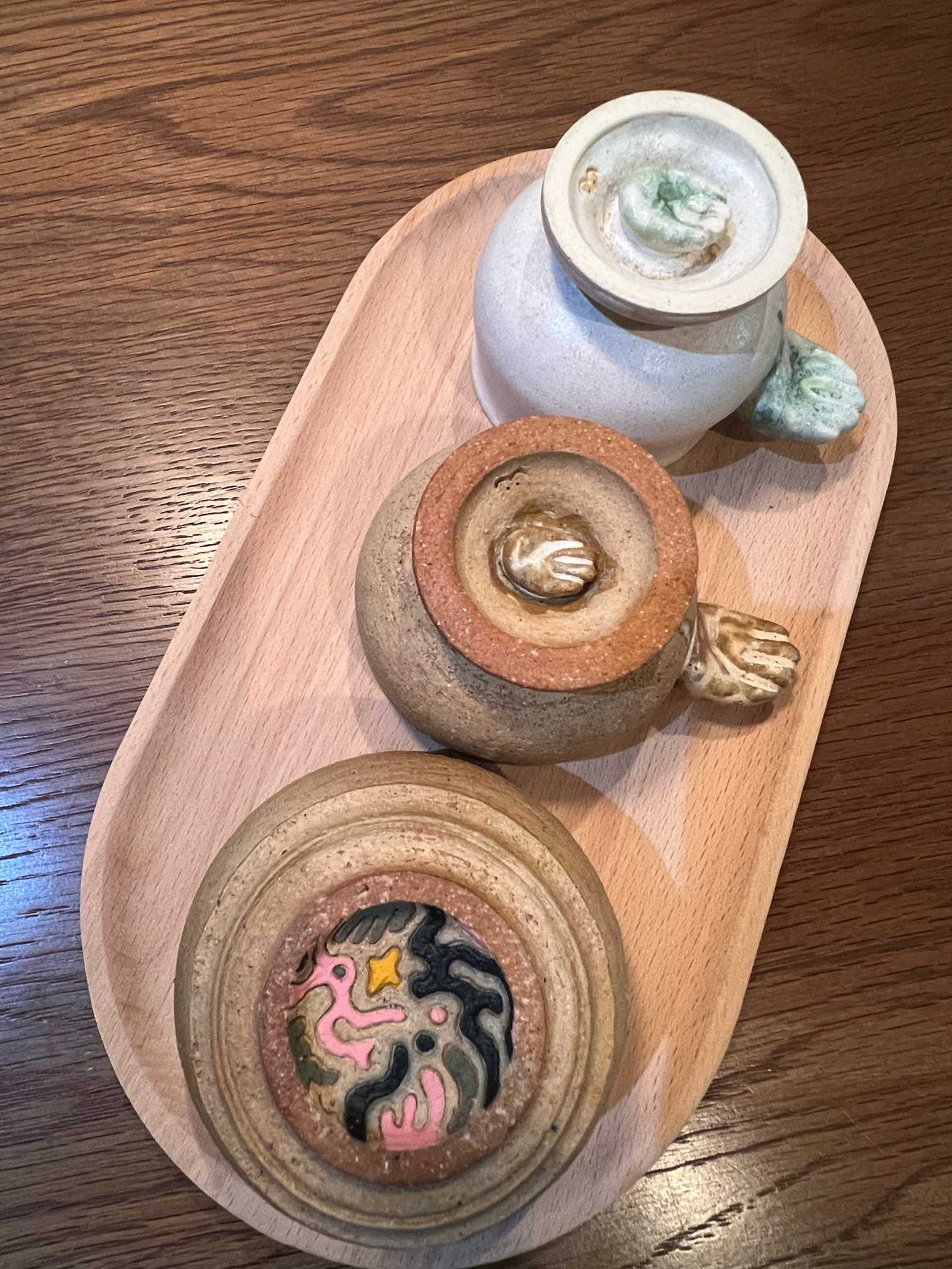 福岡はお洒落なお店が建ち並ぶ薬院『クレマチスの香』での9人展。違う作家さんが個性的なカップやマグを出展なさっていました。作風や技法も色々で見応えあり