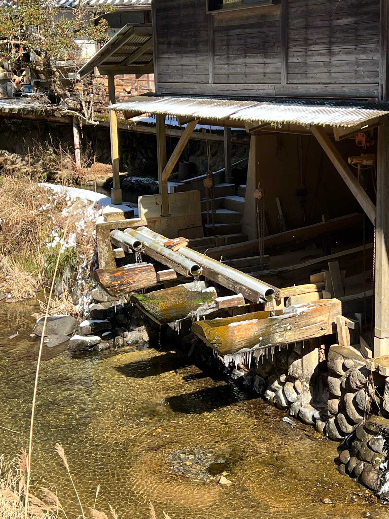 川の水を利用して土を叩く唐臼(からうす)。つくばいのように水が溜まると首を下げ川に水を戻すと頭を擡げます。子どものように時間を忘れて見入ってしまいました