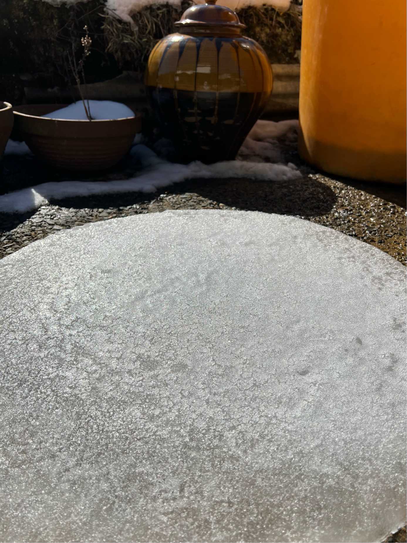 大きなバケツに張った氷は4㌢はあろう厚さ
