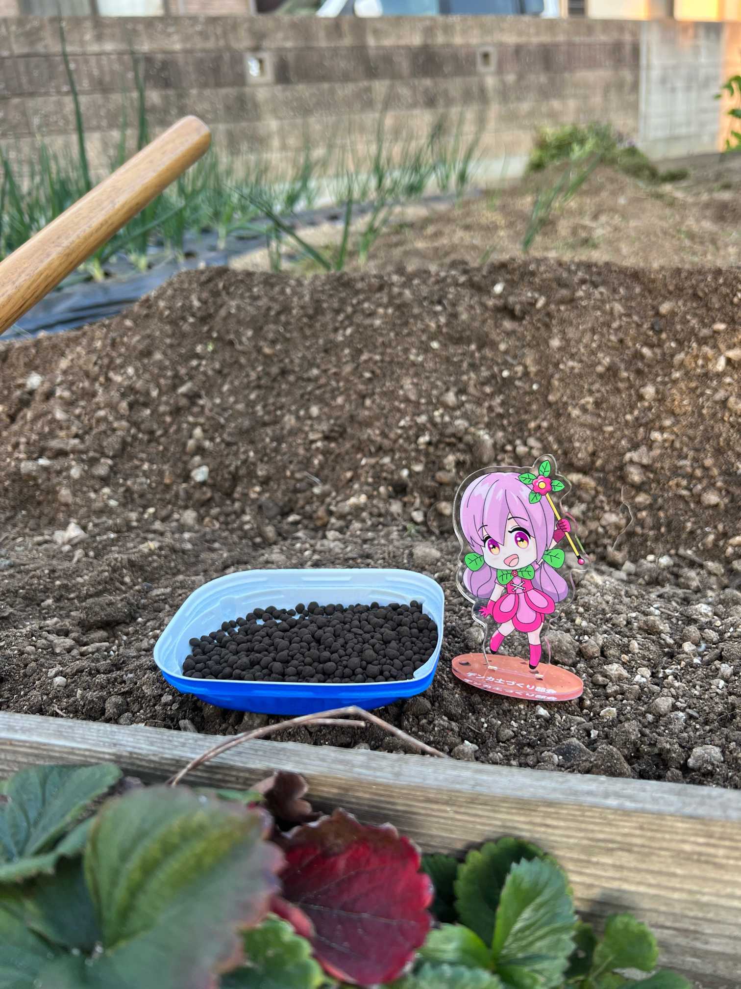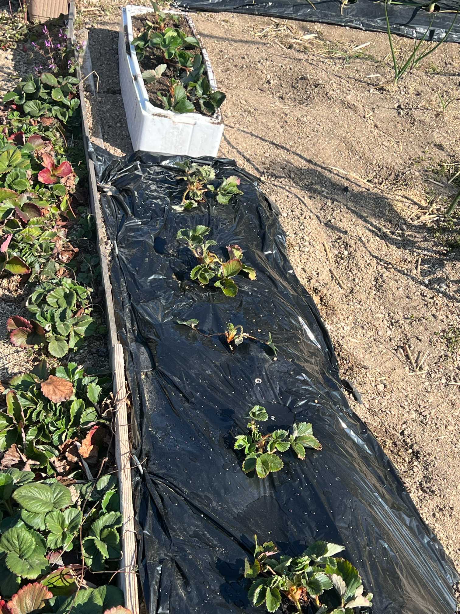 畑にアヅミンを混ぜ込みイチゴの苗を植える