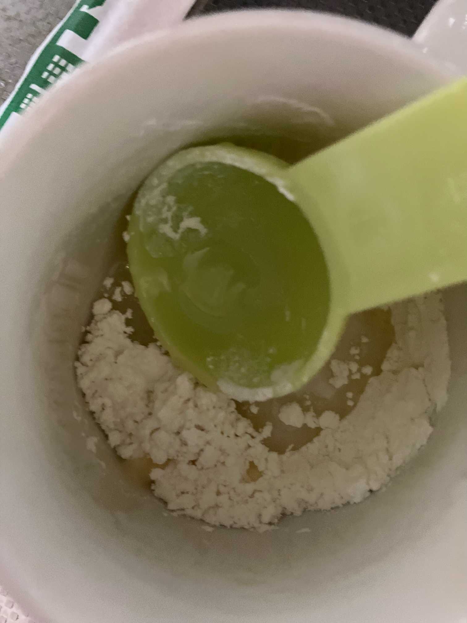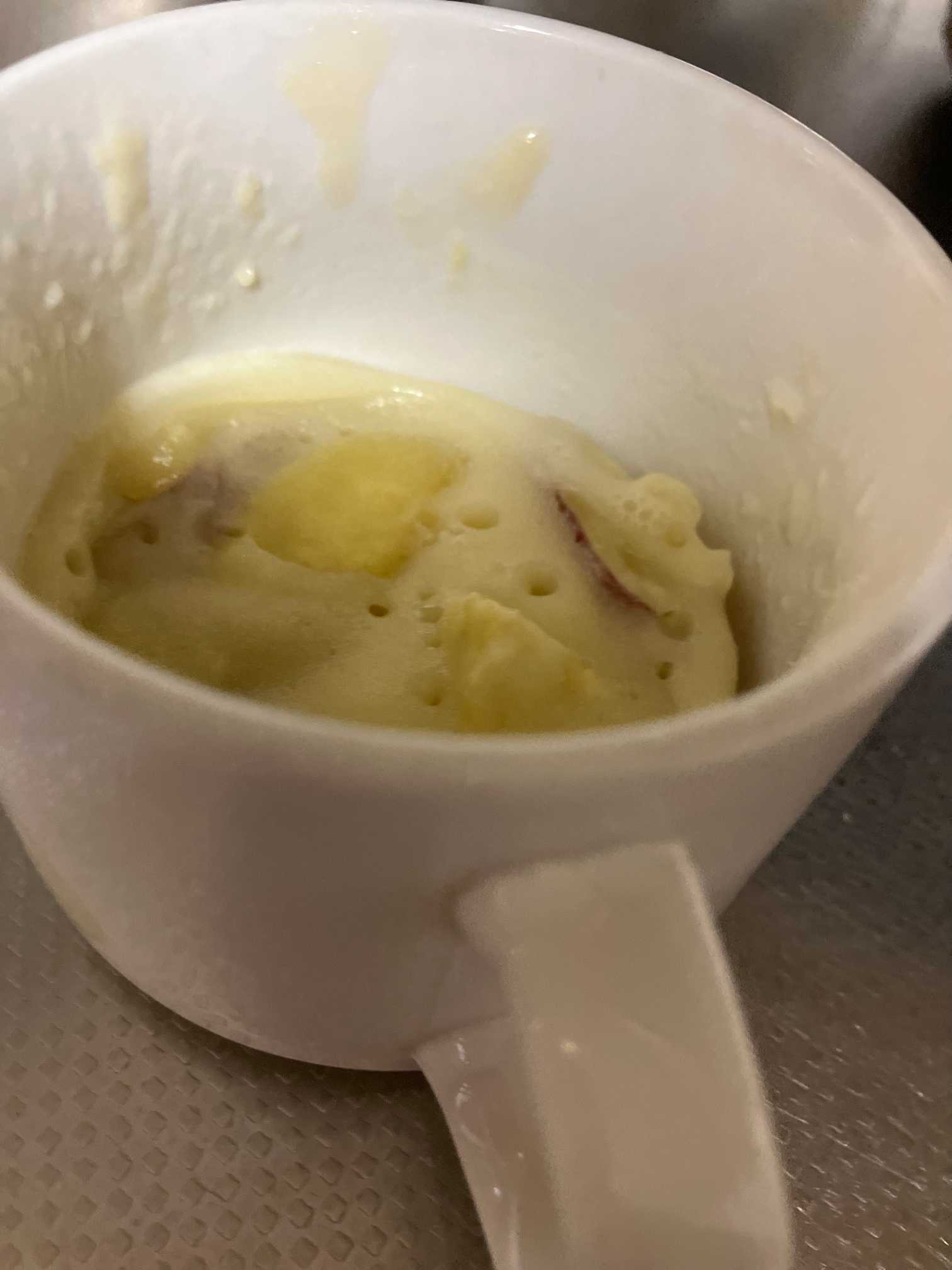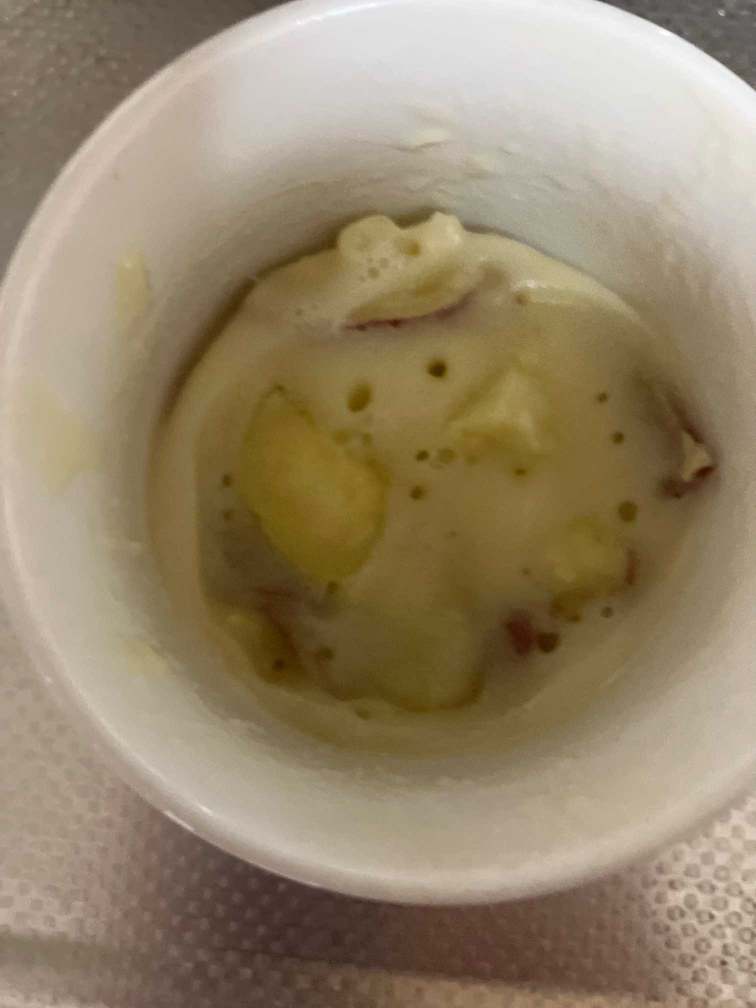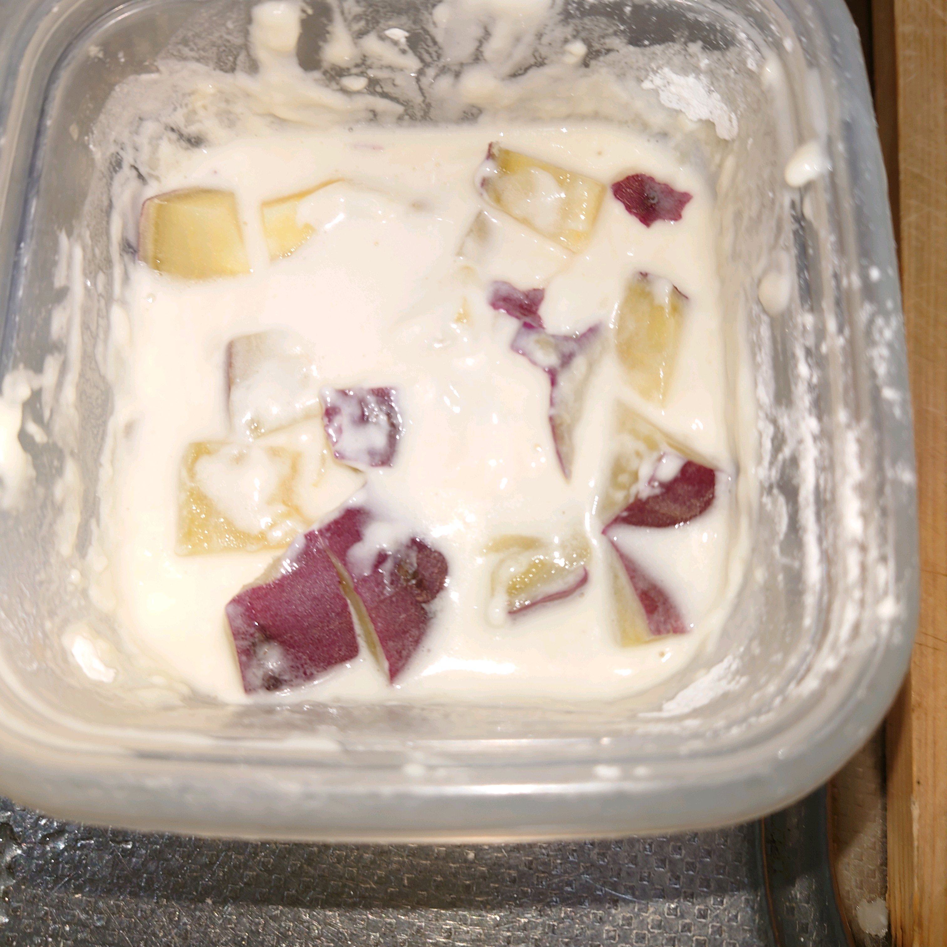 グラタン皿に てんぷら粉 さつまいも はっさくママレードの汁を入れて 混ぜます