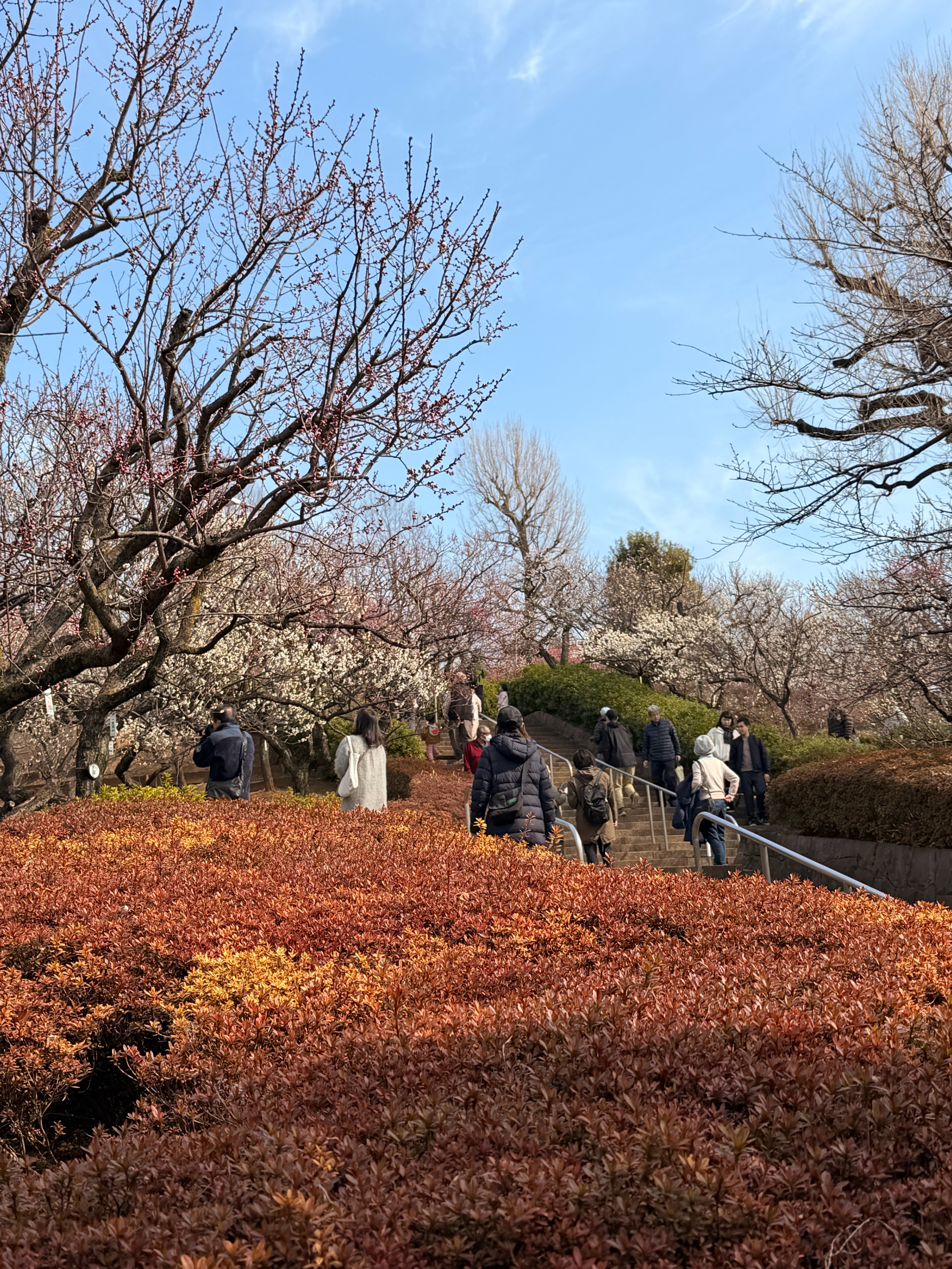 なっていて、階段や通路を登っていくと細い通路になっていて、左右に紅白の梅が植えられていて