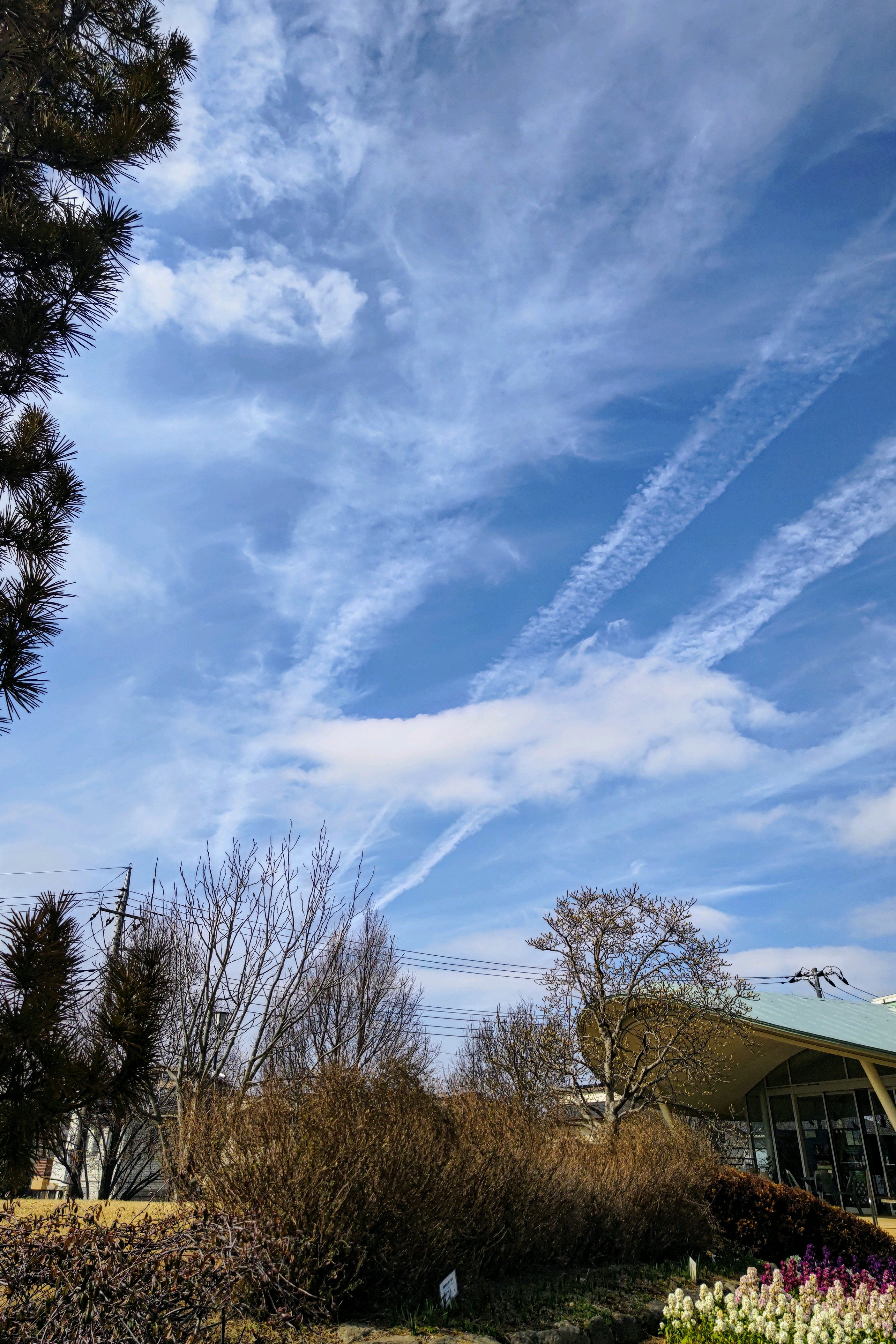 飛行機雲の広がる空