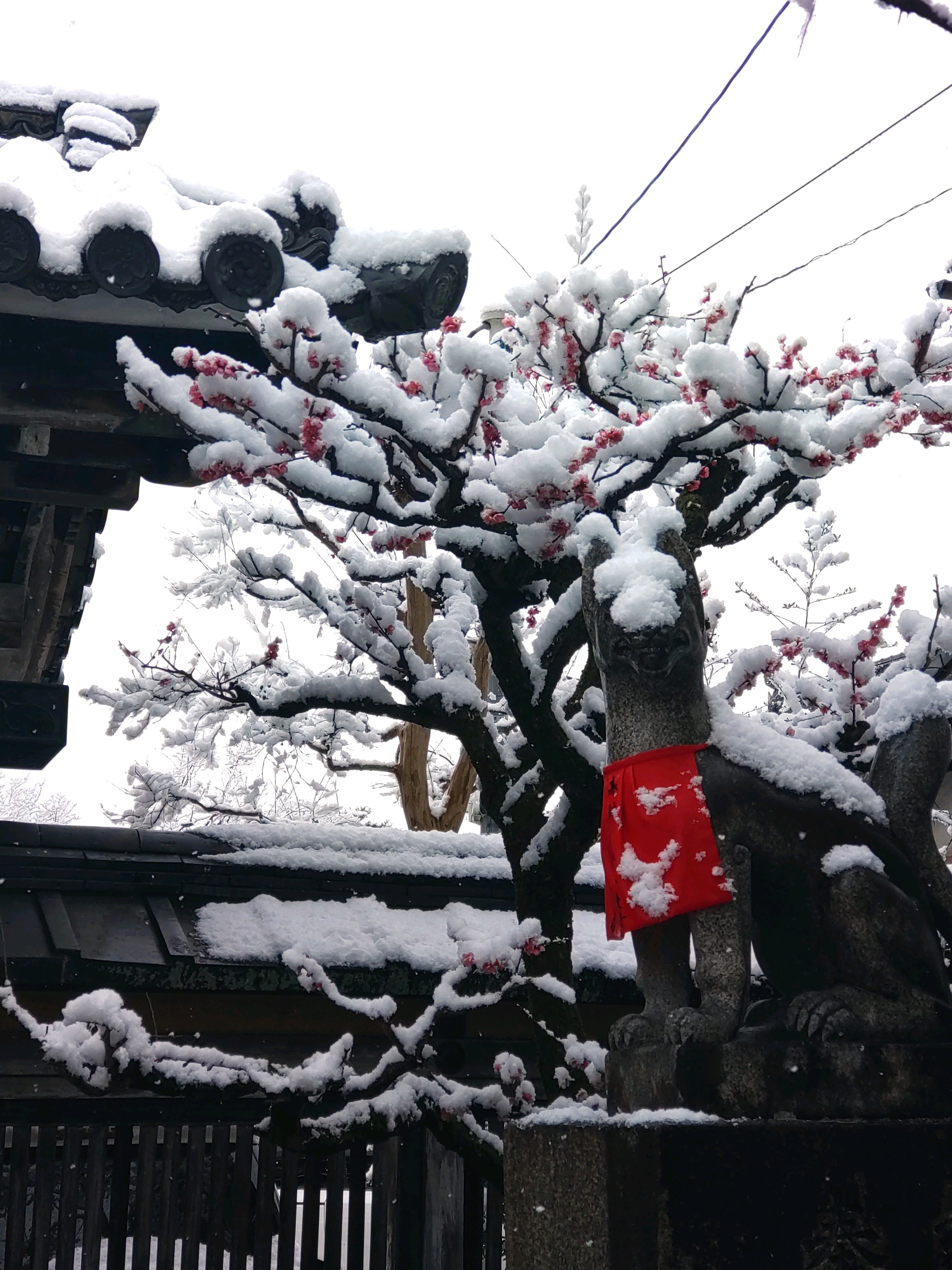 豊川稲荷のお狐さんの顔面に積もる雪