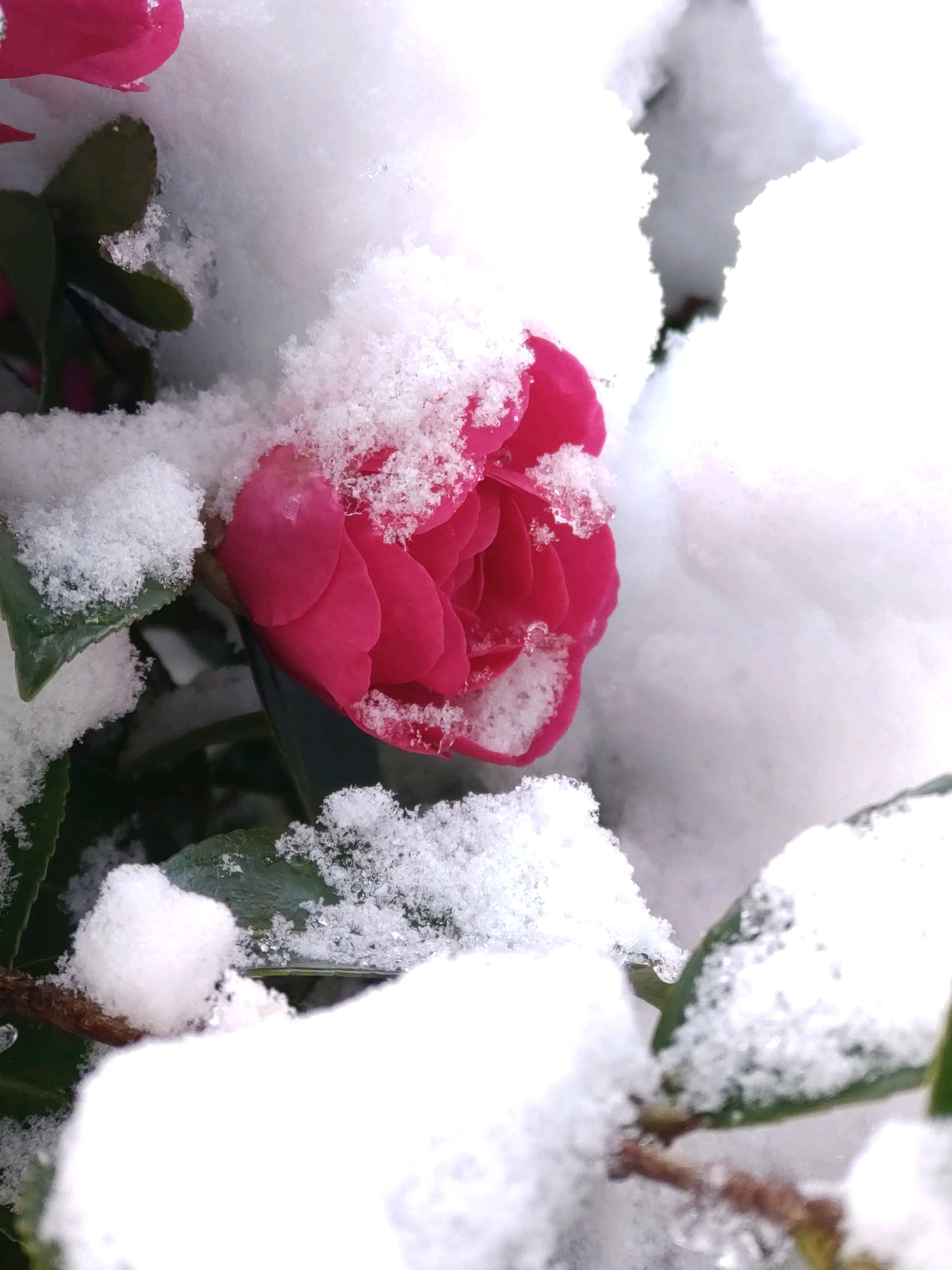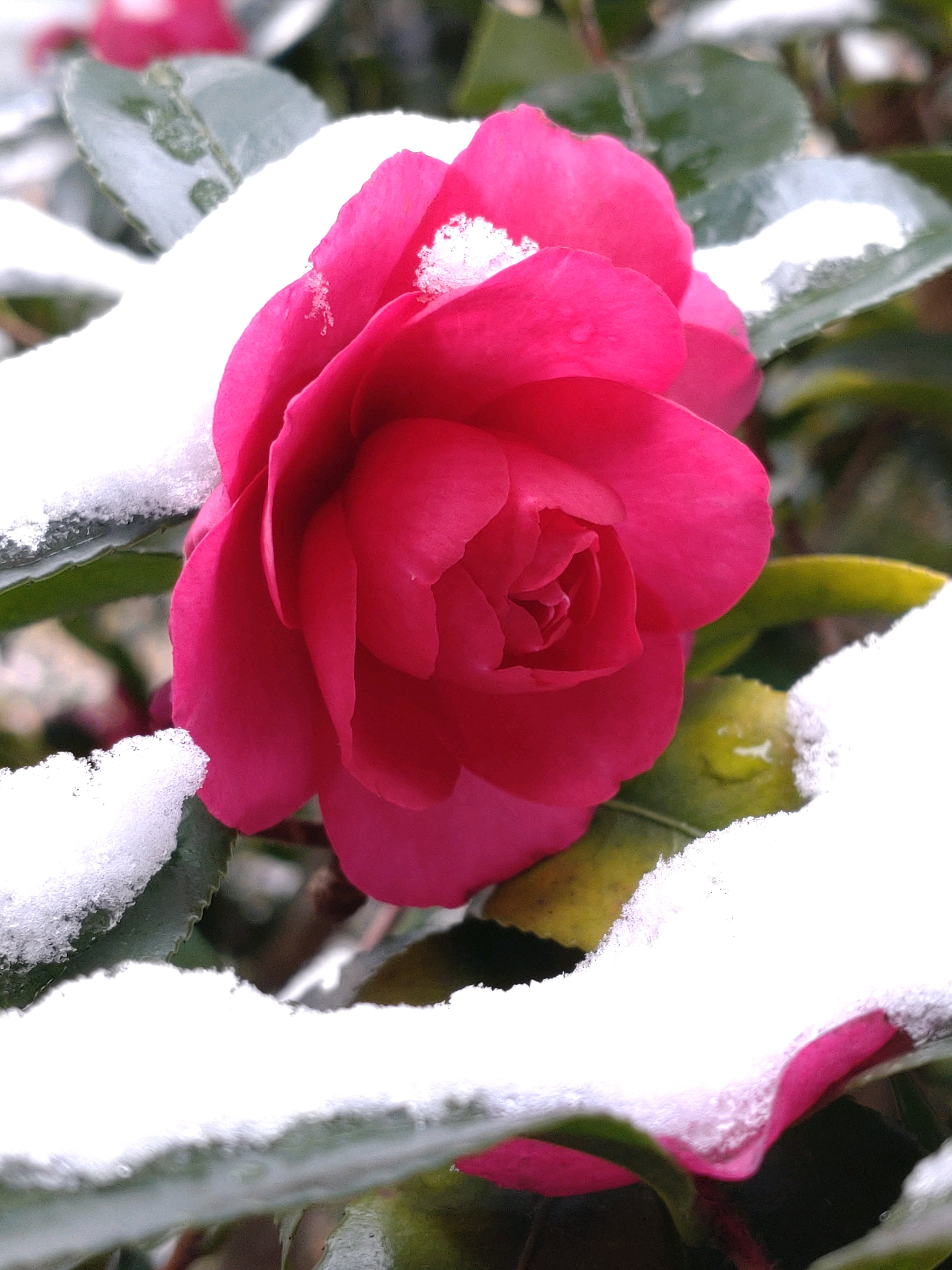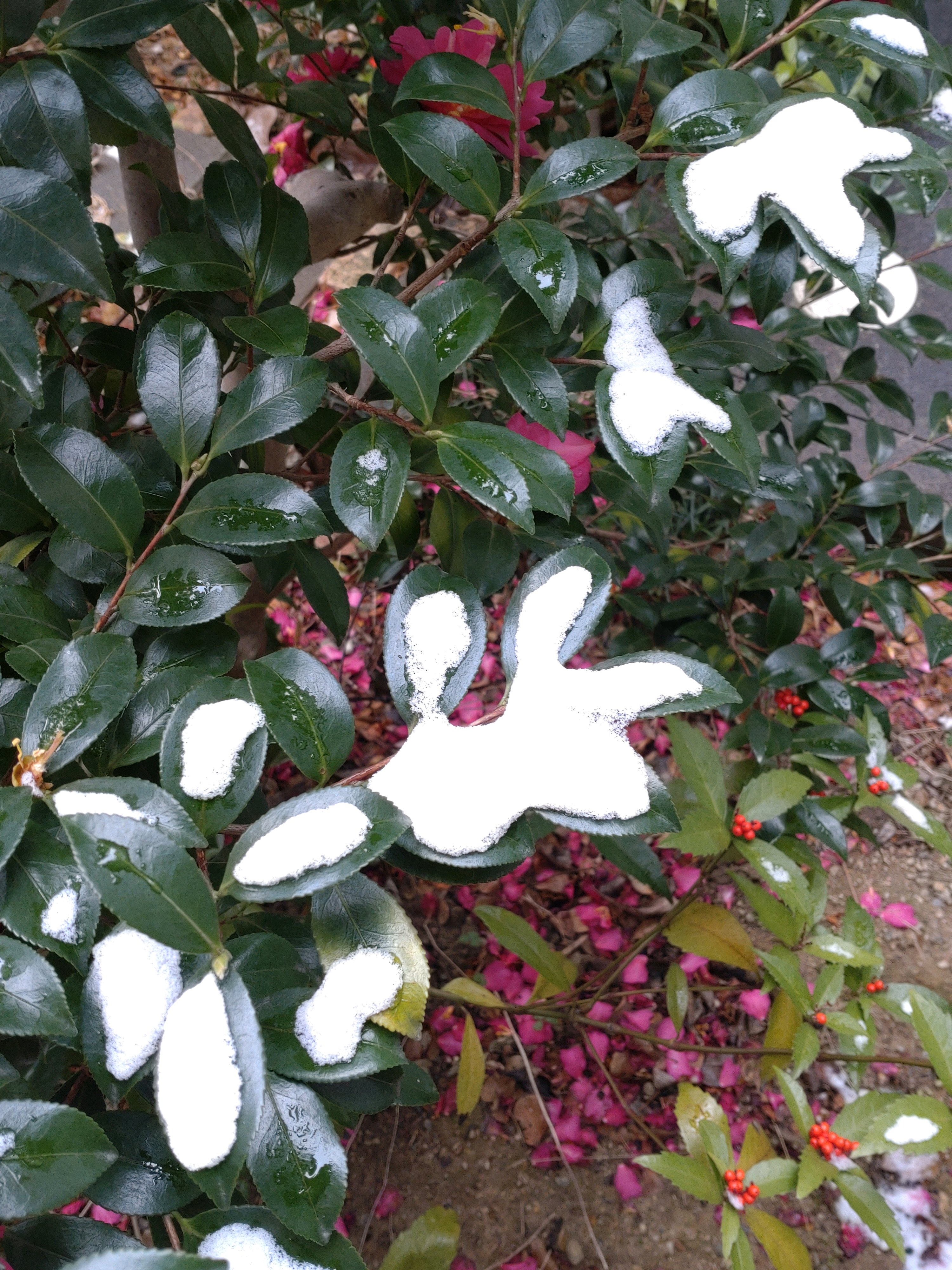 サザンカの葉に雪が残っている姿が