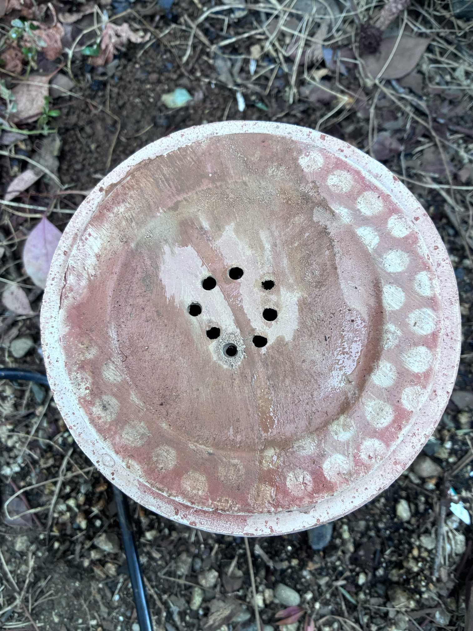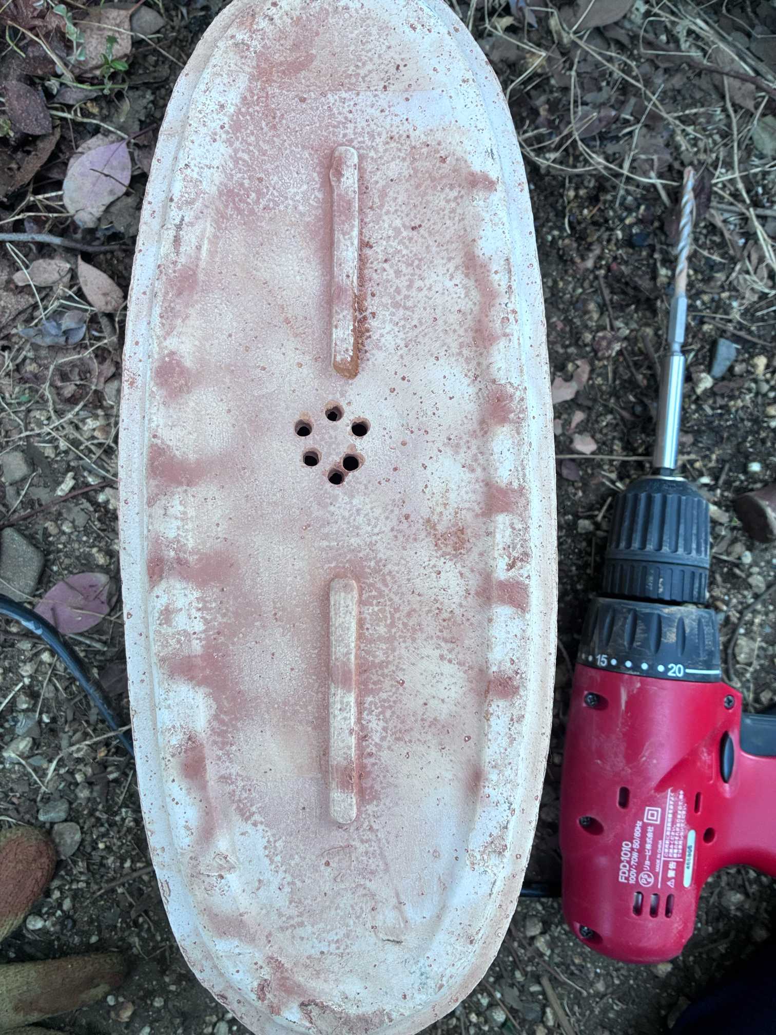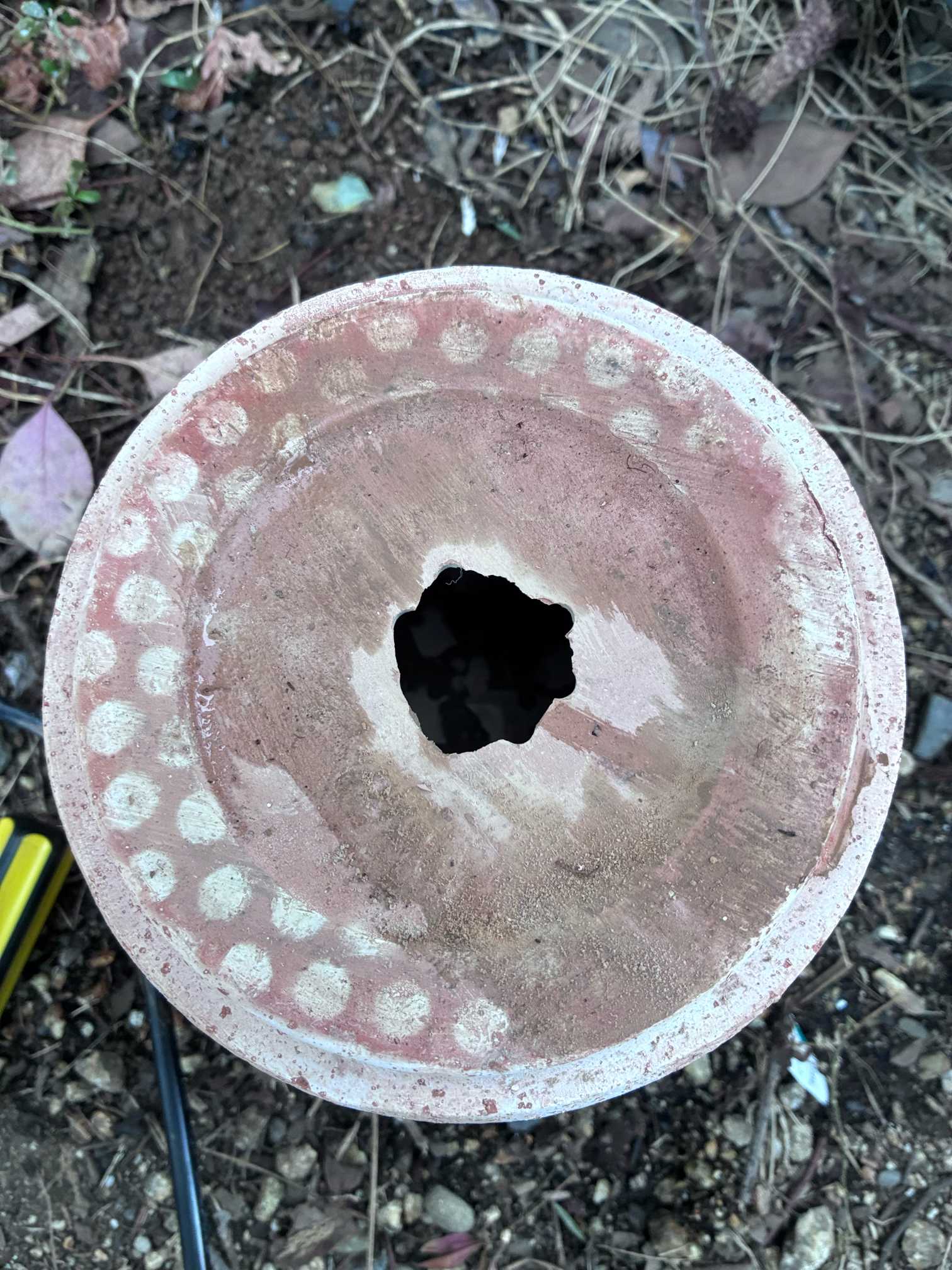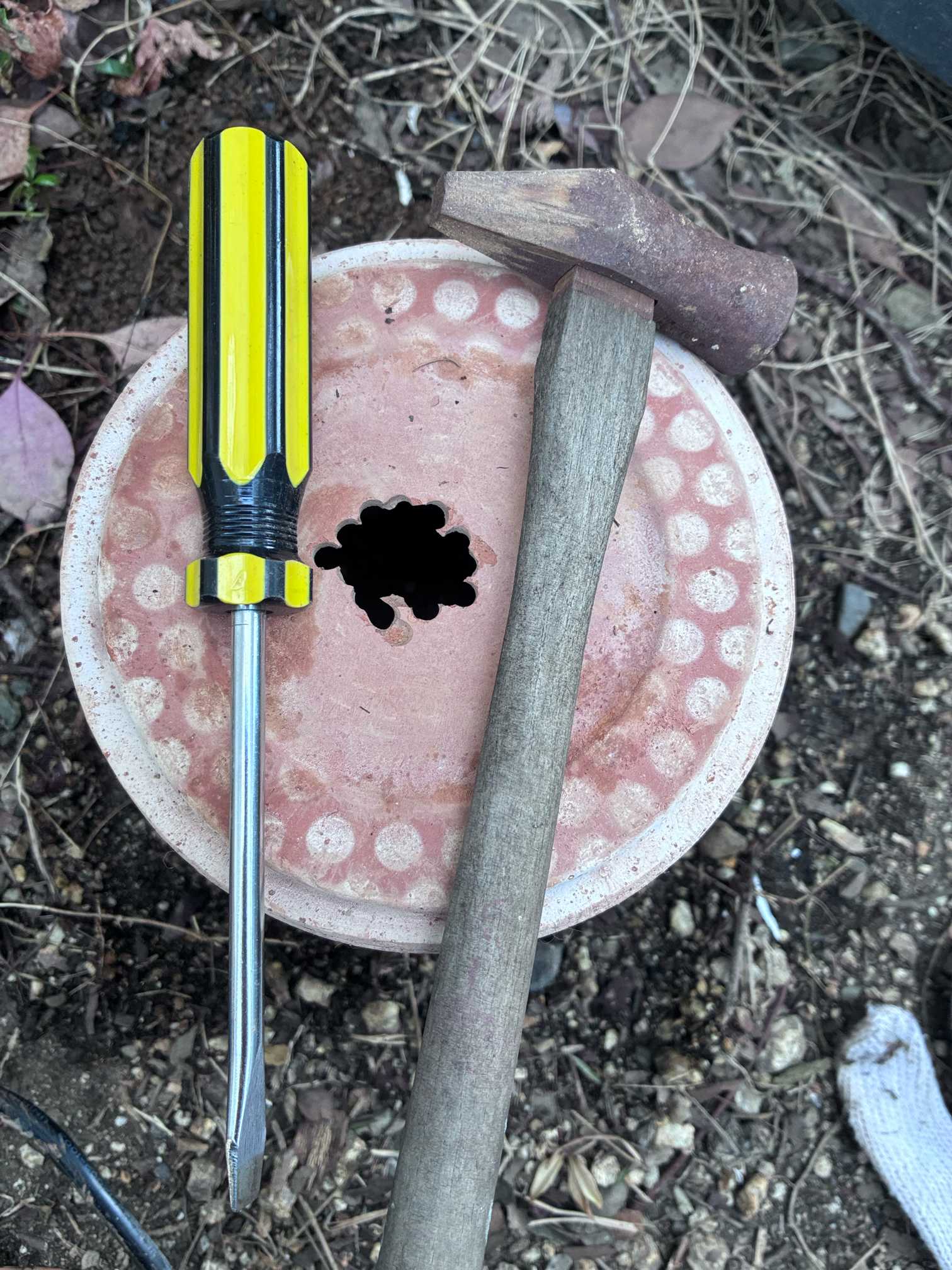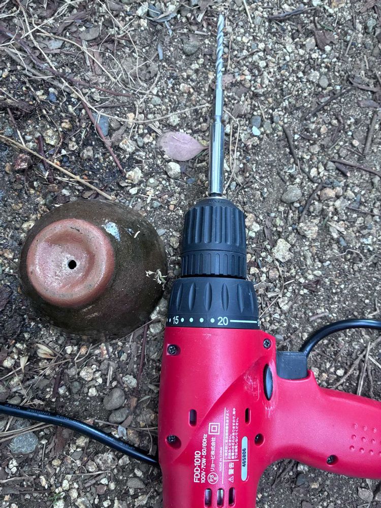あらかじめネットで開け方を調べていたけど、電動ドライバー自体をほとんど使った事がないので、鉢が割れないようにおっかなびっくり水を掛けながら穴を開けていきました。