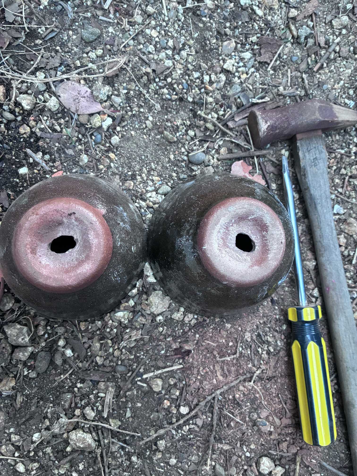 穴を2つ開けて、マイナスドライバーを当ててトンカチ🔨で穴を広げました。