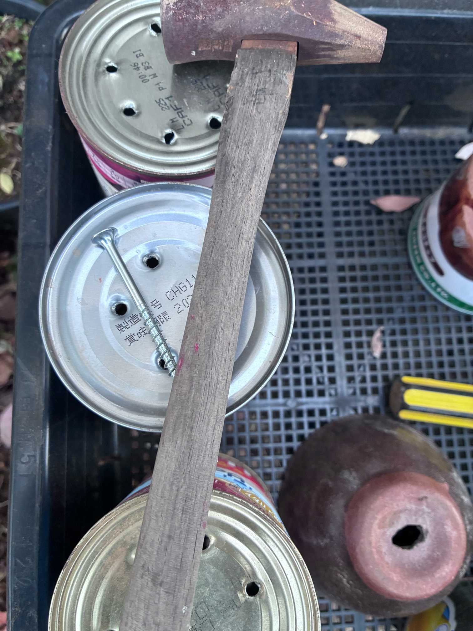 ついでじゃ〜と何年も放置していた空き缶の穴あけも実施😤