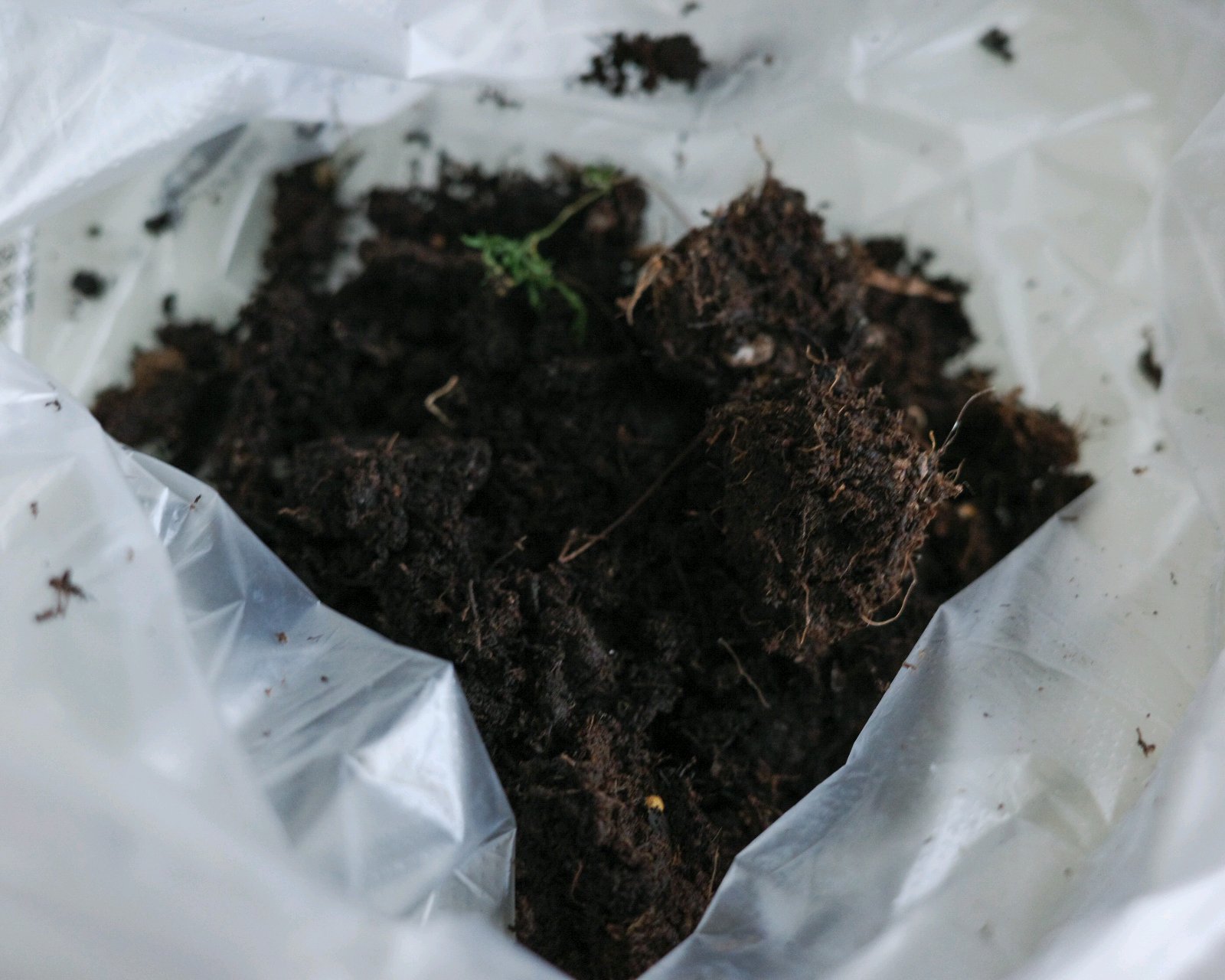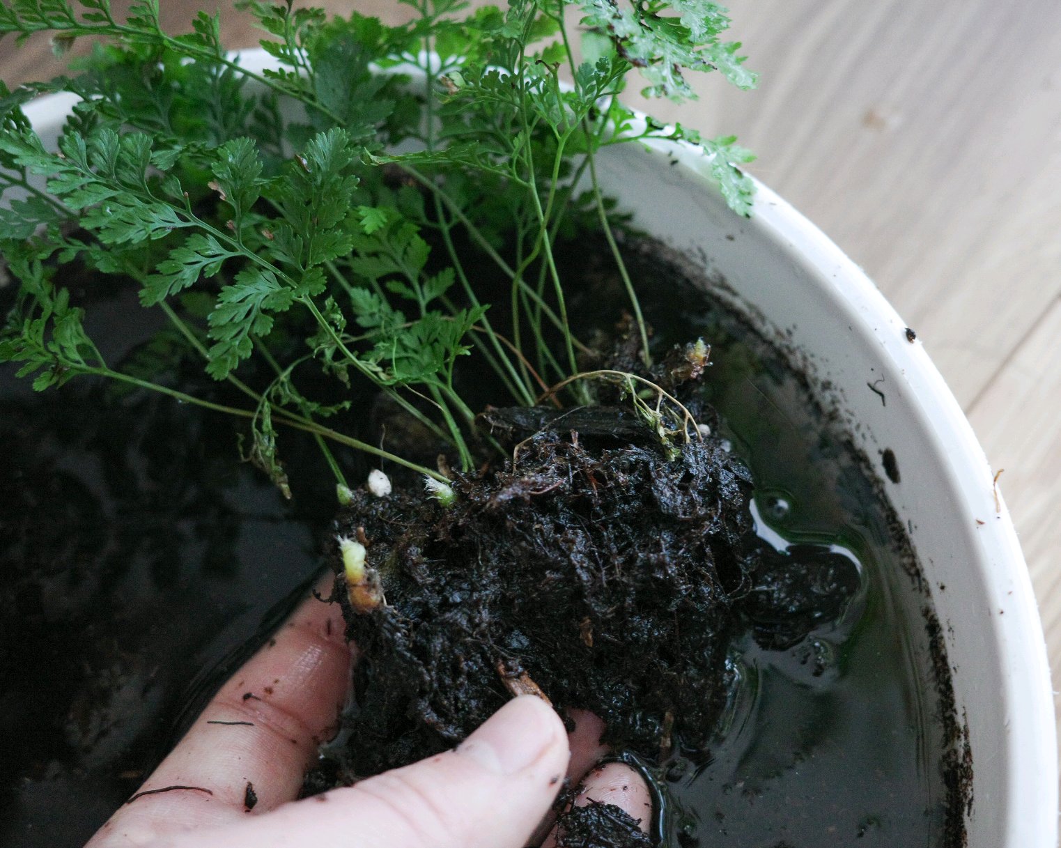 ビニール袋の中でポットから出して、根をキズつけないように水の中で出来るだけ土を落としていきます。
