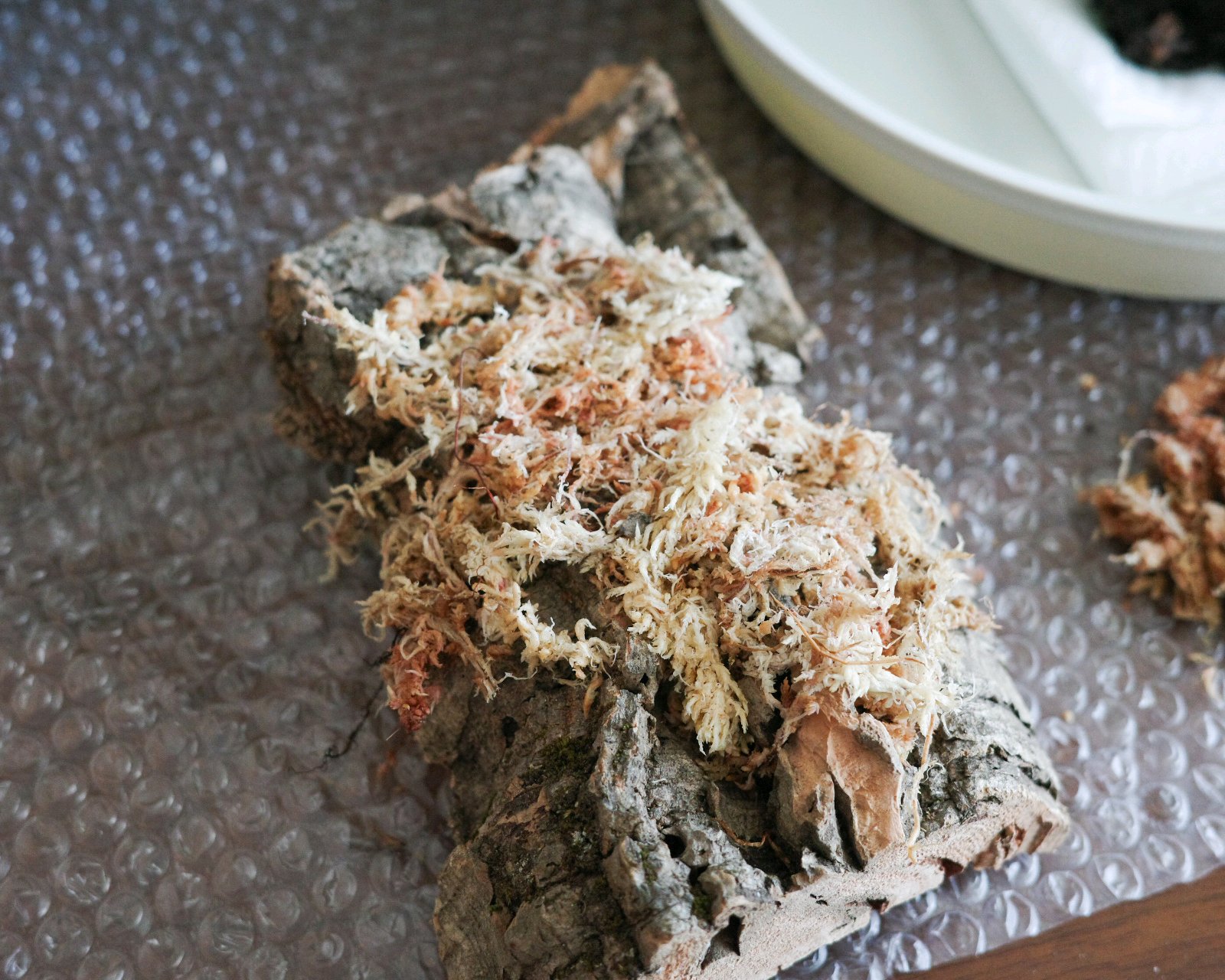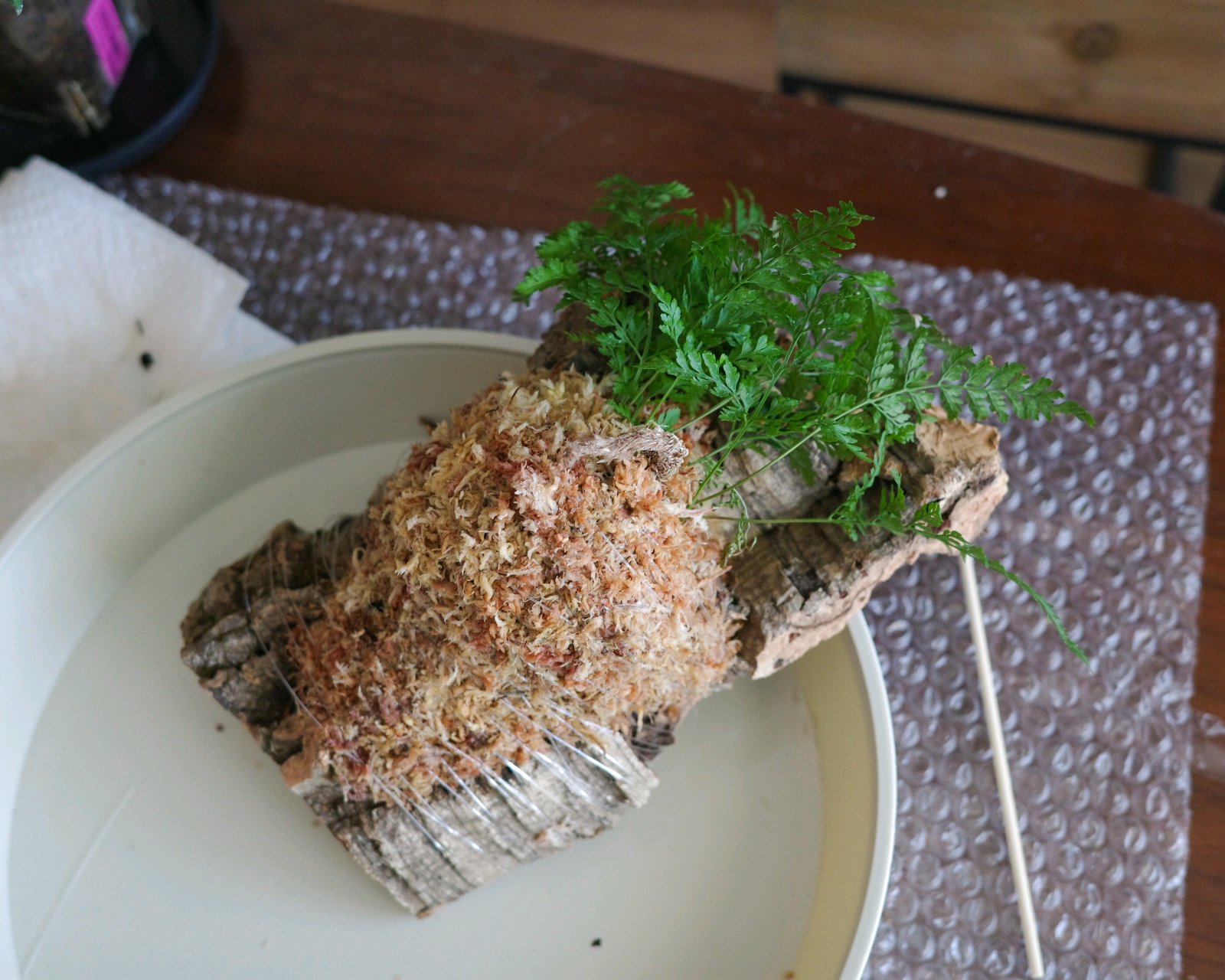 まずはコルクの上にあらかじめ水分を吸わせてから水滴が落ちないようにぎゅっと絞った水苔をうすーく広げます。