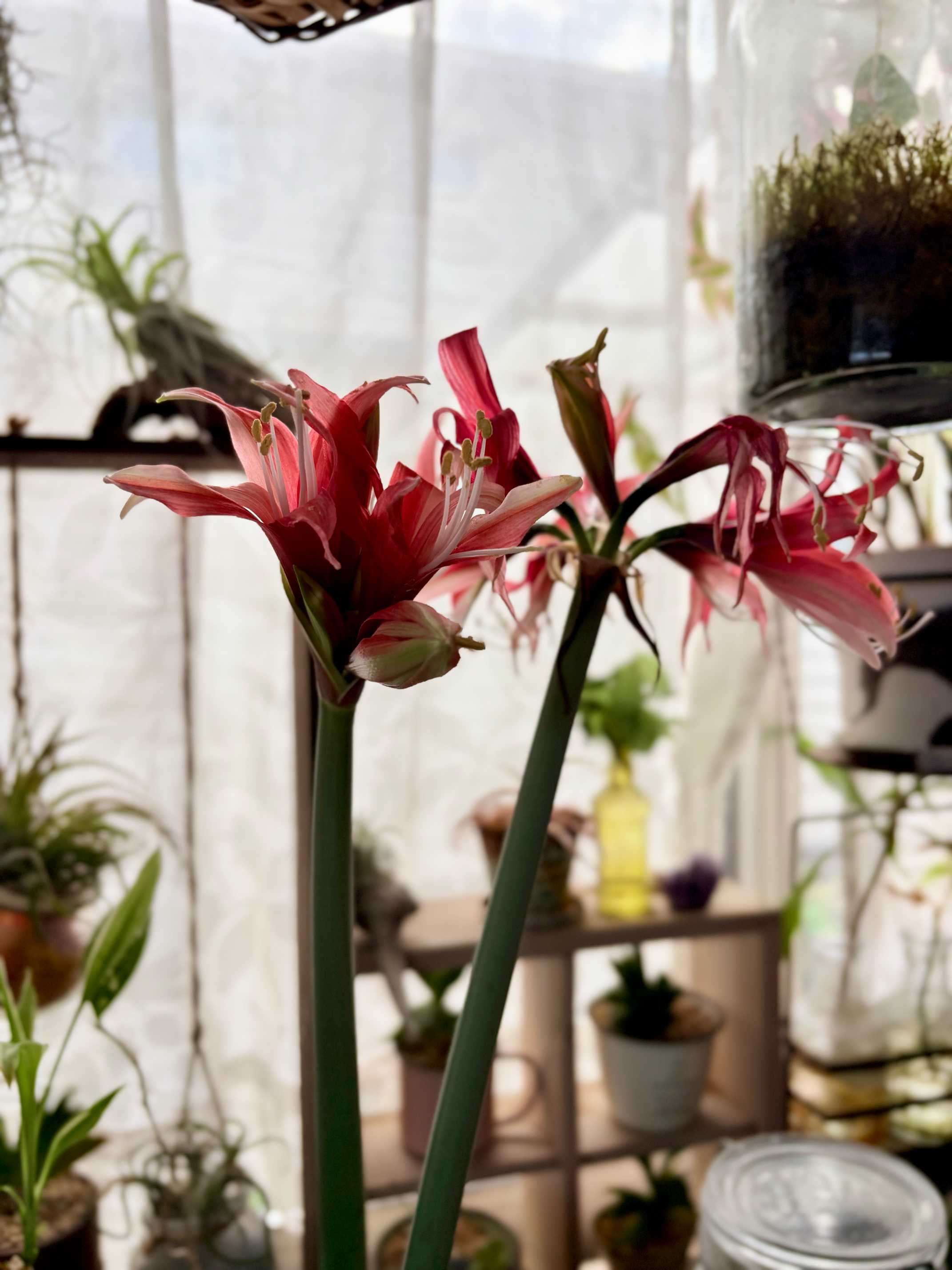 マジックアマリリスとはオランダの生産者さんが開発した、土も水もいらない、球根に蓄えられた栄養だけで開花するアマリリスのこと。