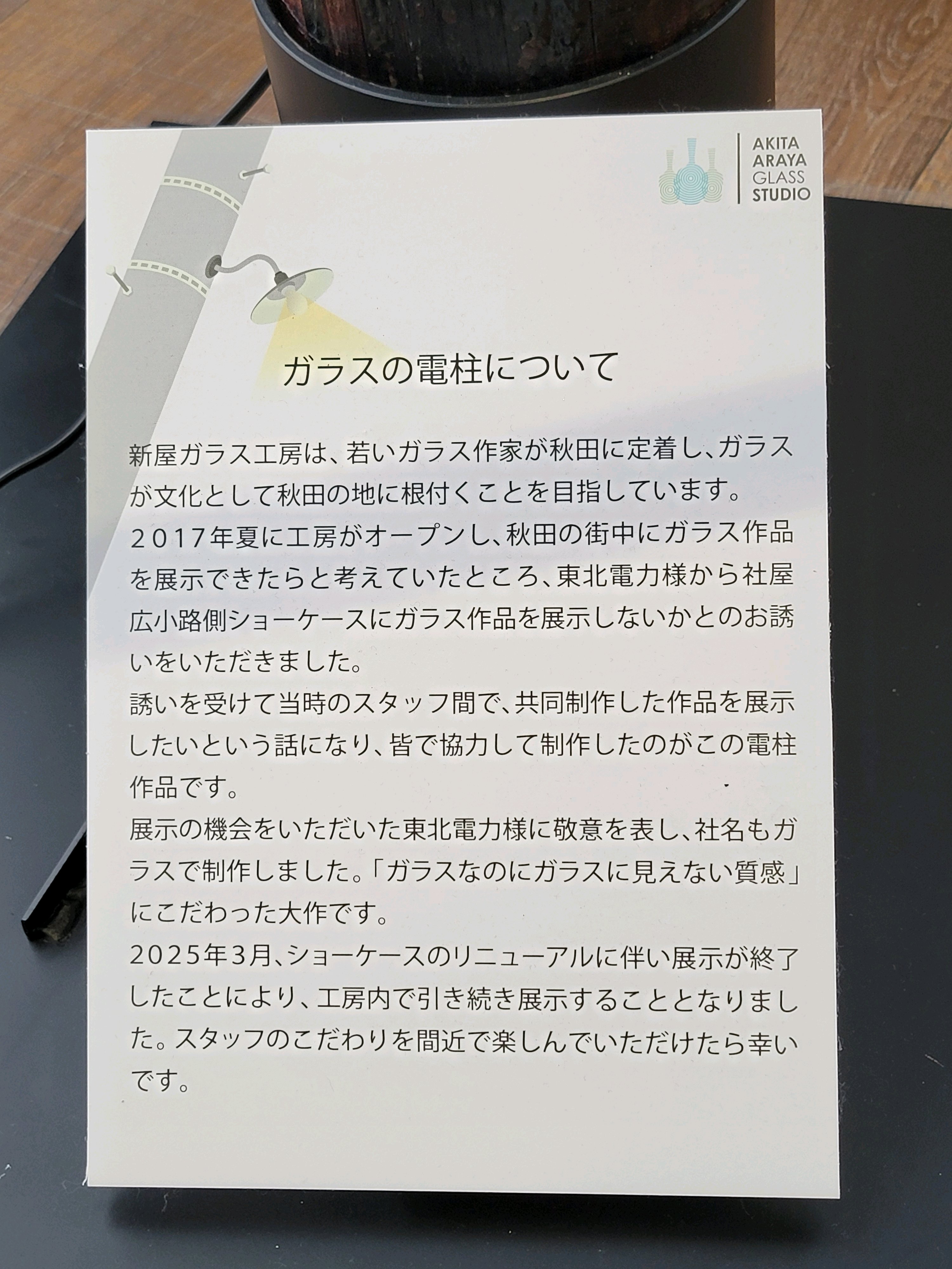 展示の機会をいただいた東北電力様に敬意を表し、社名も ガラスで制作しました。 「ガラスなのにガラスに見えない質感」 にこだわった大作です。