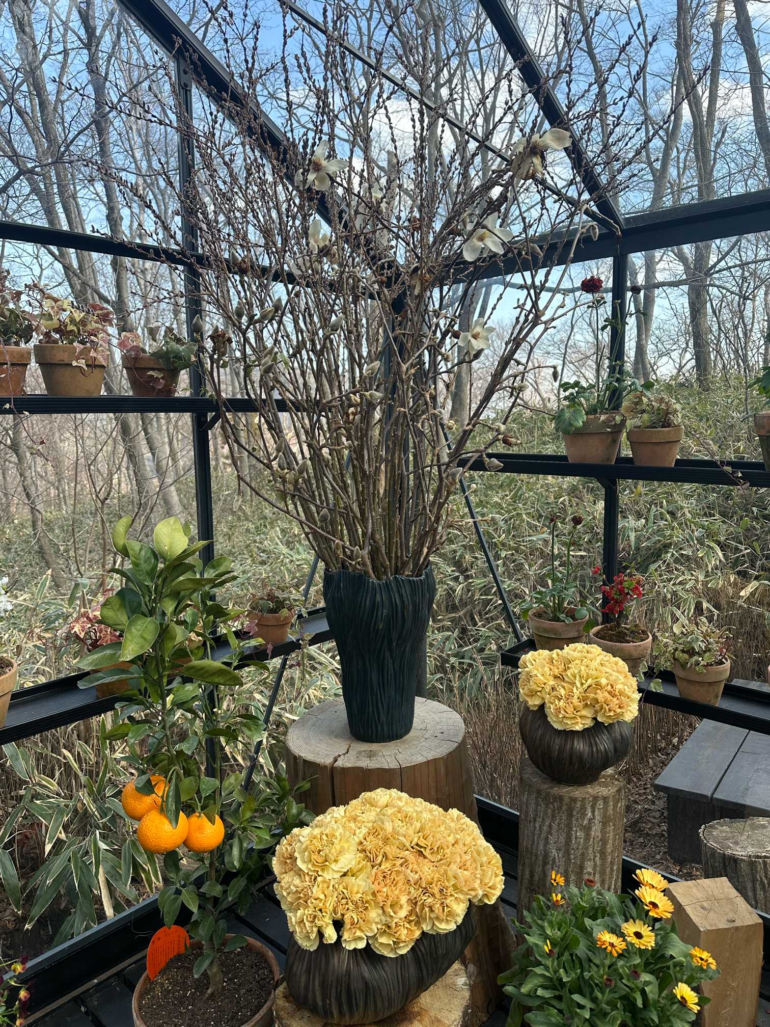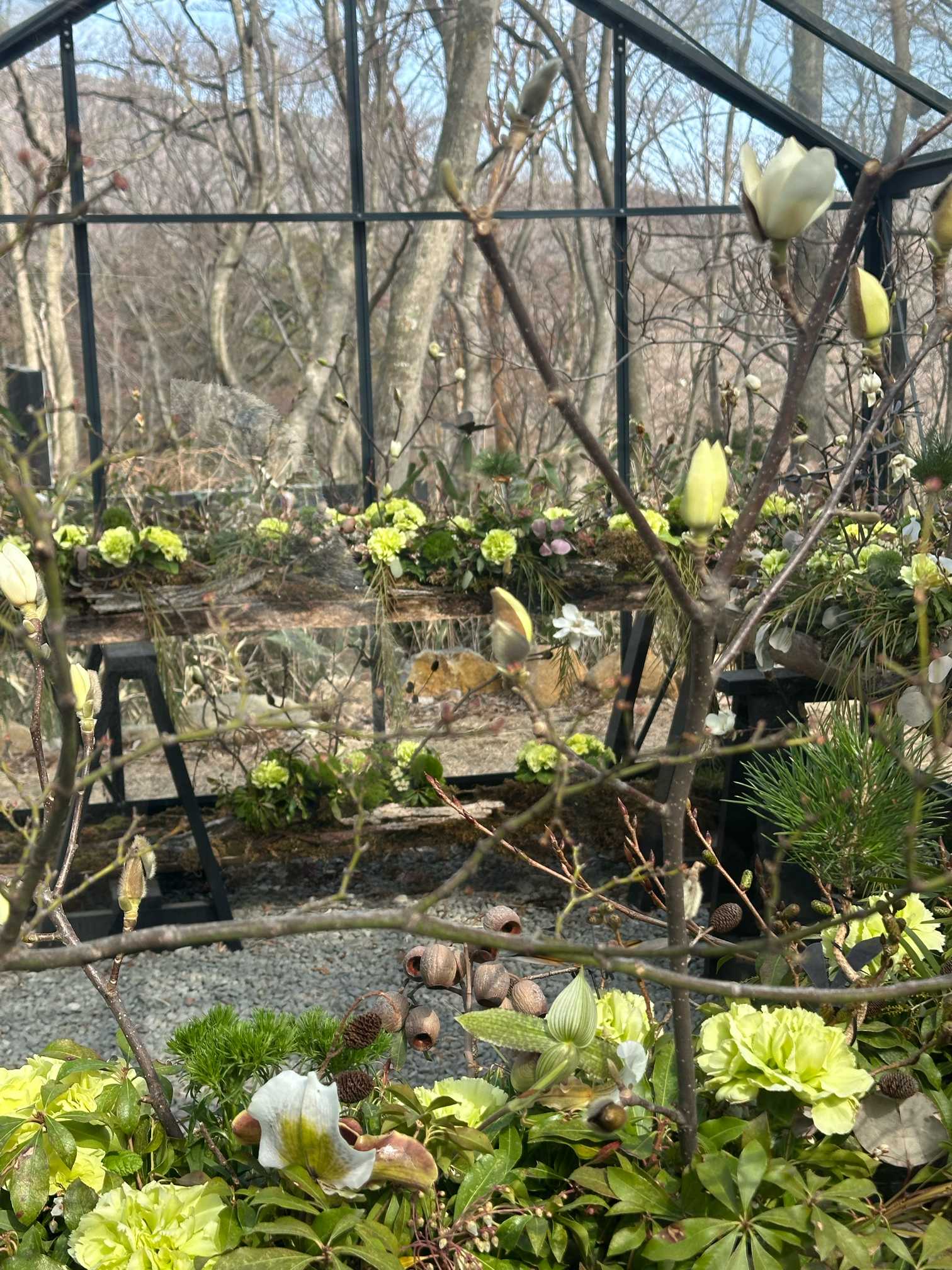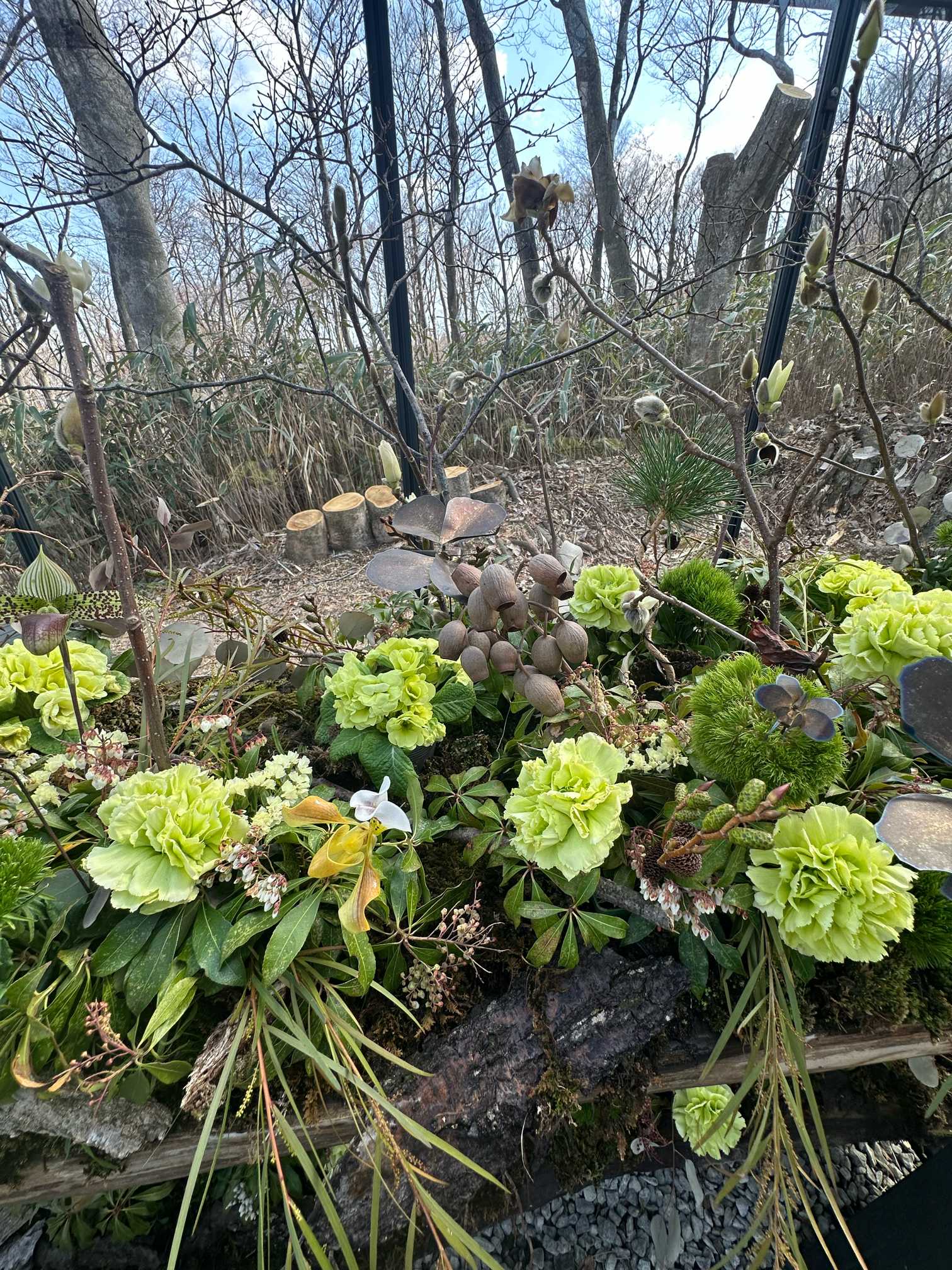 流木、ハイゴケにグリーンのカーネーション、ナデシコ科のテマリソウ、ハクモクレン、ポポラスを挿してあります。