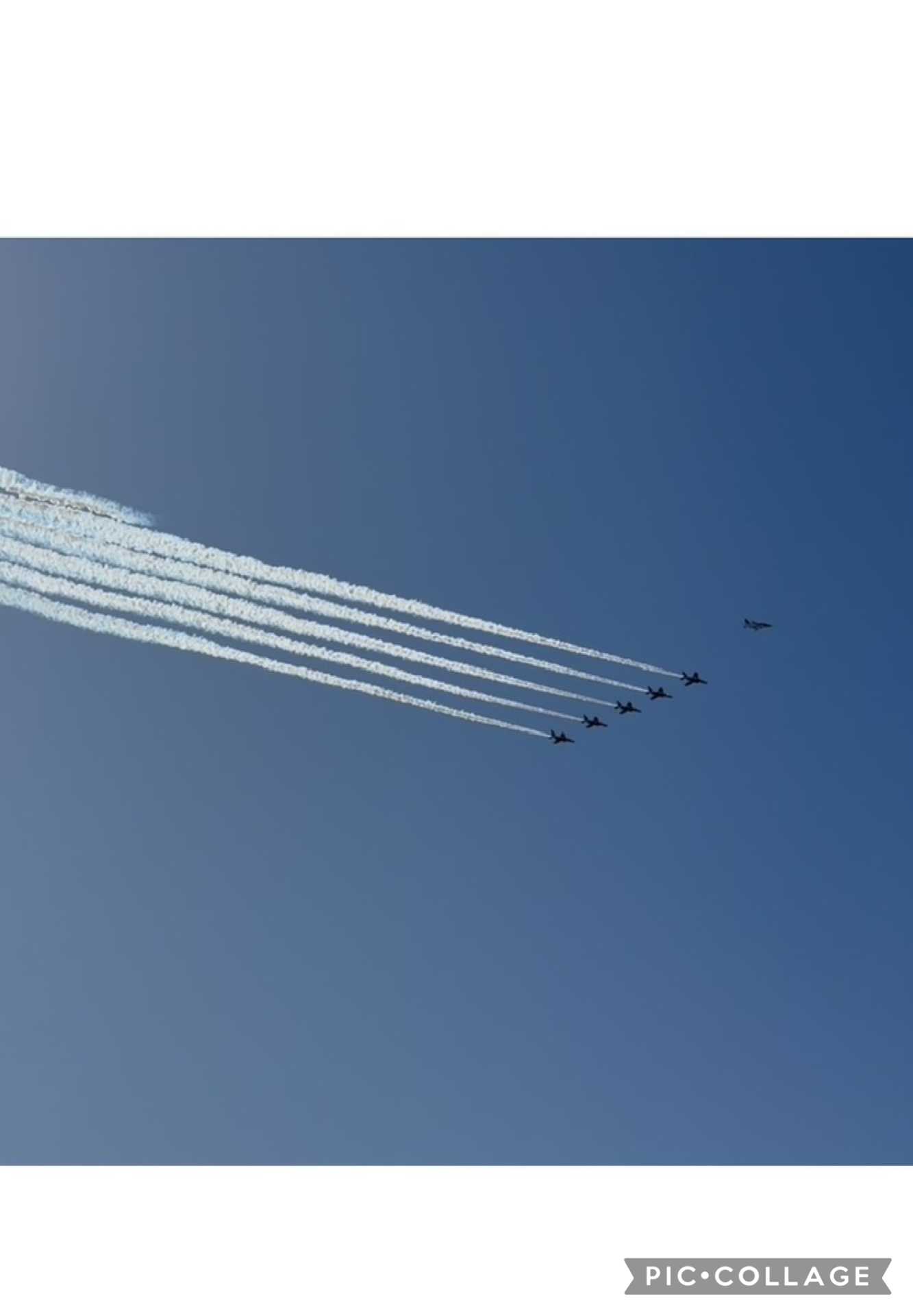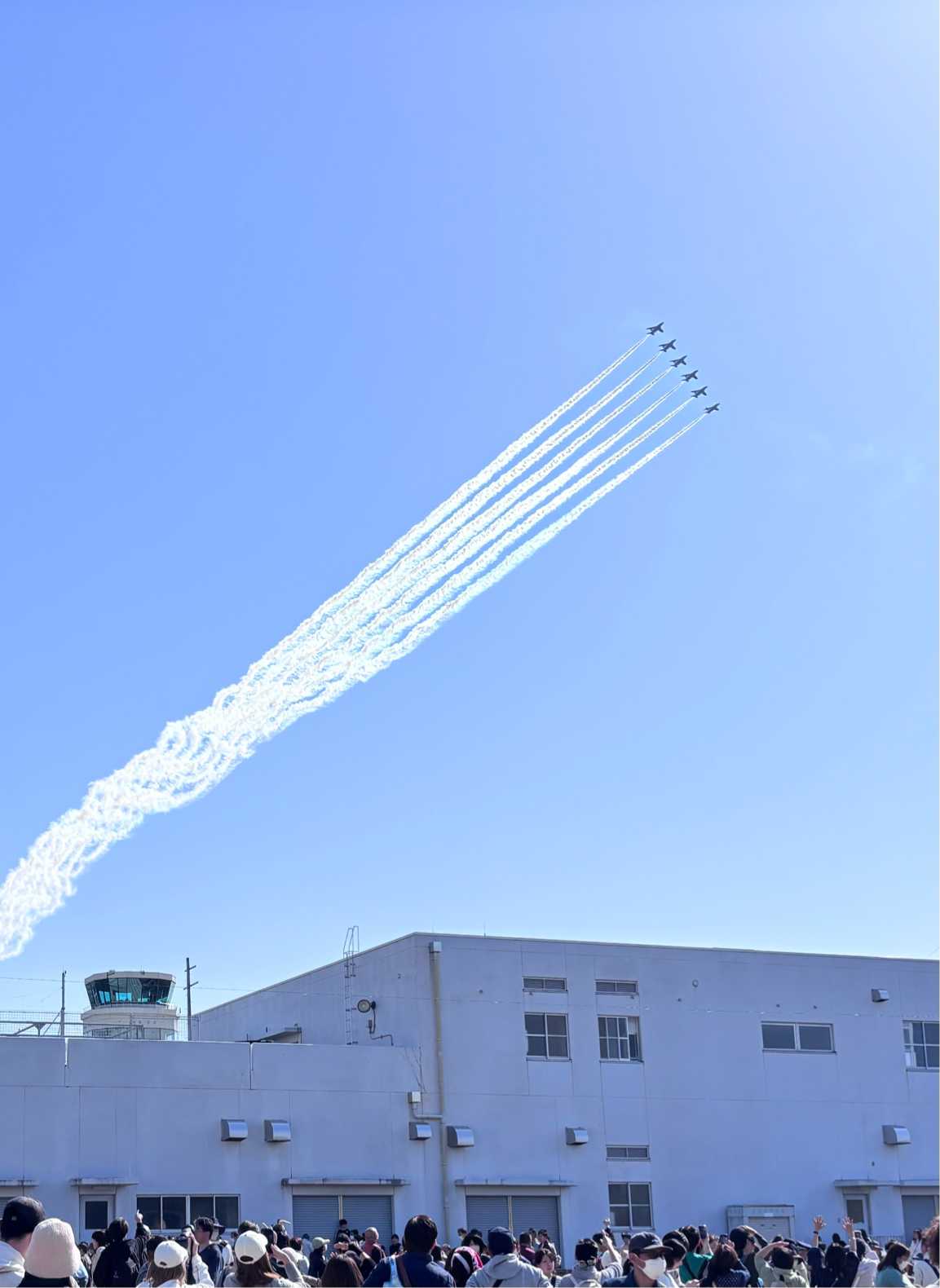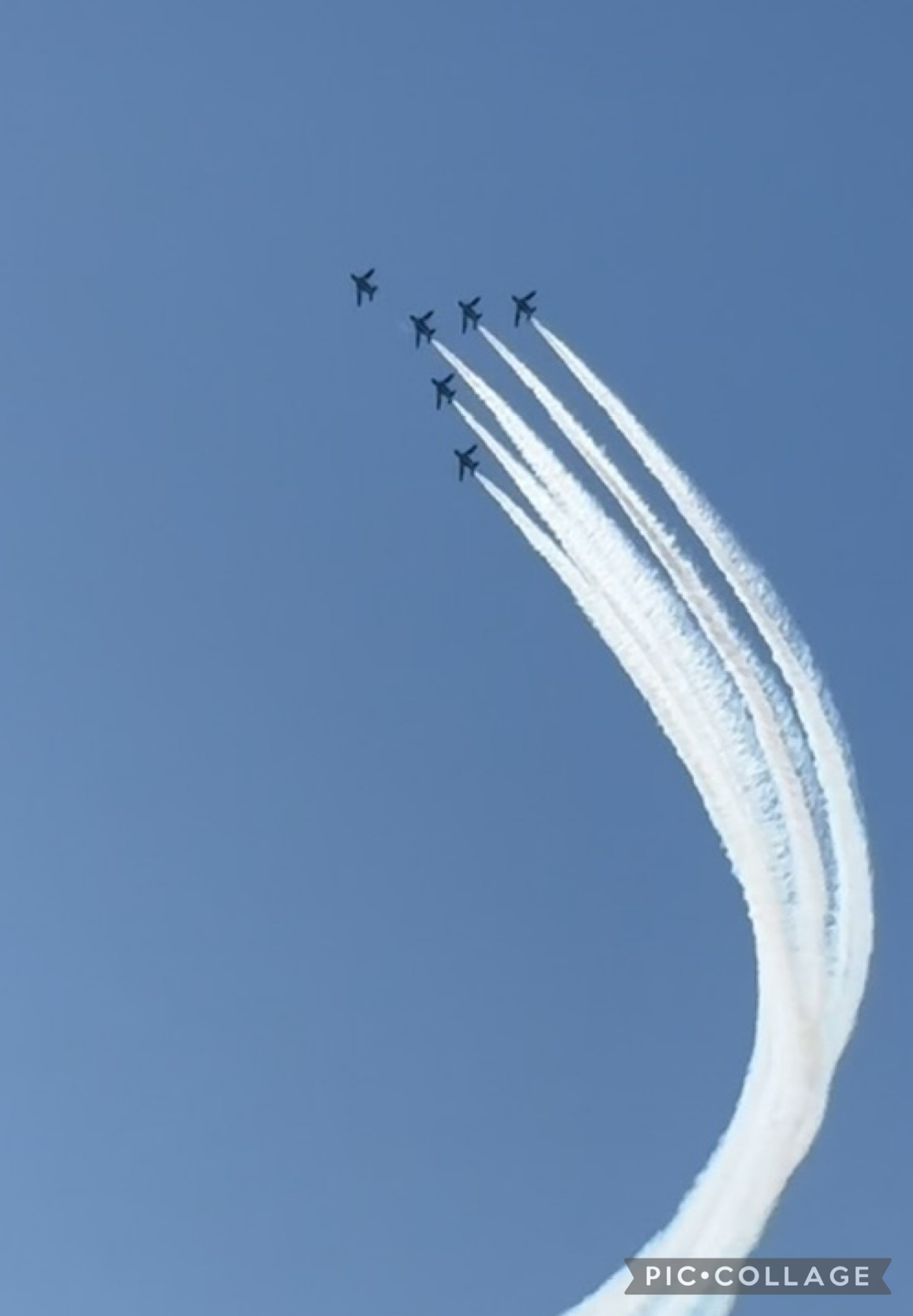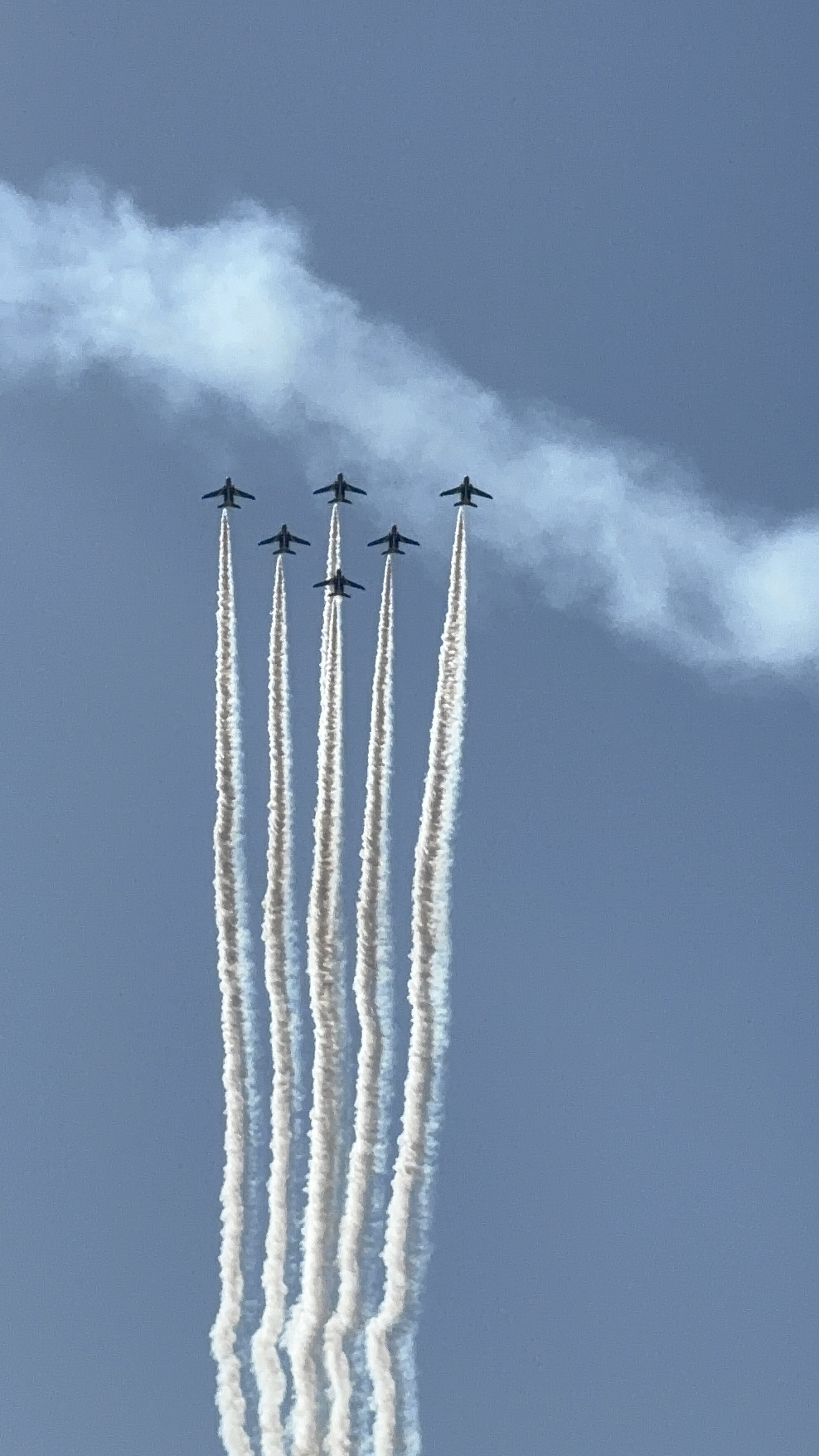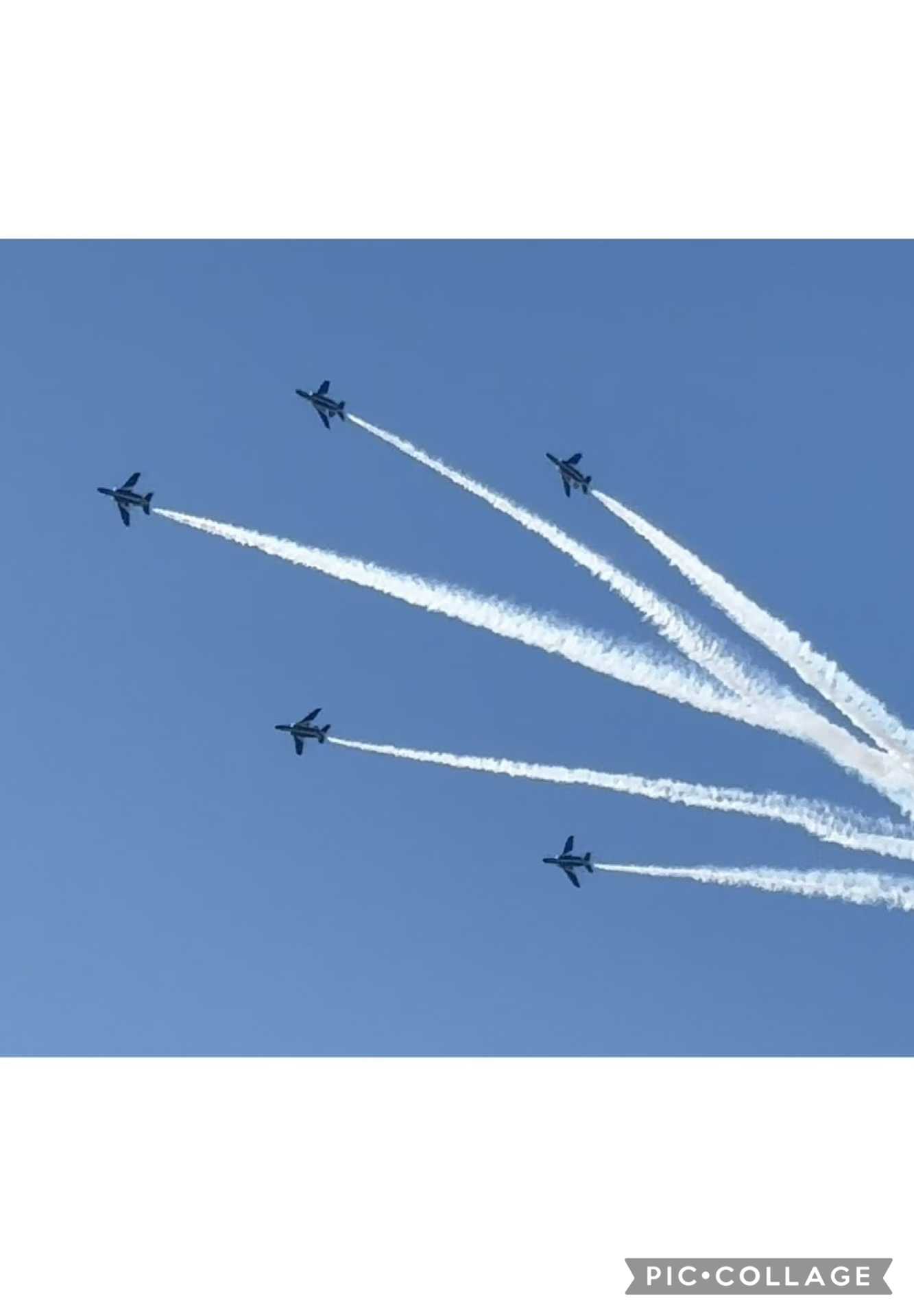 青い空にブルーインパルス🛩️、白い煙の筋もクッキリと。カッコいい😍しかありません。