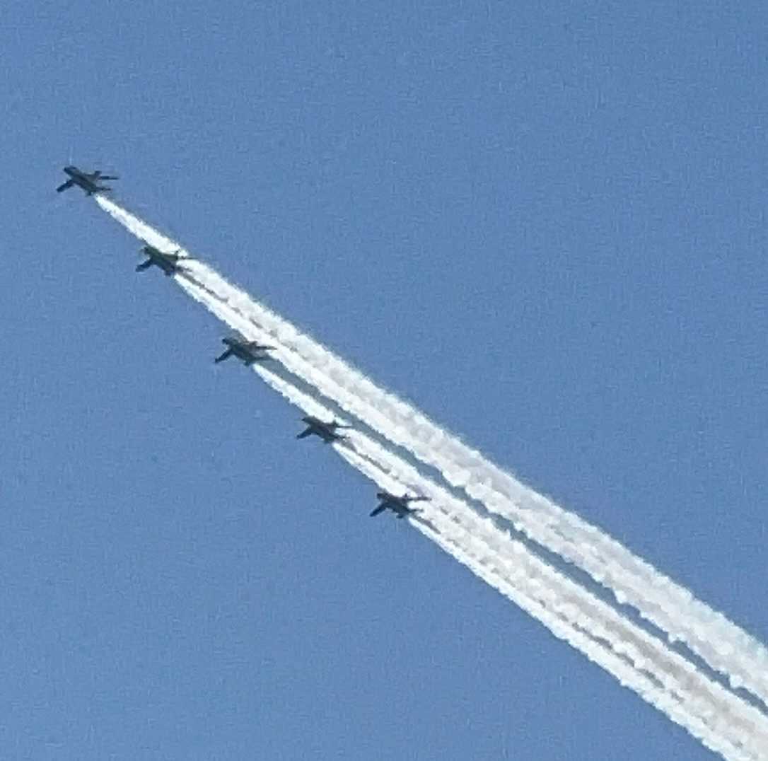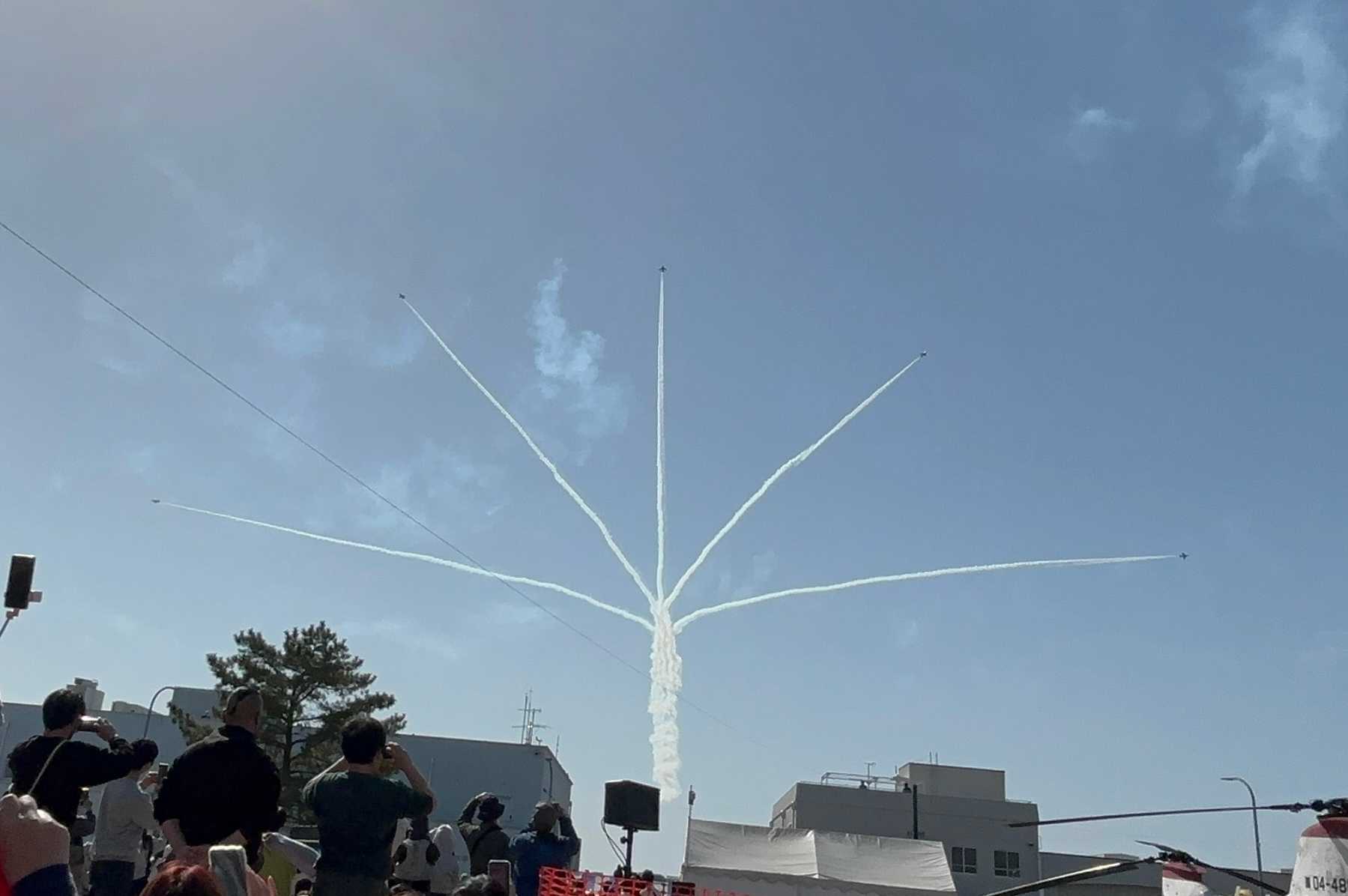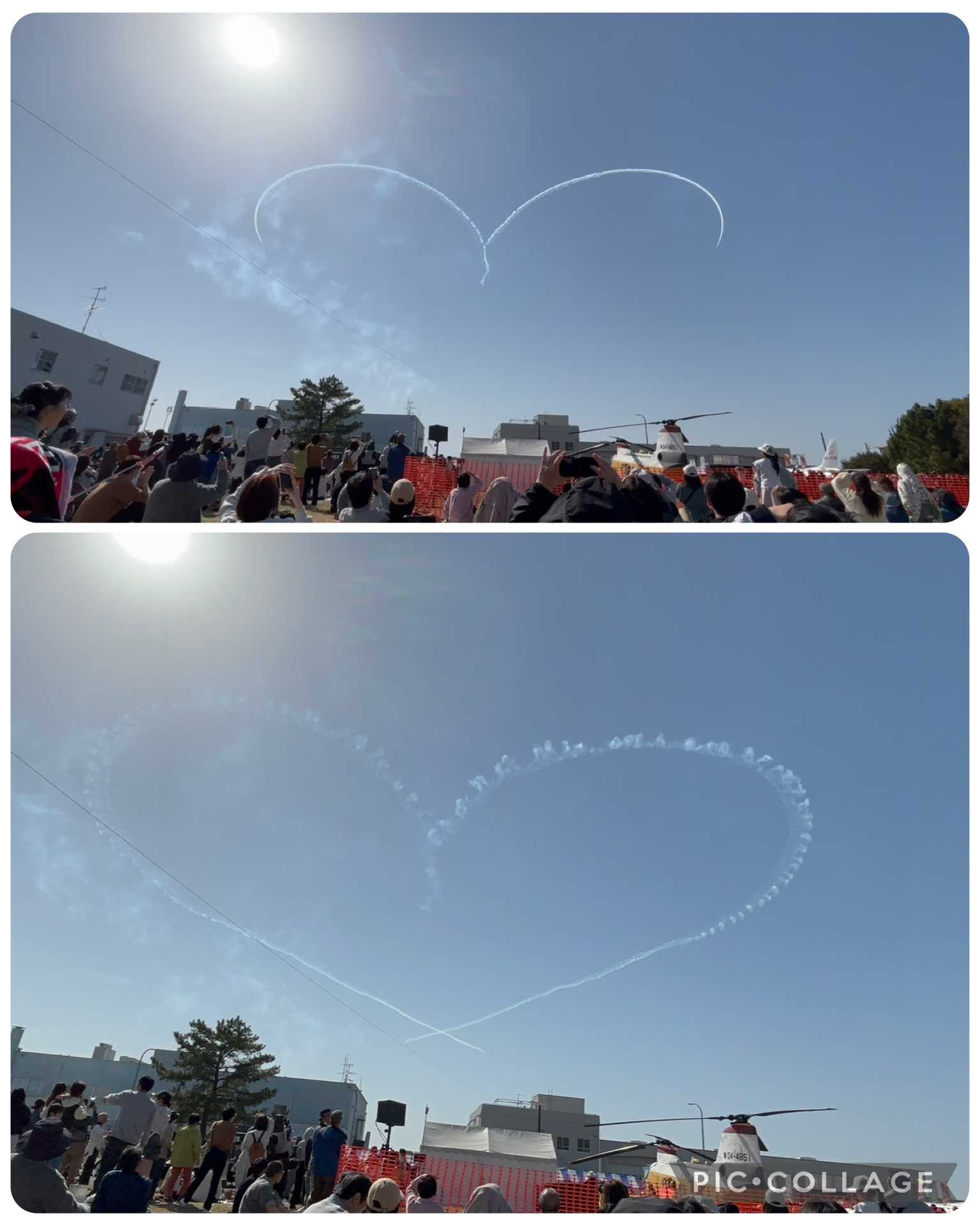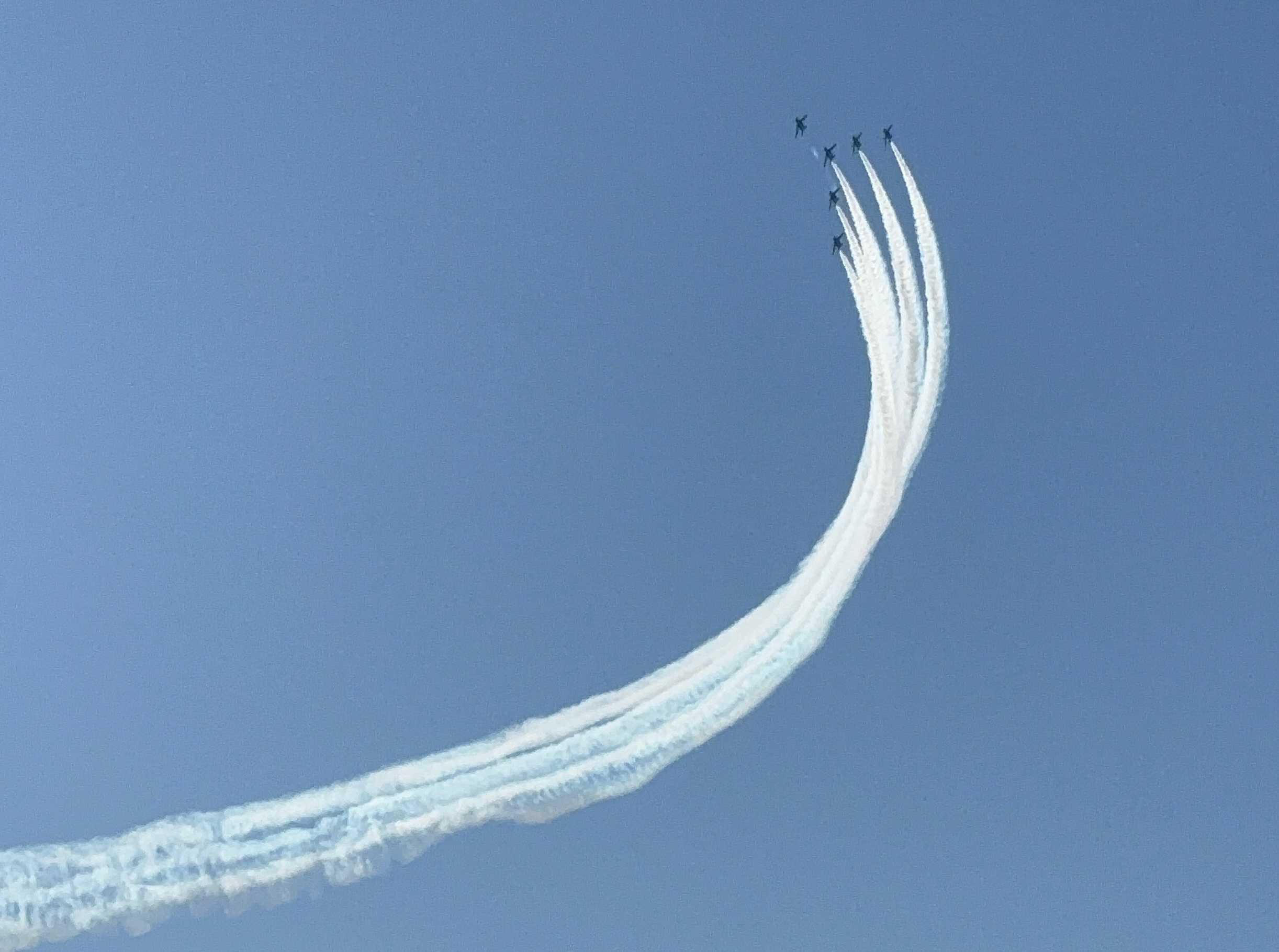 青い空にブルーインパルス🛩️、白い煙の筋もクッキリと。カッコいい😍しかありません。