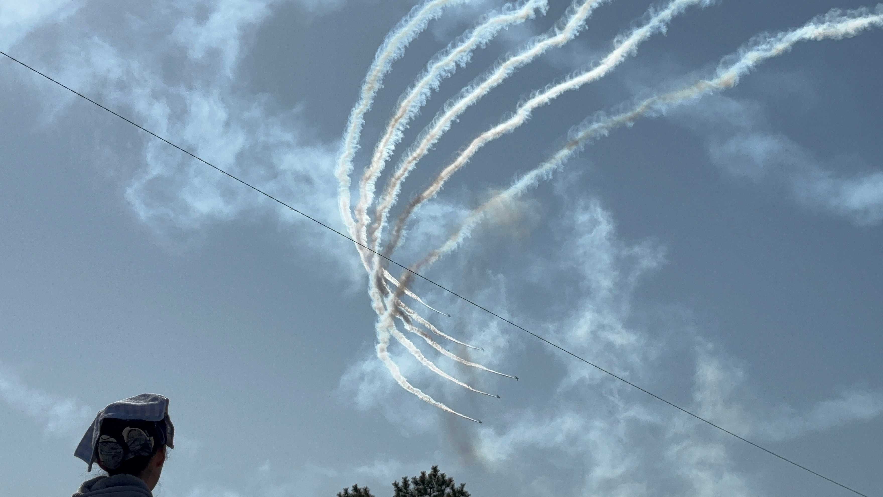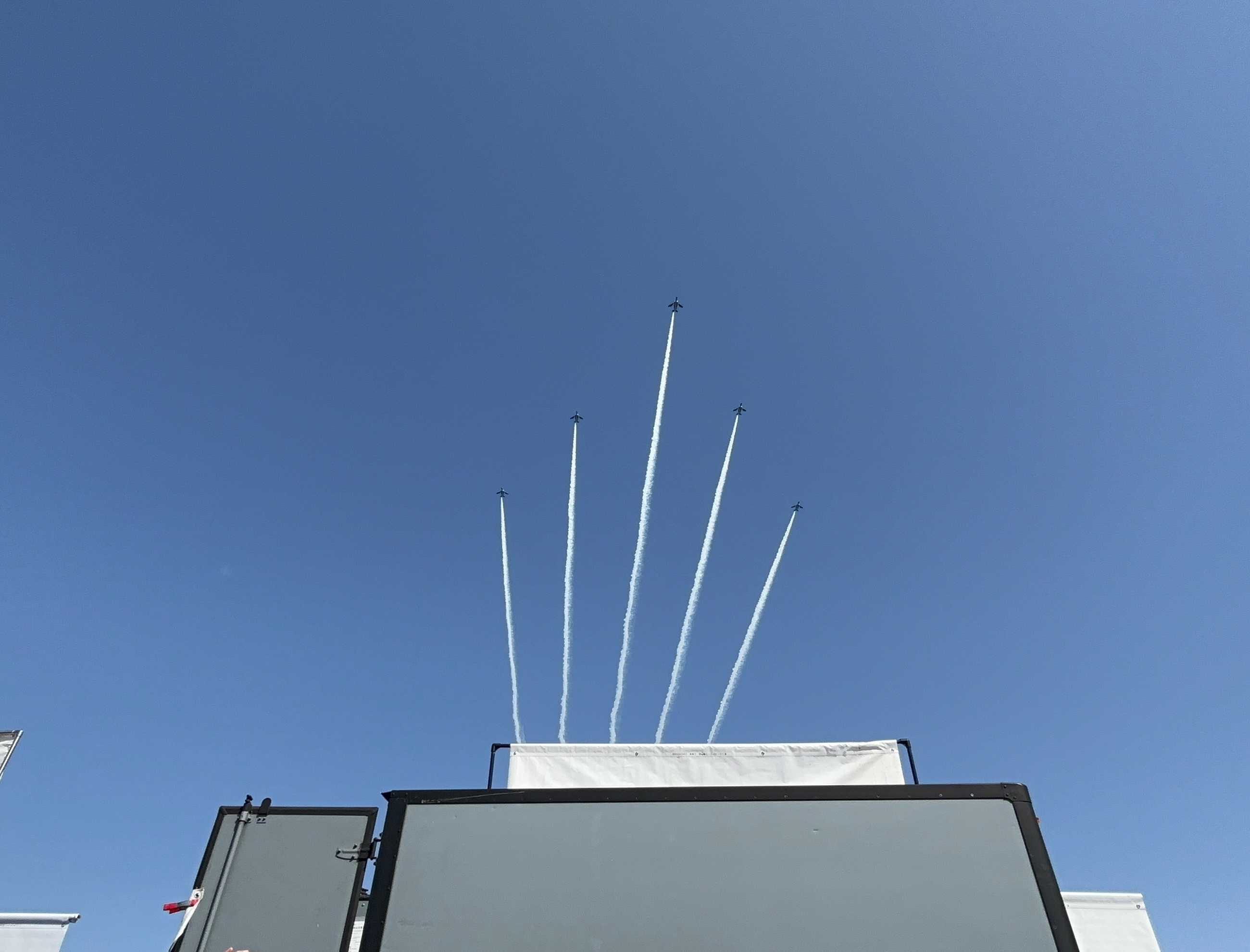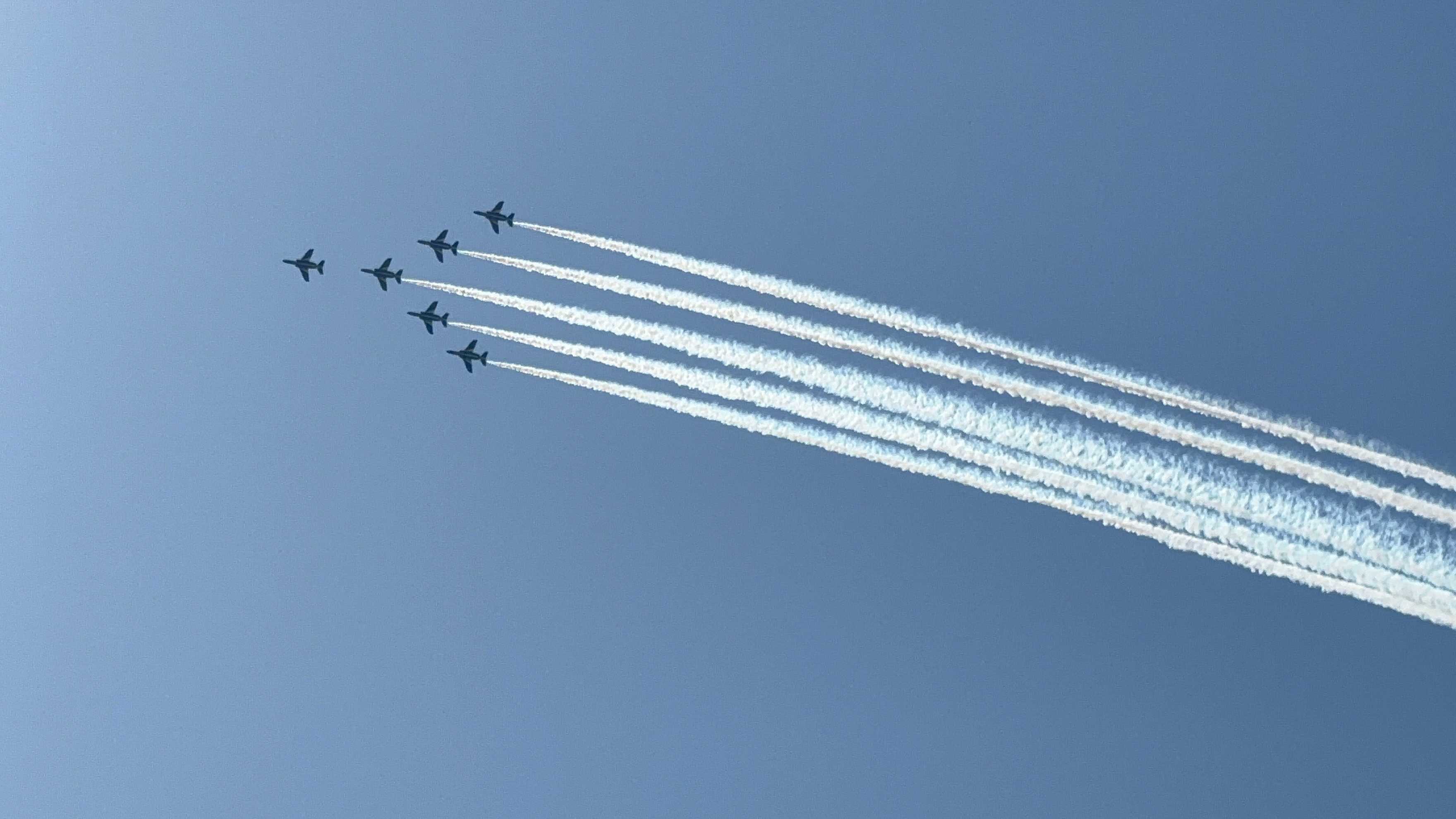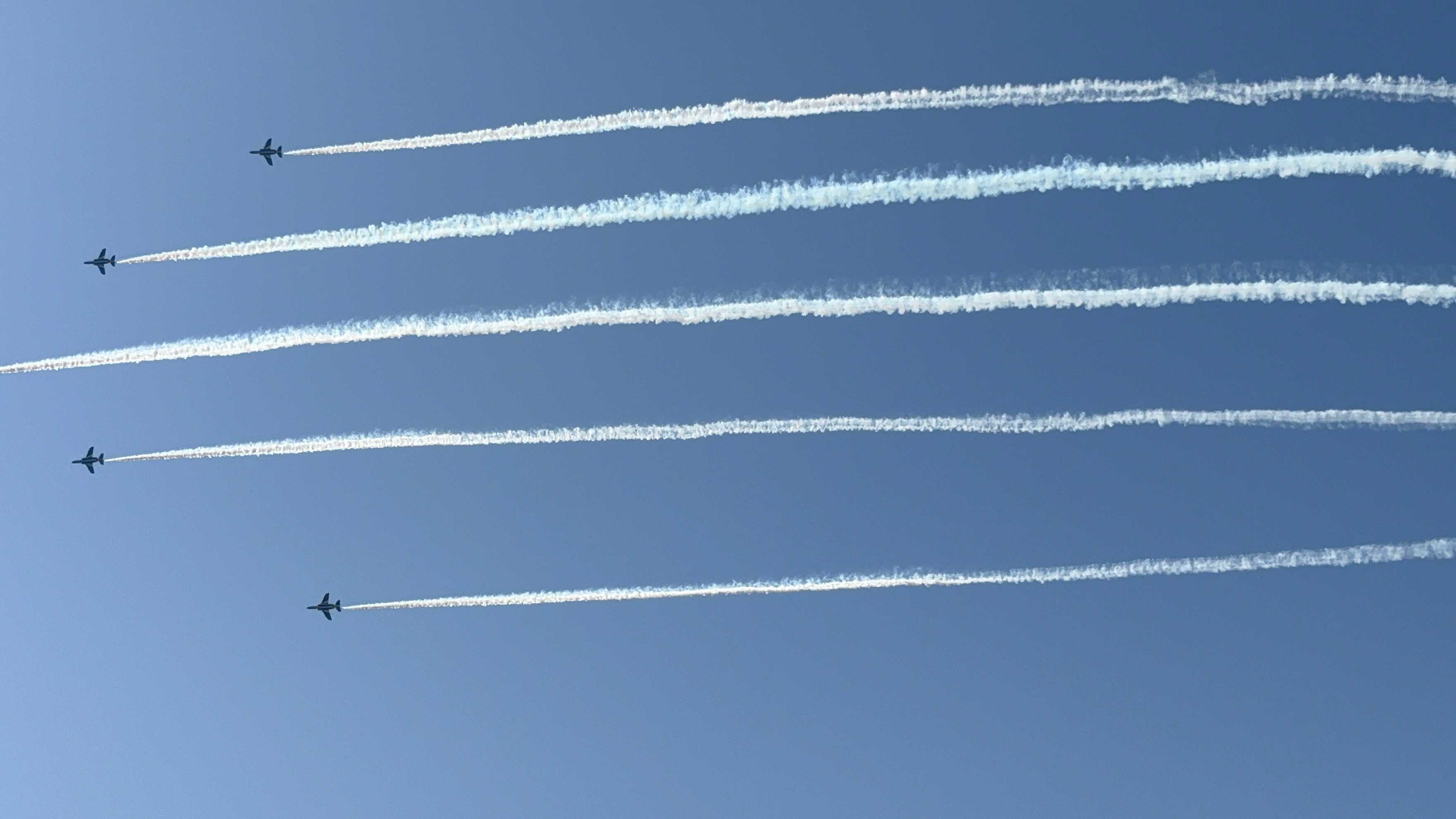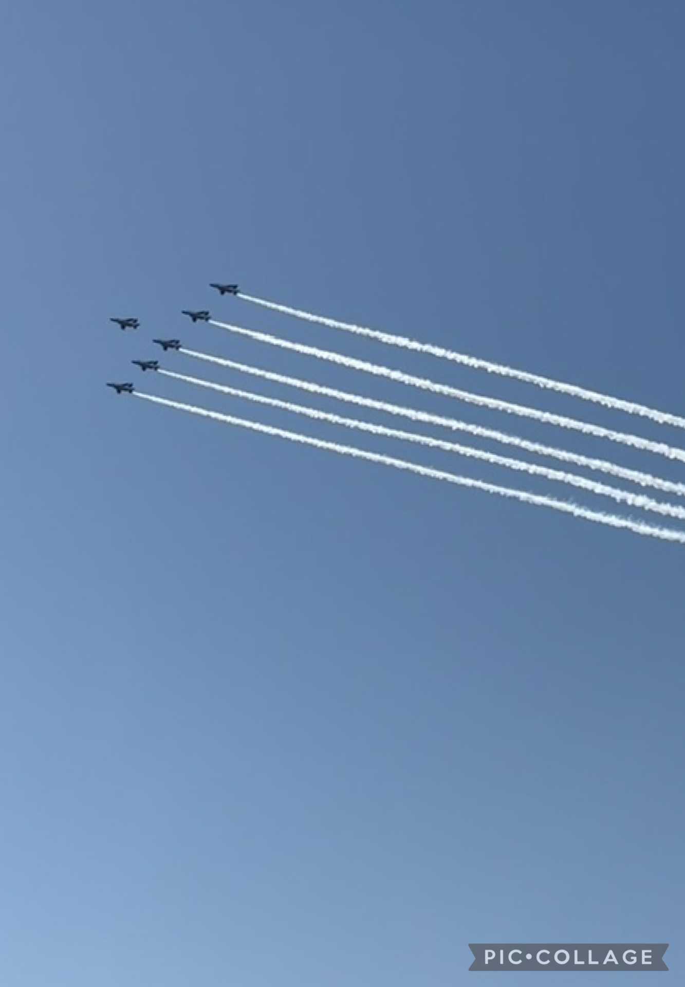 青い空にブルーインパルス🛩️、白い煙の筋もクッキリと。カッコいい😍しかありません。