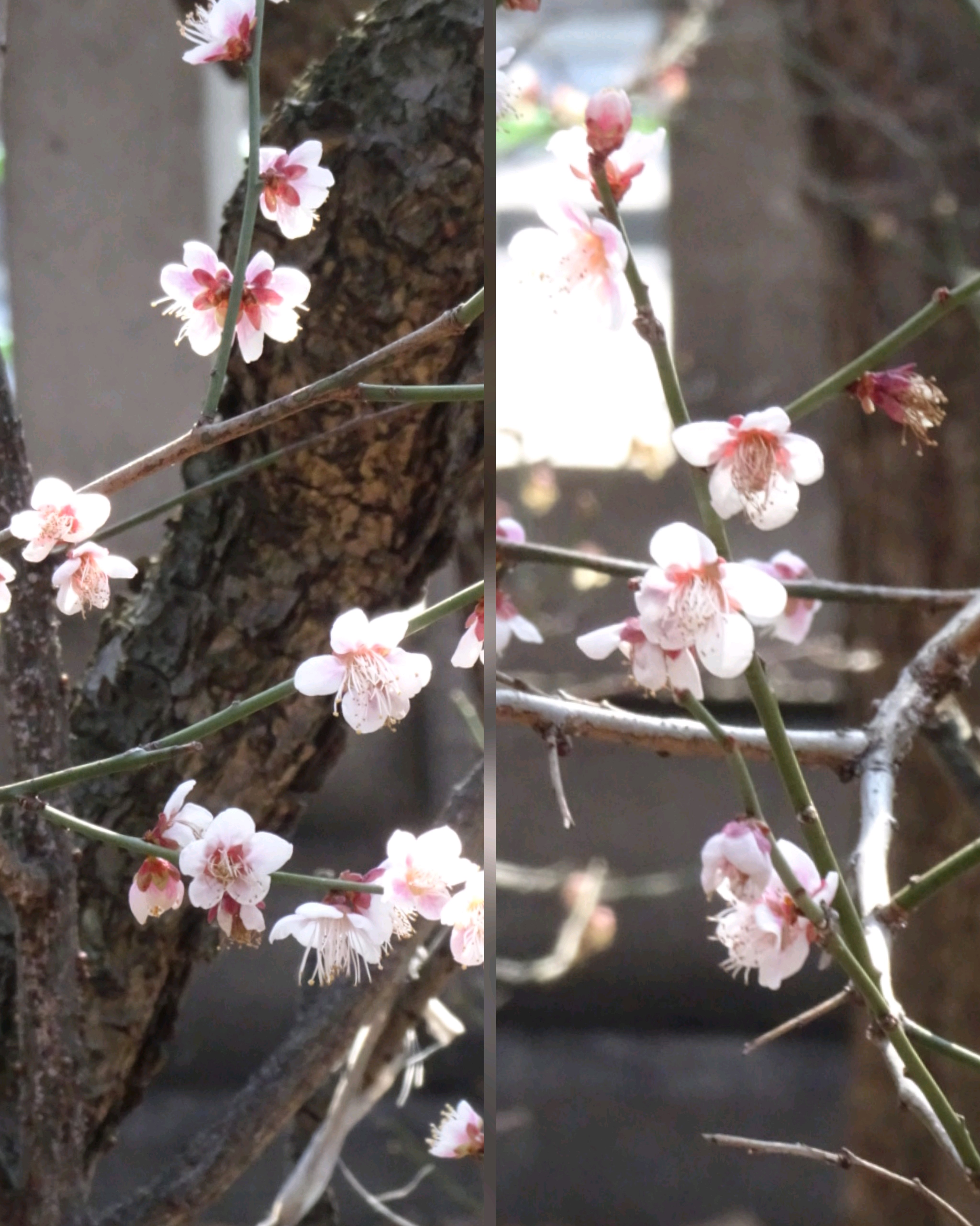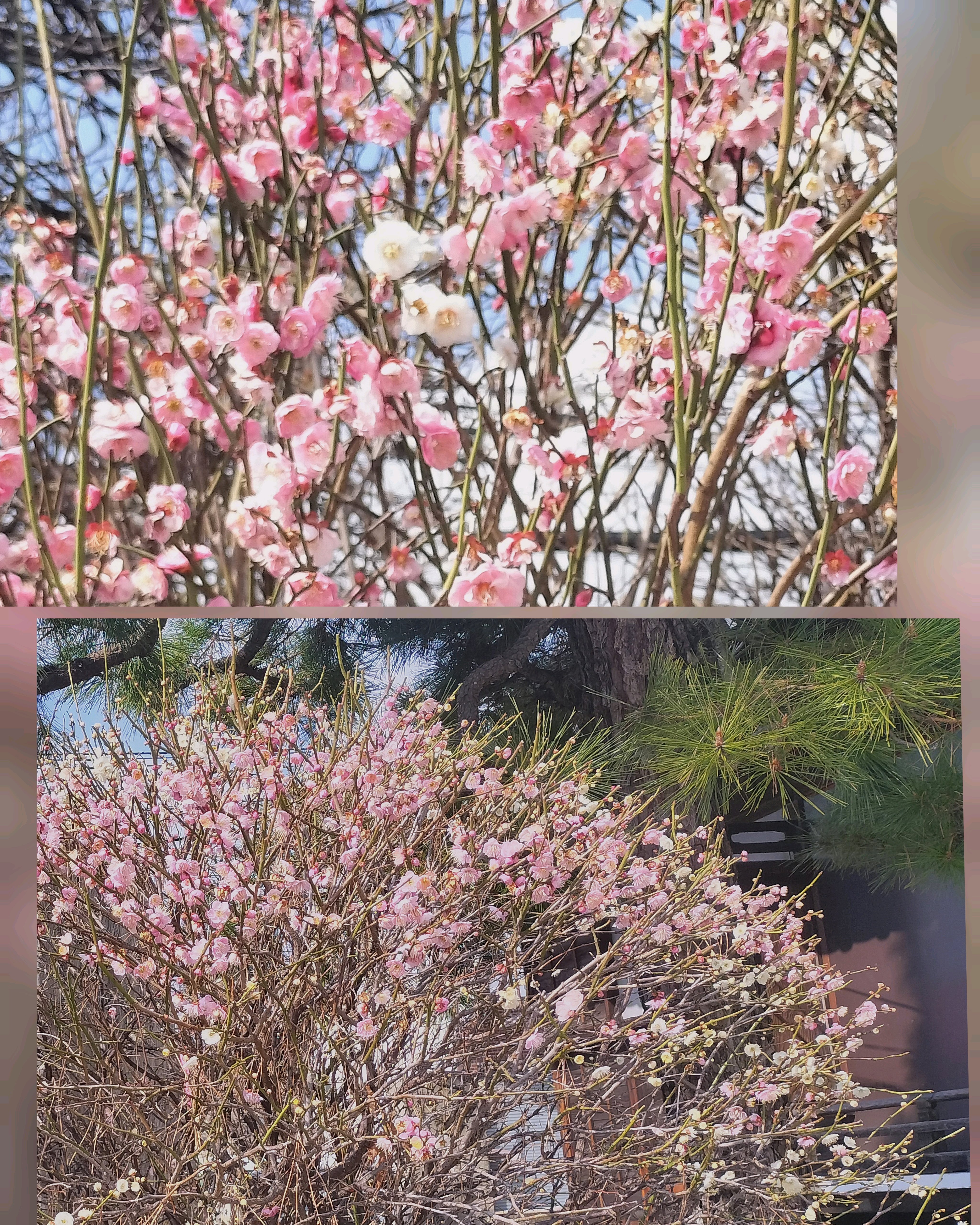 咲き始めはある程度の期間ピンク色で、咲き進むと白梅になります